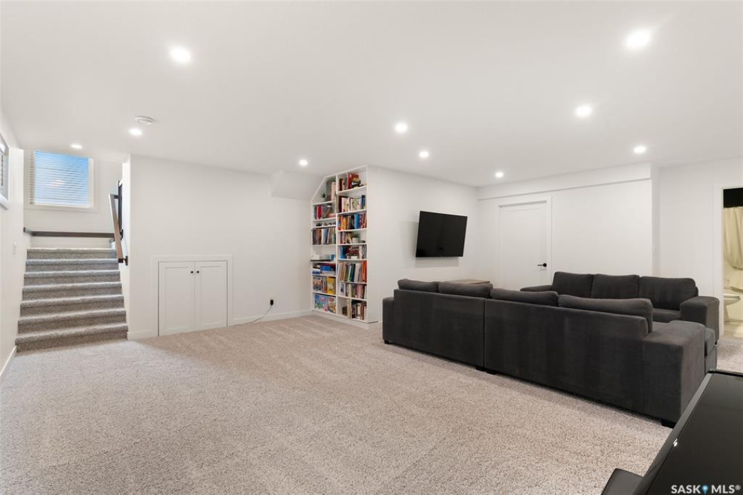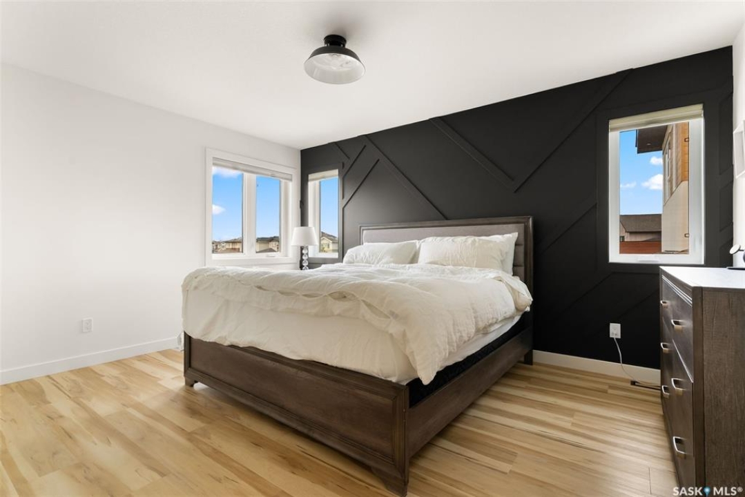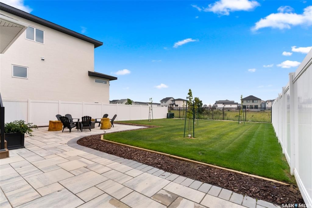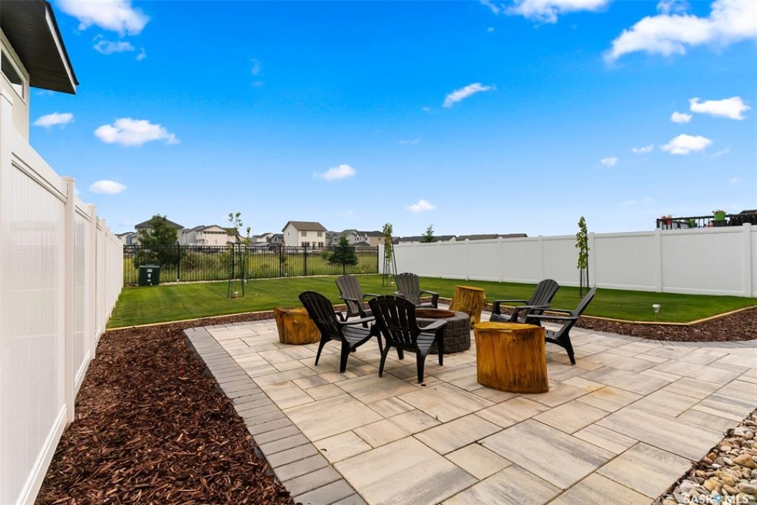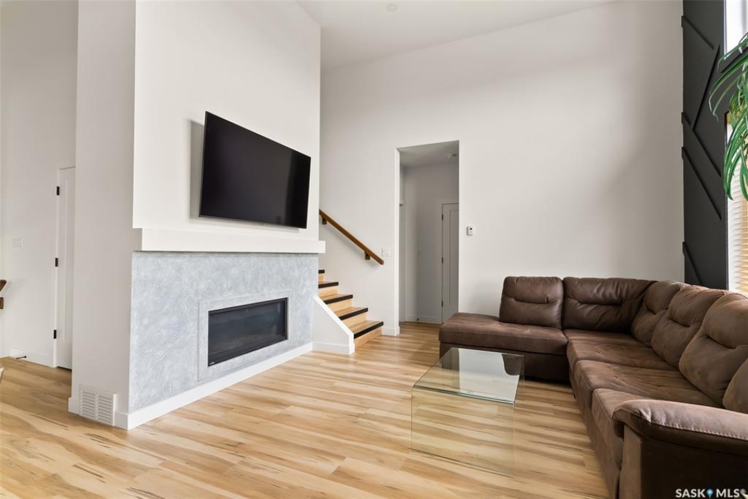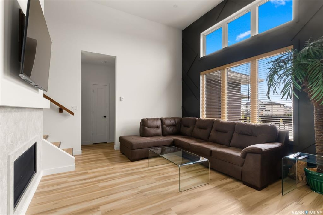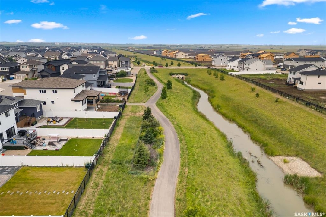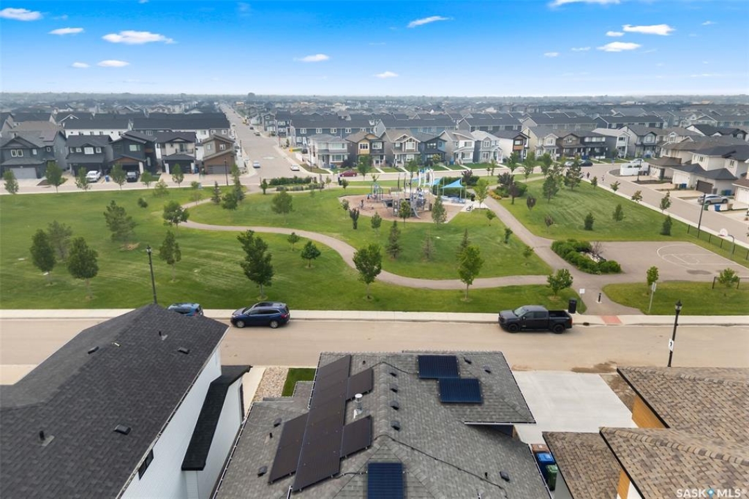 It's not every day you find a home that backs green space and fronts a park — but this one does! Located on a quiet cul-de-sac across from the Crosbie “Pirate” Park, this custom-built bi-level has no backyard neighbours and incredible curb appeal. The dark acrylic stucco, stone accents, and covered front entry create a welcoming first impression. Step inside to the spacious foyer with direct access to your heated double garage. The open-concept main floor feels bright and inviting. The two-toned kitchen features tall cabinets, quartz countertops, stainless steel appliances, and a walk-in pantry for extra storage. The living room has impressive high ceilings and a wall of windows that let the light pour in. Gather around the cozy gas fireplace or enjoy dinner with a view from the dining area that leads to your back deck and yard. Two bedrooms, a 4-piece bath, and laundry are conveniently located on this level. Upstairs, the private primary suite is your retreat with a large walk-in closet, dual vanities, and a beautiful ensuite. The fully finished basement offers plenty of space to relax or entertain with a family room, games area, and a built-in bookshelf for books or décor. The fun under-stair nook makes a great kids' hideaway, and the fourth bedroom is perfect for guests, teens, or a home office. A full bathroom completes the lower level. Outside, enjoy your partially covered composite deck with storage underneath, a fully fenced yard, and a firepit for cozy evenings. The solar panels are so efficient that you'll only pay SaskPower's minimum monthly fee. With schools and Starbucks just a short walk away, this home truly has it all — location, style, and a touch of everyday magic.