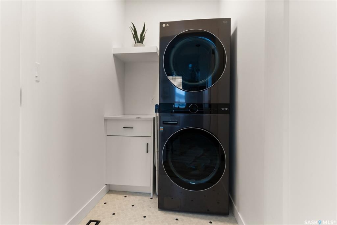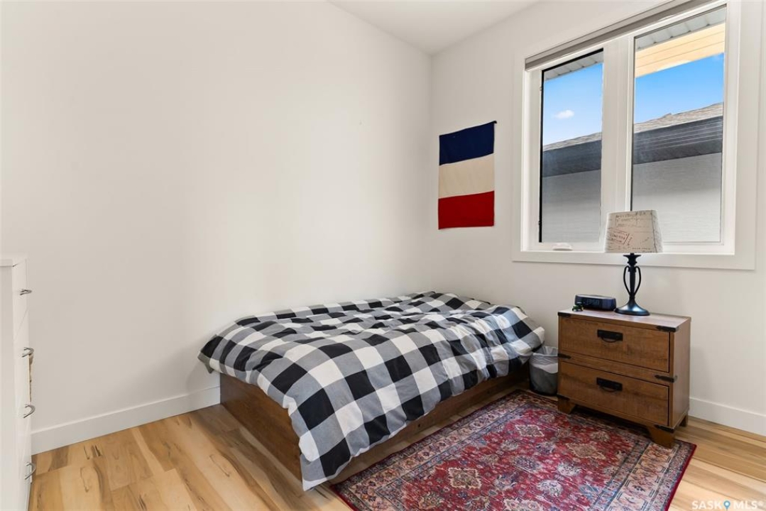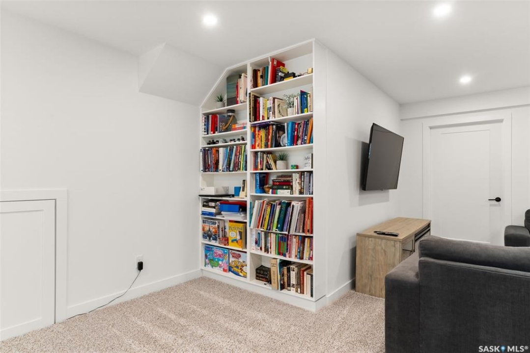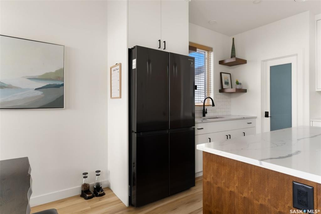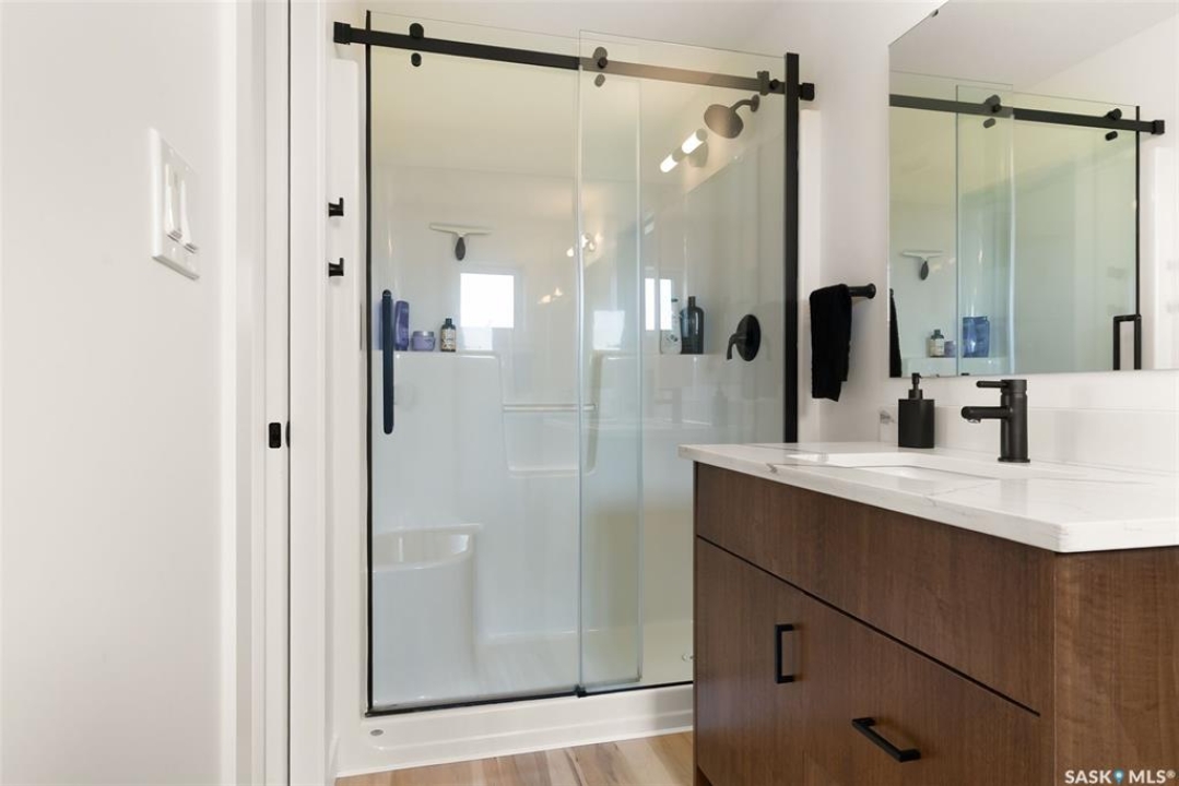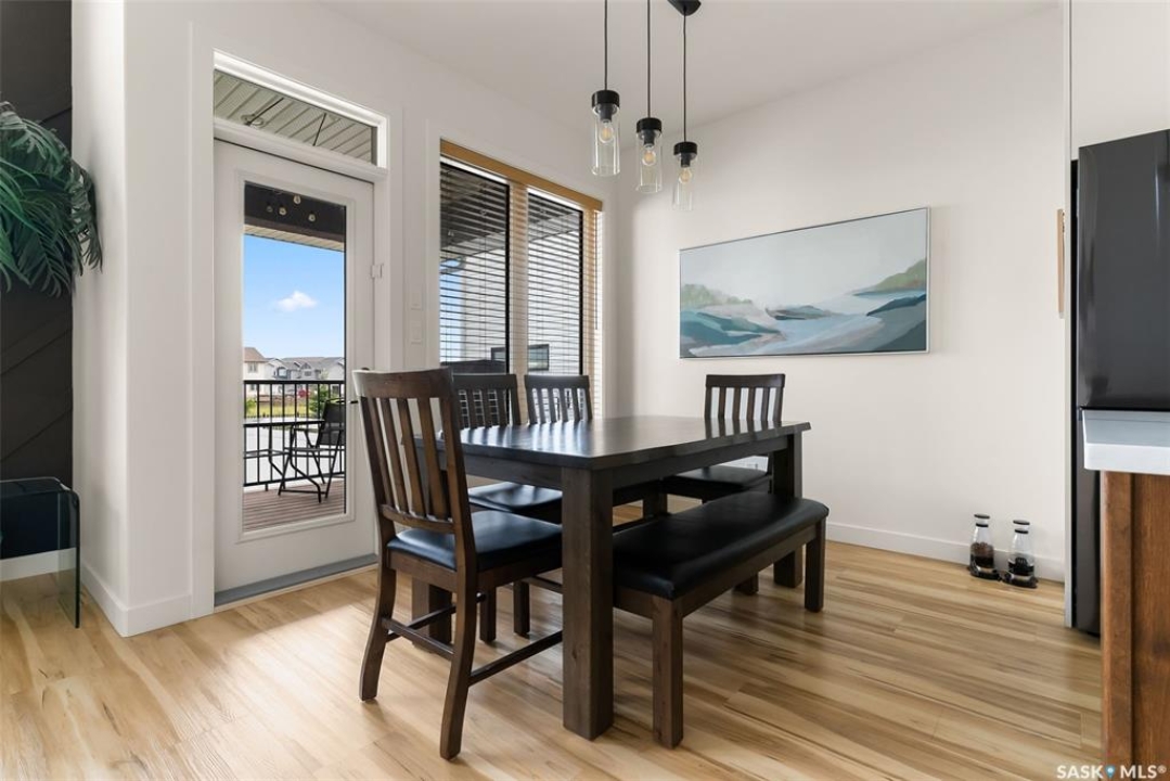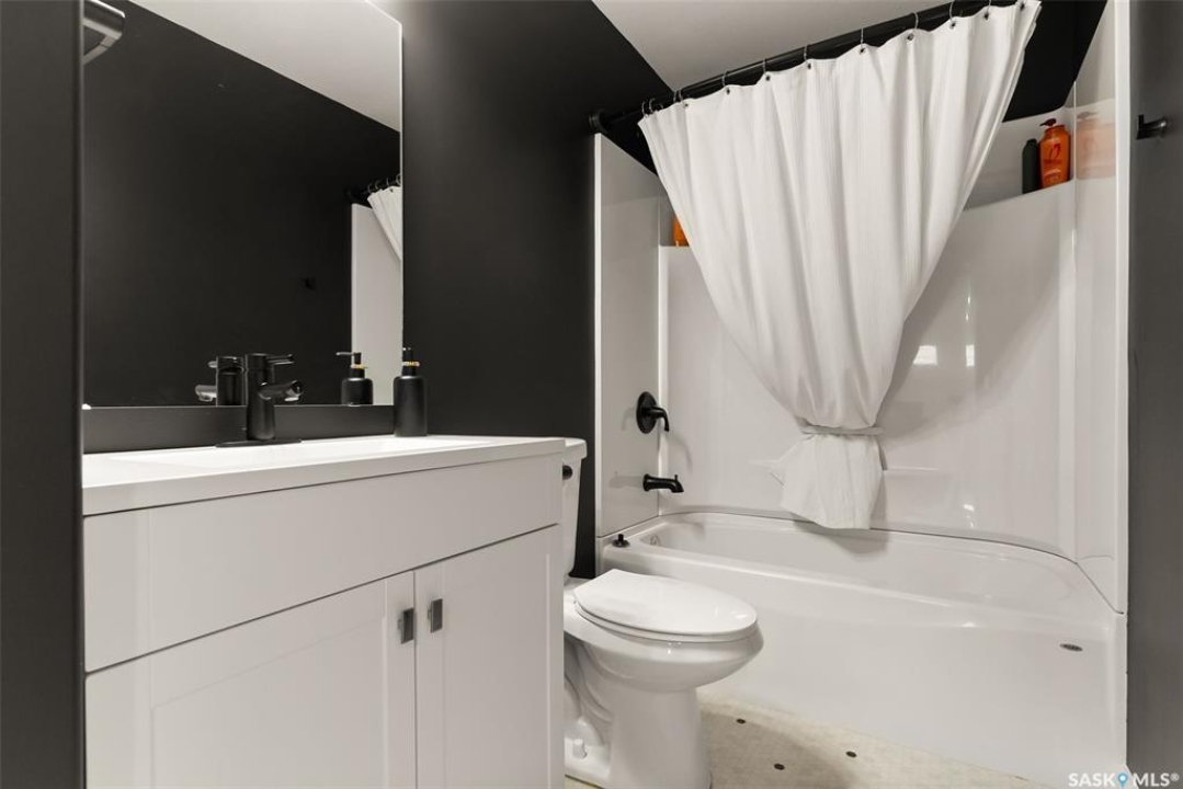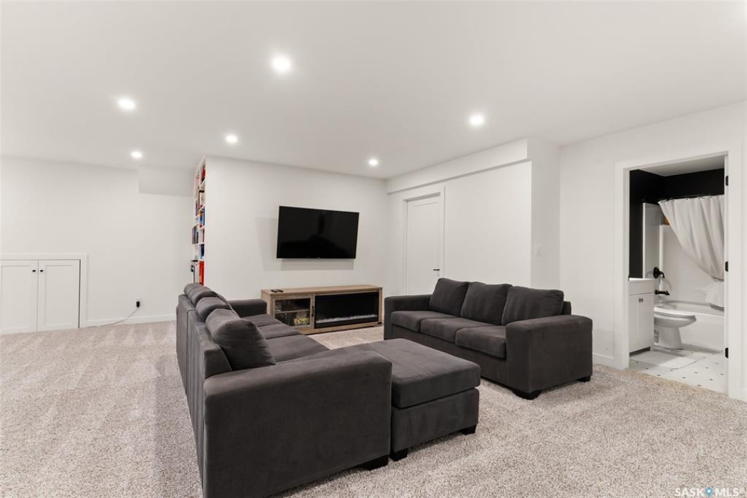 It's not every day you find a home that backs green space and fronts a park — but this one does! Located on a quiet cul-de-sac across from the Crosbie “Pirate” Park, this custom-built bi-level has no backyard neighbours and incredible curb appeal. The dark acrylic stucco, stone accents, and covered front entry create a welcoming first impression. Step inside to the spacious foyer with direct access to your heated double garage. The open-concept main floor feels bright and inviting. The two-toned kitchen features tall cabinets, quartz countertops, stainless steel appliances, and a walk-in pantry for extra storage. The living room has impressive high ceilings and a wall of windows that let the light pour in. Gather around the cozy gas fireplace or enjoy dinner with a view from the dining area that leads to your back deck and yard. Two bedrooms, a 4-piece bath, and laundry are conveniently located on this level. Upstairs, the private primary suite is your retreat with a large walk-in closet, dual vanities, and a beautiful ensuite. The fully finished basement offers plenty of space to relax or entertain with a family room, games area, and a built-in bookshelf for books or décor. The fun under-stair nook makes a great kids' hideaway, and the fourth bedroom is perfect for guests, teens, or a home office. A full bathroom completes the lower level. Outside, enjoy your partially covered composite deck with storage underneath, a fully fenced yard, and a firepit for cozy evenings. The solar panels are so efficient that you'll only pay SaskPower's minimum monthly fee. With schools and Starbucks just a short walk away, this home truly has it all — location, style, and a touch of everyday magic.