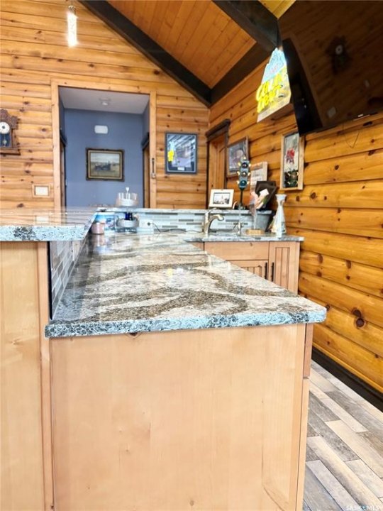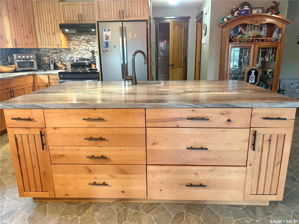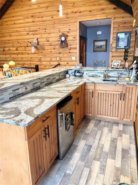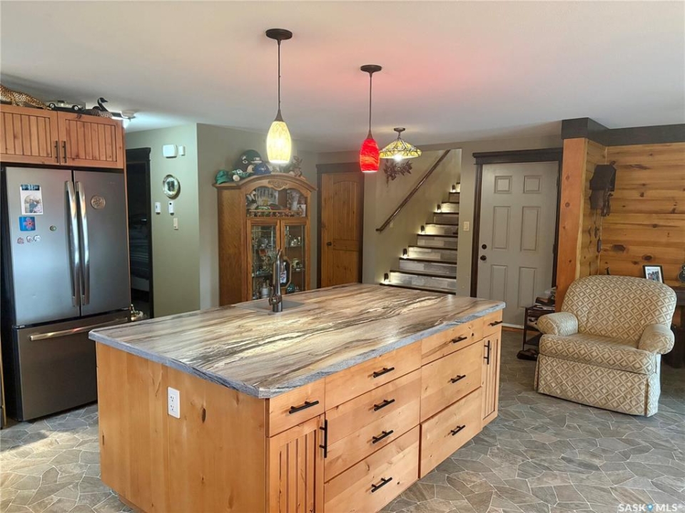 Welcome to 964 Whitesand Avenue at Burgis Beach, a stunning four-season home designed for comfort, entertaining, and lakeside living. Originally built in 2008 with a major addition in 2015, only steps away from the beach, this property offers a perfect mix of warmth, space, and functionality. Inside, you'll find in-floor heat, a forced-air propane furnace, and even a generator for peace of mind. The great room is a showstopper, featuring a natural wood-burning fireplace and a wet bar, the perfect setup for watching the game or hosting friends. Upstairs, there are two bedrooms and a luxurious 5-piece bathroom with a jet tub and tiled shower, plus a private patio overlooking the lake. The main floor offers plenty of space to gather, including a bright sunroom, a spacious kitchen with a large island and ample counter space, a 4-piece bathroom, a bedroom, and a convenient laundry area. The impressive L-shaped garage (35.5' x 24.3' with an extra 18.7' x 13.1' bay) features heated floors, a 3-piece bathroom, and loads of storage — ideal for vehicles, toys, and tools. Outside, you'll find three sheds, including one large enough to park a side-by-side or snowmobiles. The yard also boasts a beautiful fire pit area with hardwired lights along the path. Whether you're looking for a year-round home or a retreat to relax and entertain, 964 Whitesand Avenue delivers comfort, quality, and lake life at its best. (LED lights under bar - in pictures shows red - but changeable to your favorite team colors)