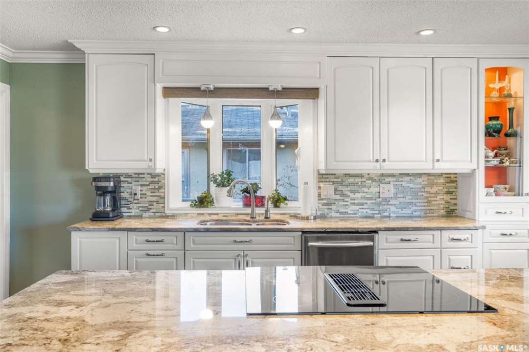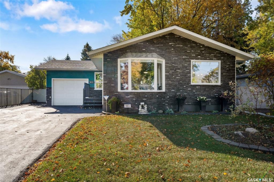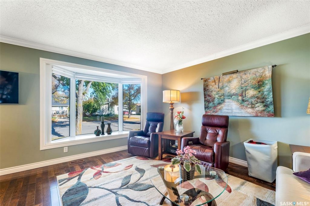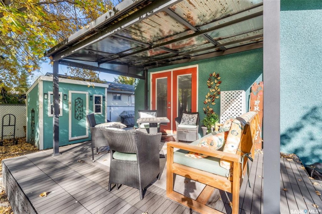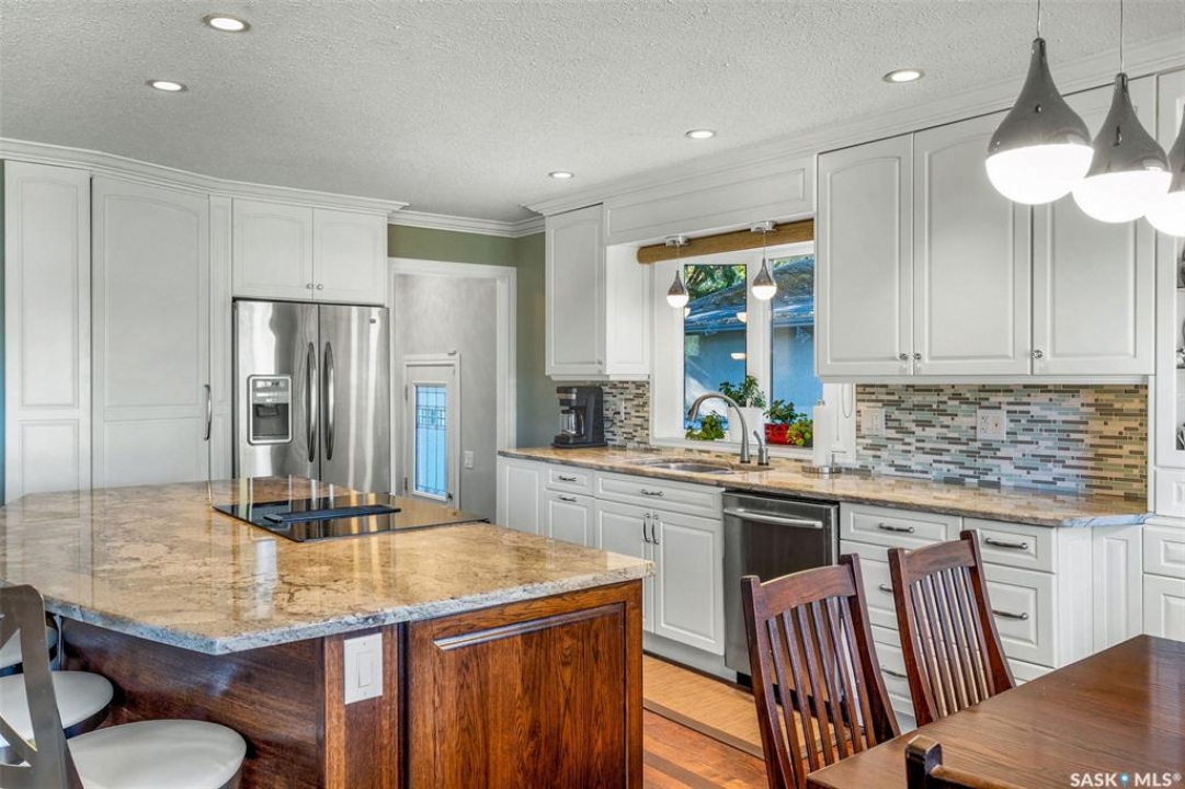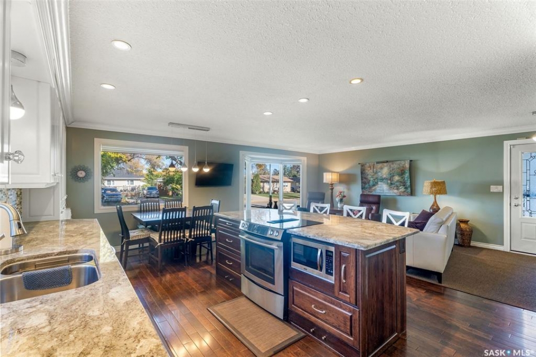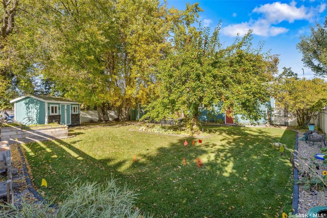 Remarkable 1,044 sqft bungalow located within walking distance to schools and parks! As you step inside you are greeted by gleaming dark oak hardwood flooring that flows throughout the main living areas and an open concept layout that creates a warm and inviting atmosphere. The spacious living room features a large bay window that fills the space with natural light and connects seamlessly to the dining area and kitchen. The modern kitchen is both stylish and functional and offers stainless steel appliances, white cabinetry, a beautiful tile backsplash and an island with bar seating that brings family and friends together. The main floor also includes 2 comfortable bedrooms, a convenient laundry area with direct access to the back deck and a beautifully finished 3 piece bathroom featuring a stand up shower with striking tile surround. The fully finished basement provides an expansive family room centered around a cozy gas fireplace, a 3rd bedroom with a walk-in closet, a 4-piece bathroom that has a beautiful tub surround, utility room and plenty of storage space. Notable features and updates include central air conditioning, an energy efficient furnace (2017), hot water heater (2017) and shingles (2017). The exterior is just as impressive with a fully fenced and thoughtfully landscaped yard with mature trees, a large deck and patio, perfect for outdoor enjoyment. The property also includes 2 sheds with beautifully finished exteriors that provide both charm and additional storage, along with a partially insulated single attached garage and parking pad. Act now and make this your next home!