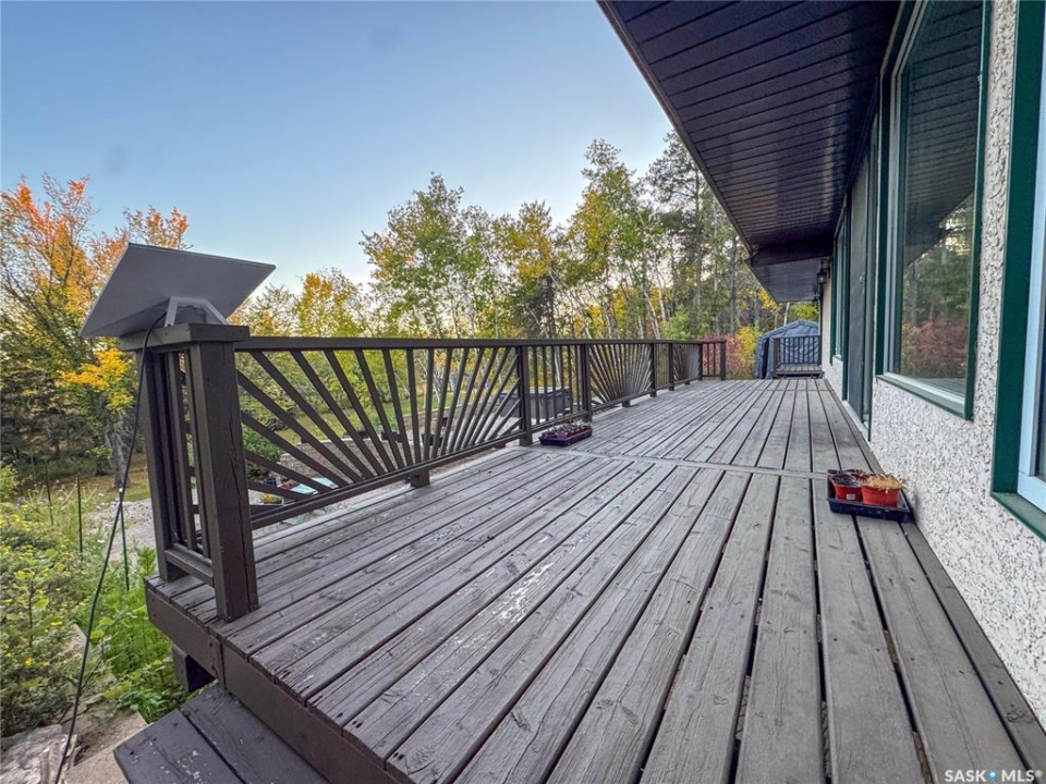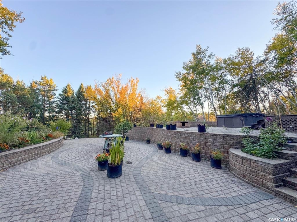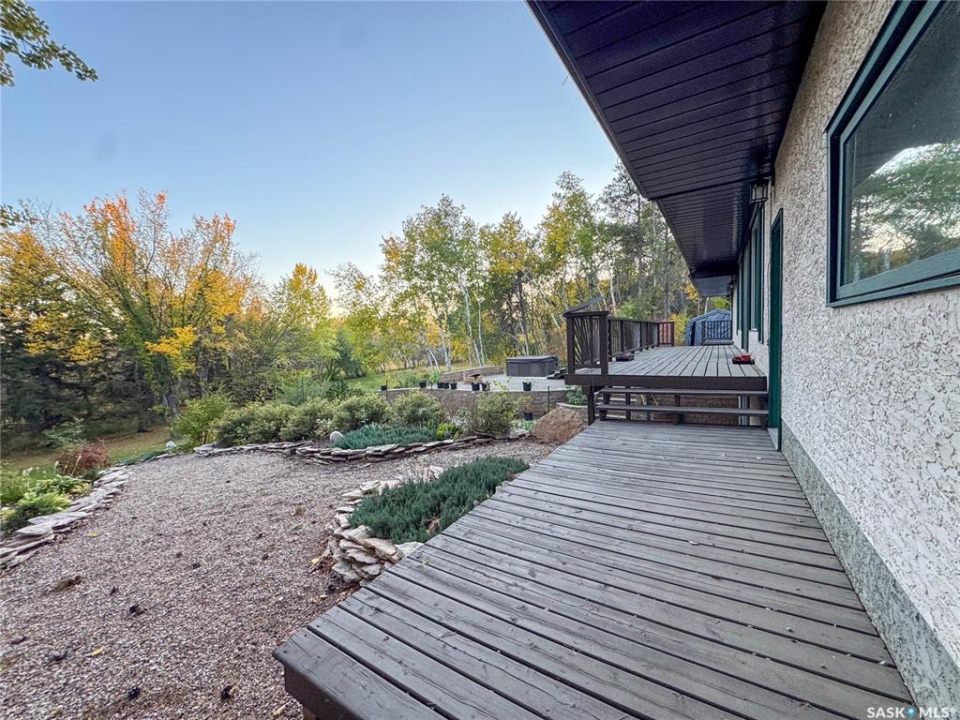 Immaculate 4 Bedroom + Den Acreage with Walkout Basement & Dream Garages only 5 Minutes from Prince Albert! This stunning and meticulously maintained 1,518 sq/ft bungalow offers the perfect blend of luxury, privacy, and convenience on a beautifully landscaped 2.47-acre lot. Built in 1994, this home features a spacious walkout basement, attached 26' x 28' double attached garage, and an incredible 24' x 48' heated detached triple garage complete with a carport and fully finished loft space above — ideal for hobbies, storage, or a home business. The main floor welcomes you with vaulted ceilings, hardwood flooring, and a cozy wood-burning fireplace with stone surround and built-ins in the bright south-facing living room. The kitchen offers an abundance of cabinetry and opens to the dining area. Three spacious bedrooms, a full bathroom, and a private ensuite in the primary which also has access to the deck and hot tub overlooking the breathtaking yard. The walkout basement is an entertainer's dream with a massive games room and family room featuring built-ins, cork flooring, and access to the covered patio. You'll also find a fourth bedroom, den, full bathroom, laundry, and plenty of storage space. Outside, the fully fenced and heavily treed property provides complete seclusion with green space, and manicured landscaping that must be seen to be appreciated. Additional features include central air conditioning, central vac, multiple sheds, and pavement right to your driveway. A one-of-a-kind property offering the best of acreage living with city convenience — truly impressive inside and out!