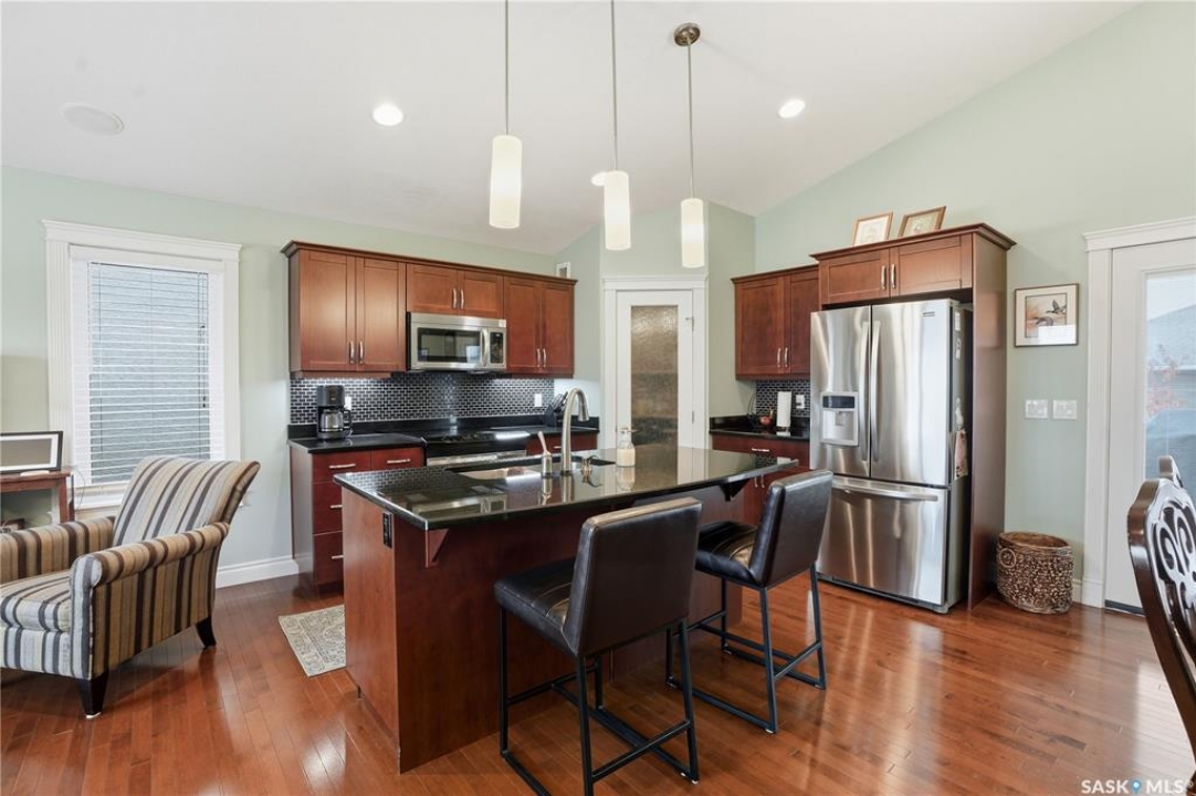 This fully developed 1272 square foot modified bi-level in desirable Rosewood offers style, comfort, and convenience-located across the street from walking paths and a lake, and close to all amenities. The bright, open-concept main floor features hardwood floors, fresh paint, a quartz countertop kitchen with stainless steel appliances, walk-in corner pantry, and direct access to the deck. Two bedrooms and a 4-piece bath complete the main floor, while the private master suite upstairs includes a walk-in closet and 3-piece ensuite. The spacious basement offers a large family room with room for a rec area or office, an additional bedroom, 3-piece bathroom, and ample storage. The beautifully landscaped yard is a highlight, featuring apple trees, lush plants, enclosed storage under the deck, and a heated shed with 220 amp service-perfect for a workshop or man cave. Completed with a double attached garage, this move-in ready home is a must see!