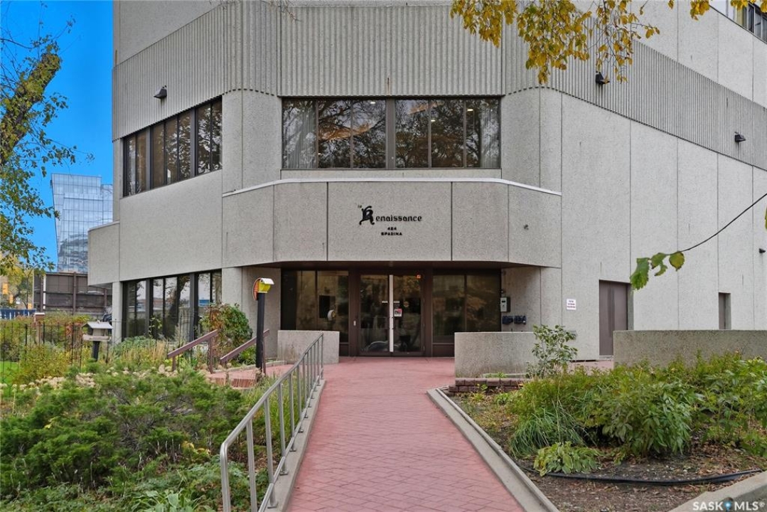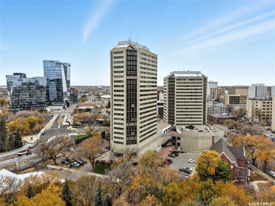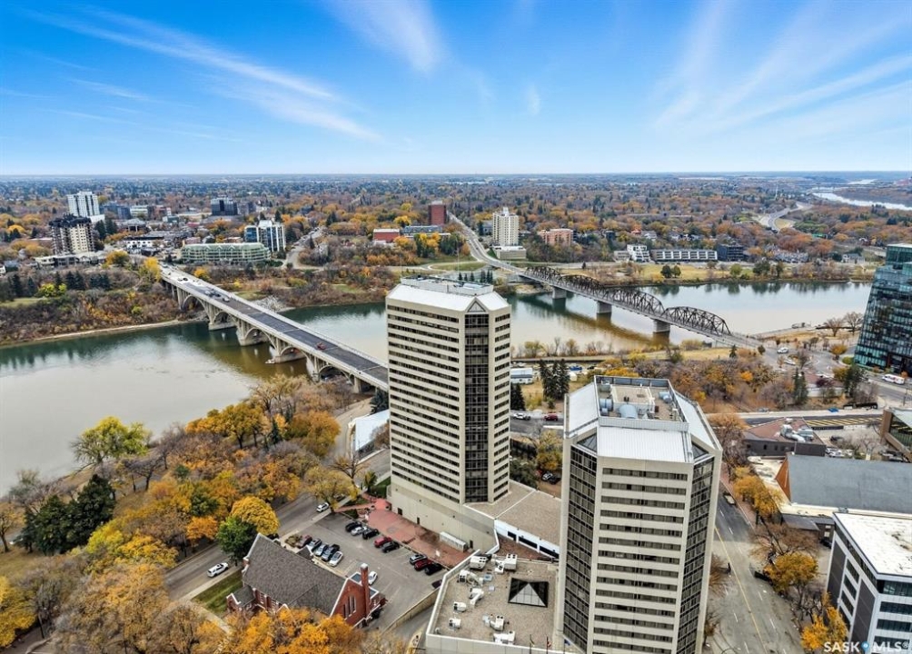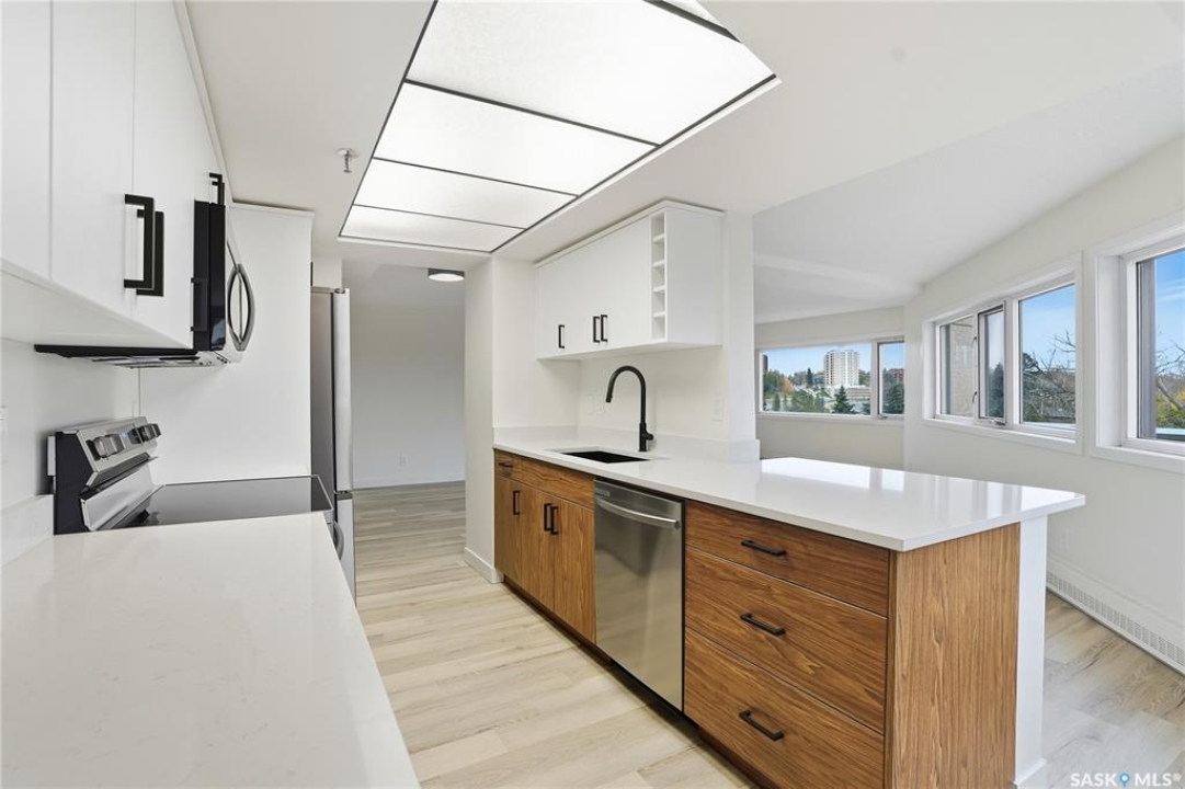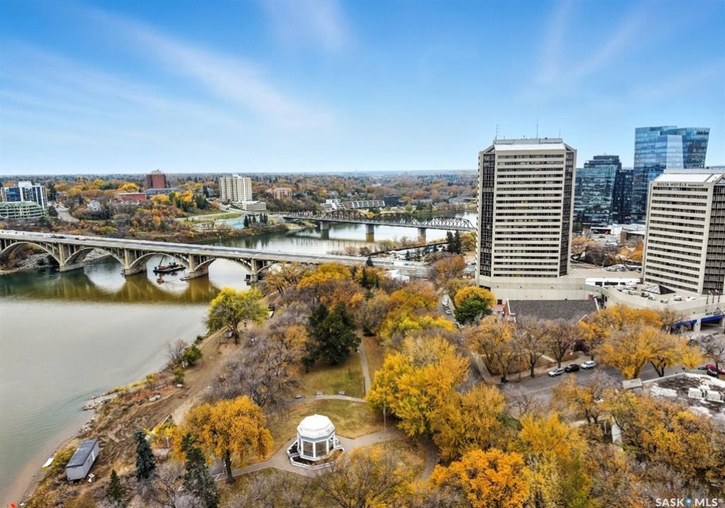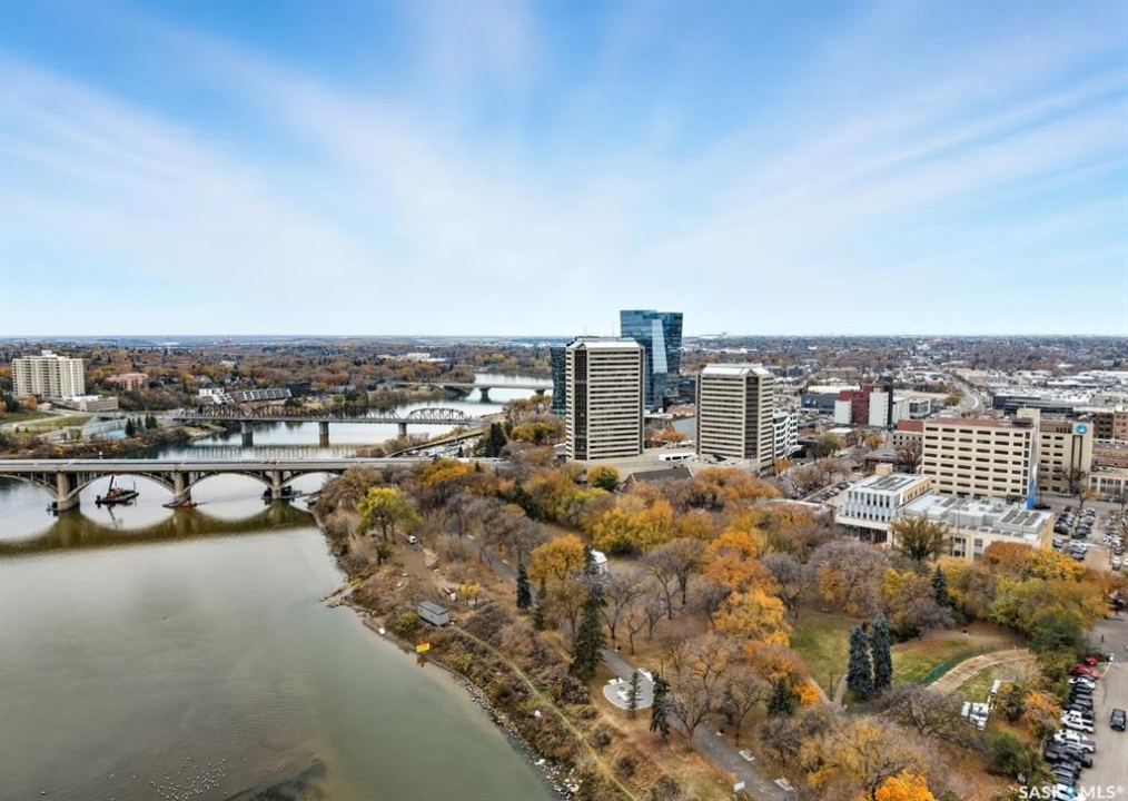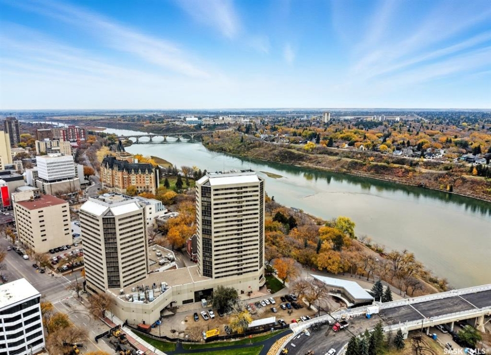 Redone head to toe, gorgeous professional interior renovation! Pristine and modern: fourth floor 1320 square-foot two bedroom two bath unit in the beautiful Renaissance building on Spadina Crescent, situated on the riverbank! Enter and be impressed, this incredibly bright unit is surrounded in windows, featuring newer light oak vinyl plank flooring throughout, smooth ceilings, updated fixtures, lighting, all cabinets, trim and baths. The new dreamy kitchen has white and light oak cabinets, black hardware and faucet, quartz countertops, gleaming stainless appliances and a eating bar peninsula. The kitchen kitchen connects to a dinette area, opening into a sprawling very spacious living room area, and another large dining area. In addition, this this very unique and sprawling floor plan features a den/office area and two large bedrooms, each with their own full bath with tiled tub surrounds. The master suite has a generous walk in closet, as well there is a storage room, insuite laundry and front entry storage. The building is renowned for its amenities including the Delta Hotel's resort-like indoor pool, recreation area and hot tub, fitness center and an outdoor patio. One underground parking stall P3-332 and storage unit, central air.