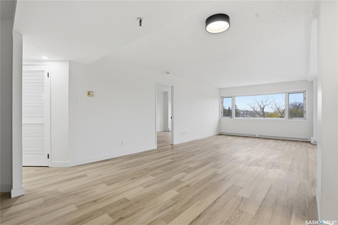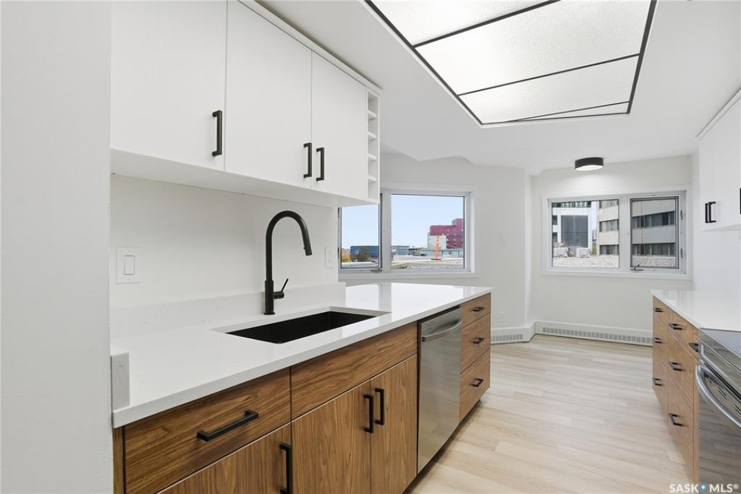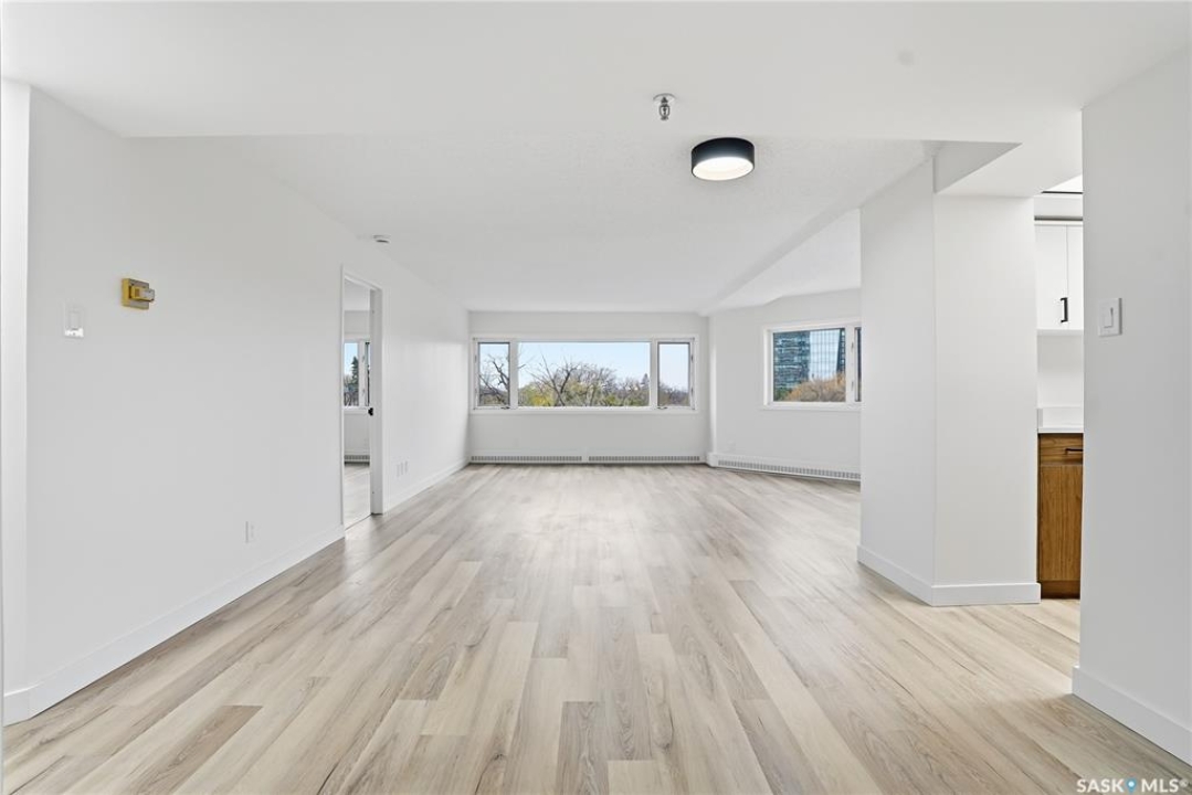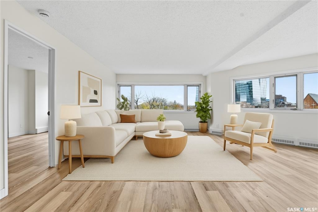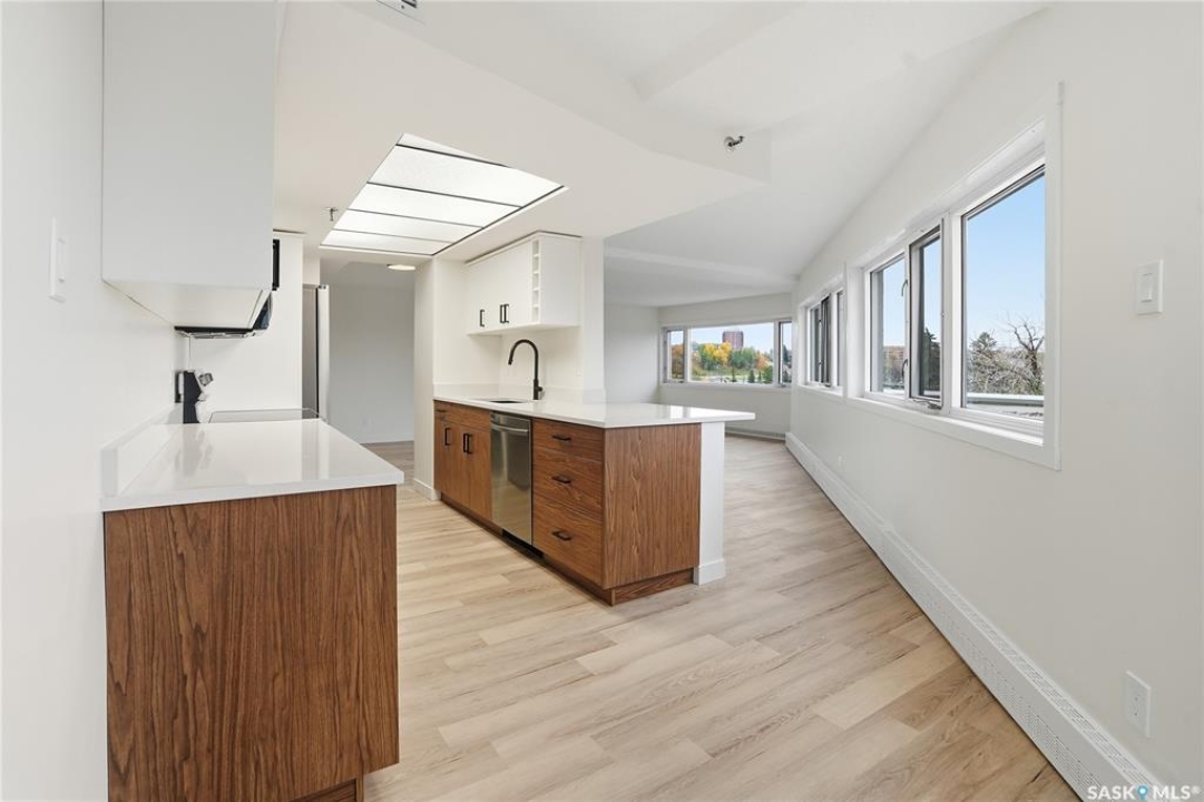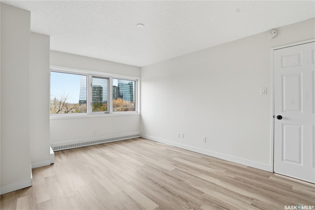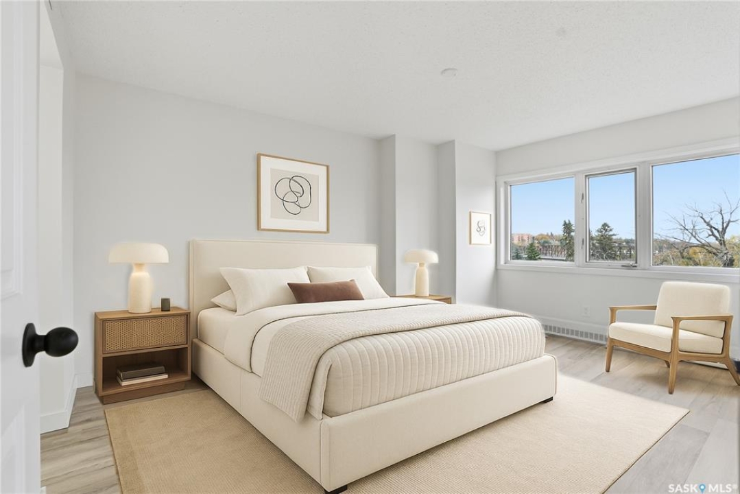 Redone head to toe, gorgeous professional interior renovation! Pristine and modern: fourth floor 1320 square-foot two bedroom two bath unit in the beautiful Renaissance building on Spadina Crescent, situated on the riverbank! Enter and be impressed, this incredibly bright unit is surrounded in windows, featuring newer light oak vinyl plank flooring throughout, smooth ceilings, updated fixtures, lighting, all cabinets, trim and baths. The new dreamy kitchen has white and light oak cabinets, black hardware and faucet, quartz countertops, gleaming stainless appliances and a eating bar peninsula. The kitchen kitchen connects to a dinette area, opening into a sprawling very spacious living room area, and another large dining area. In addition, this this very unique and sprawling floor plan features a den/office area and two large bedrooms, each with their own full bath with tiled tub surrounds. The master suite has a generous walk in closet, as well there is a storage room, insuite laundry and front entry storage. The building is renowned for its amenities including the Delta Hotel's resort-like indoor pool, recreation area and hot tub, fitness center and an outdoor patio. One underground parking stall P3-332 and storage unit, central air.