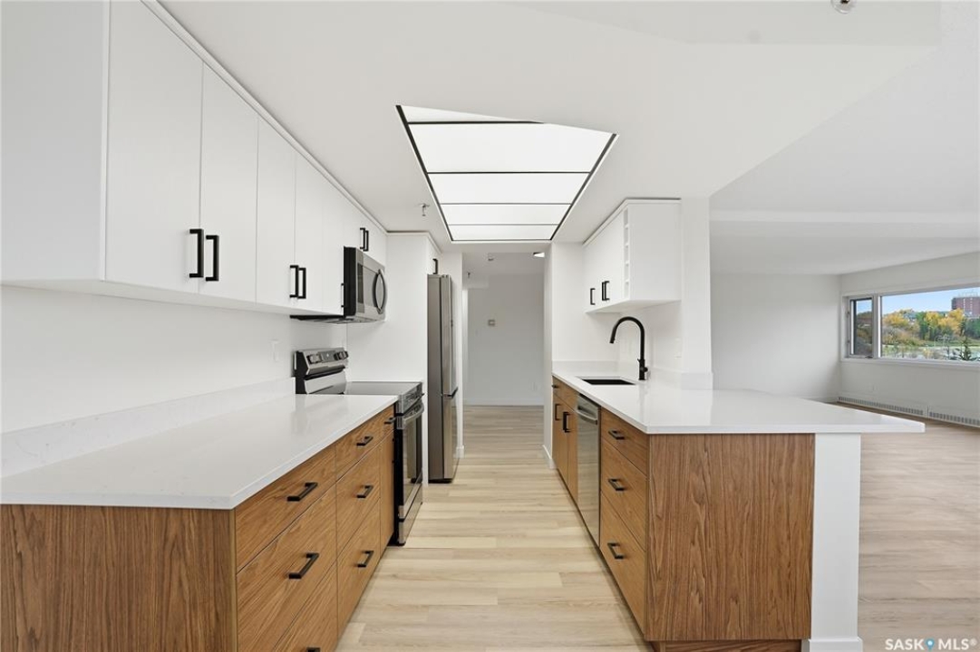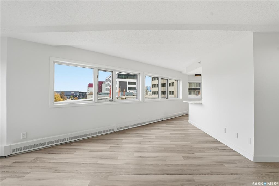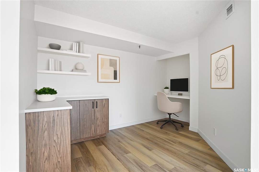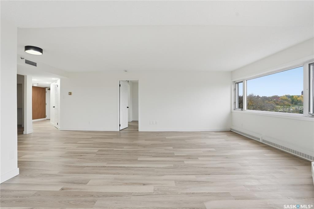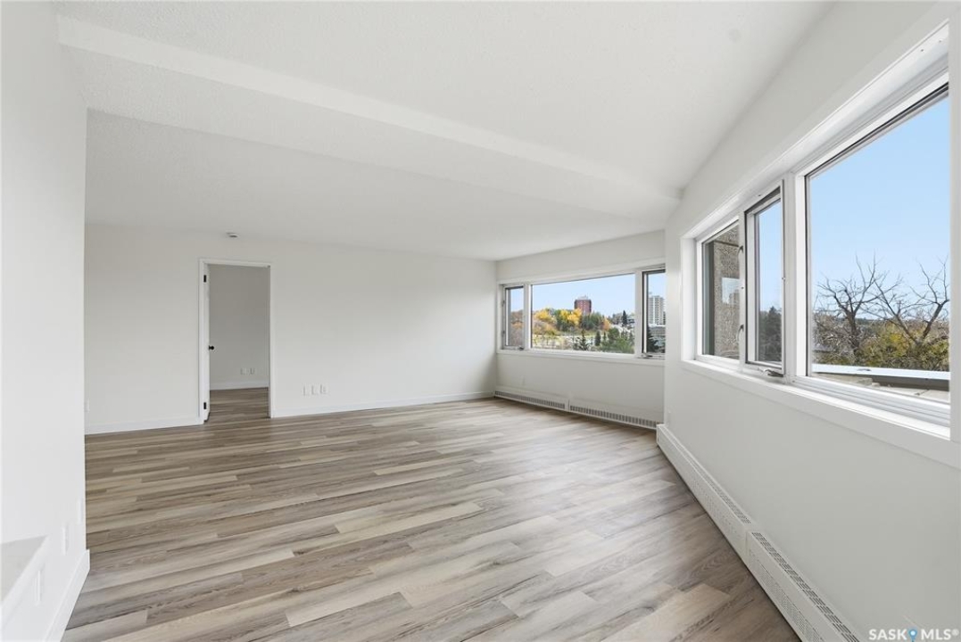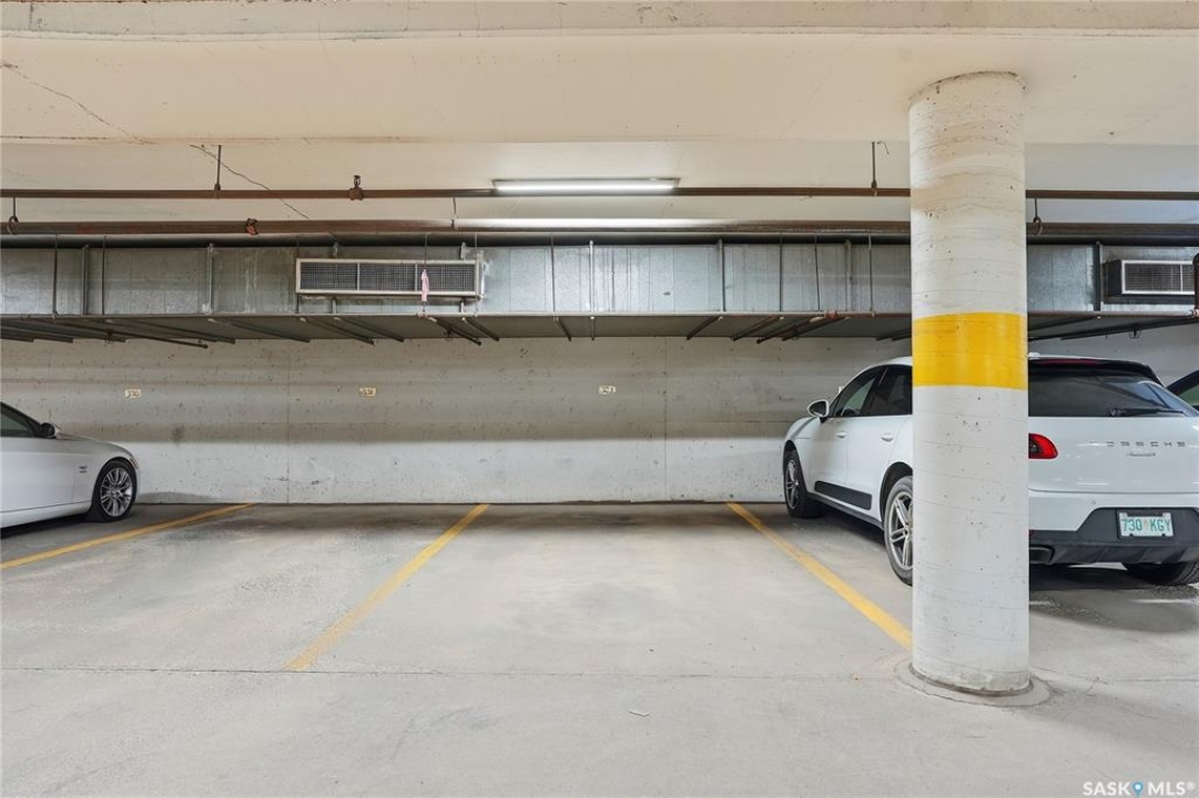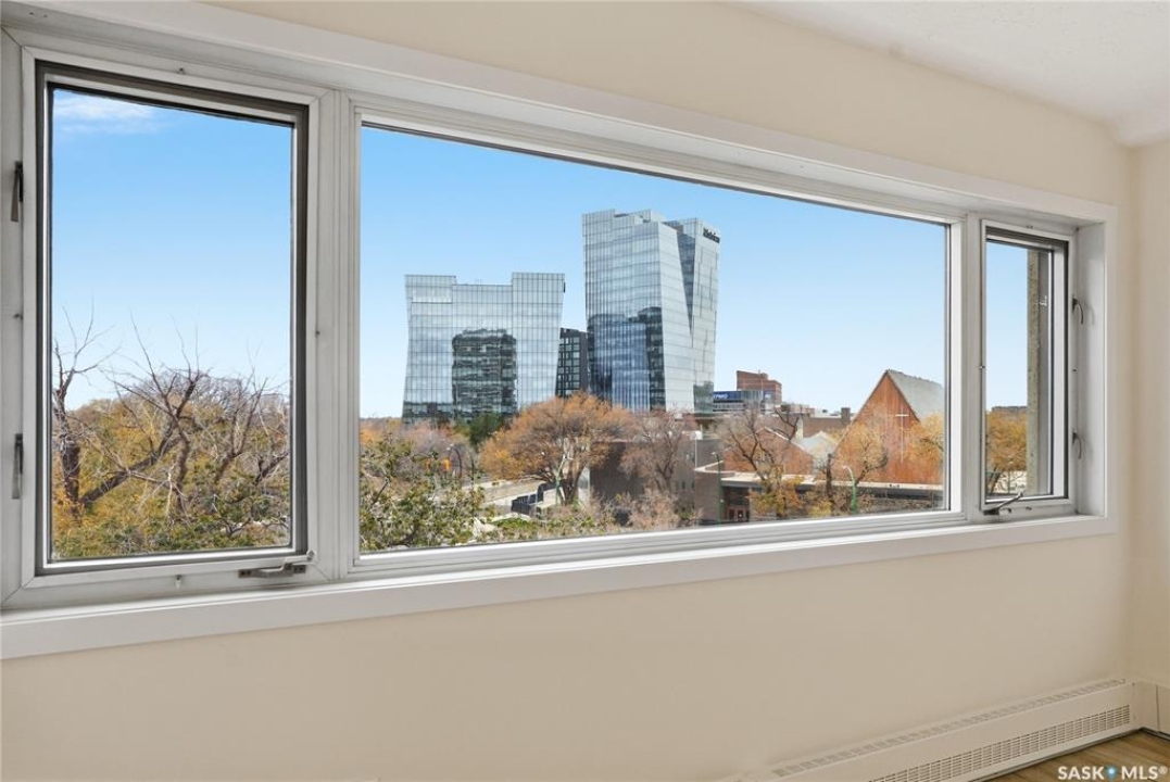Redone head to toe, gorgeous professional interior renovation! Pristine and modern: fourth floor 1320 square-foot two bedroom two bath unit in the beautiful Renaissance building on Spadina Crescent, situated on the riverbank! Enter and be impressed, this incredibly bright unit is surrounded in windows, featuring newer light oak vinyl plank flooring throughout, smooth ceilings, updated fixtures, lighting, all cabinets, trim and baths. The new dreamy kitchen has white and light oak cabinets, black hardware and faucet, quartz countertops, gleaming stainless appliances and a eating bar peninsula. The kitchen kitchen connects to a dinette area, opening into a sprawling very spacious living room area, and another large dining area. In addition, this this very unique and sprawling floor plan features a den/office area and two large bedrooms, each with their own full bath with tiled tub surrounds. The master suite has a generous walk in closet, as well there is a storage room, insuite laundry and front entry storage. The building is renowned for its amenities including the Delta Hotel's resort-like indoor pool, recreation area and hot tub, fitness center and an outdoor patio. One underground parking stall P3-332 and storage unit, central air.