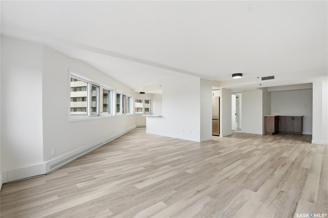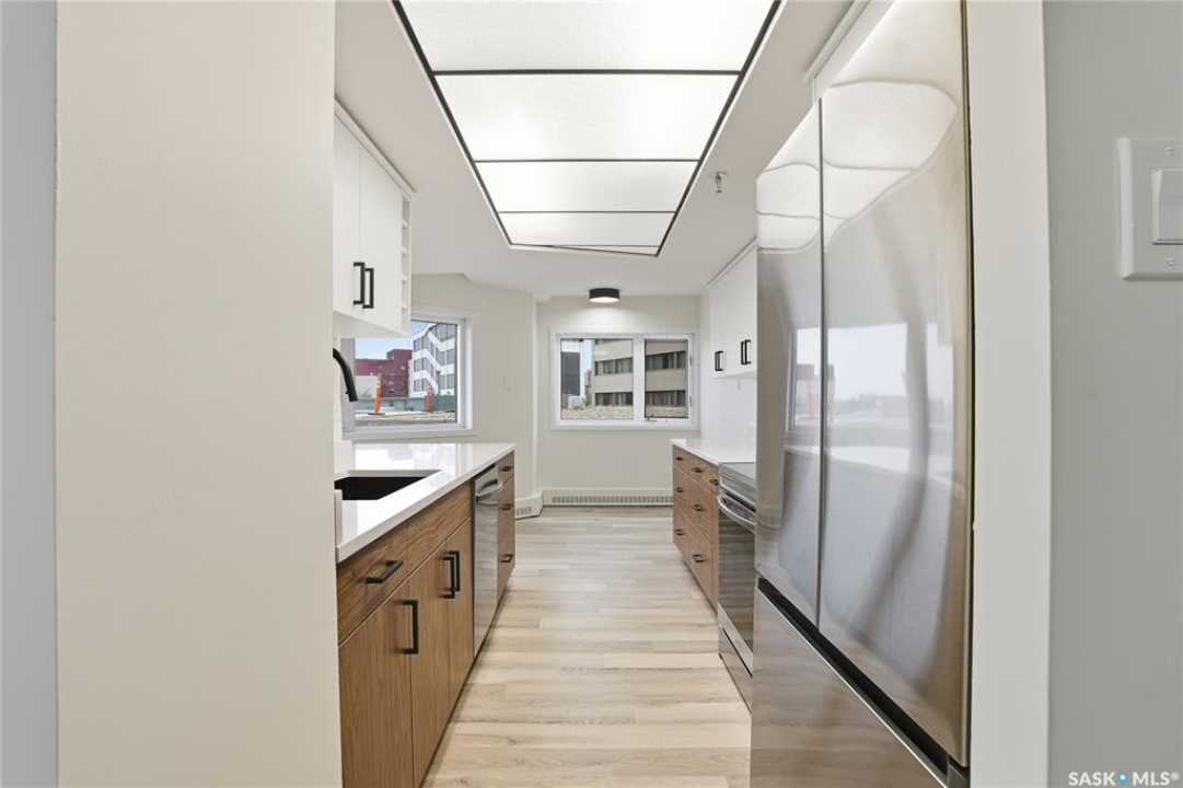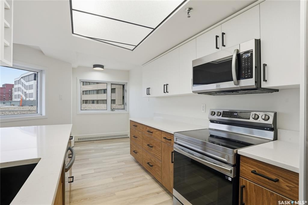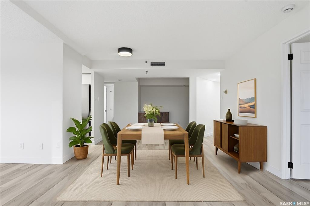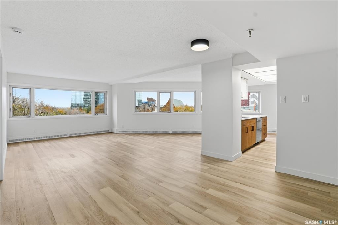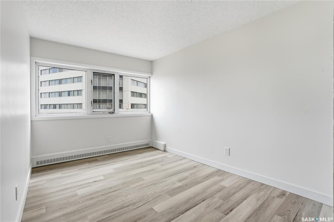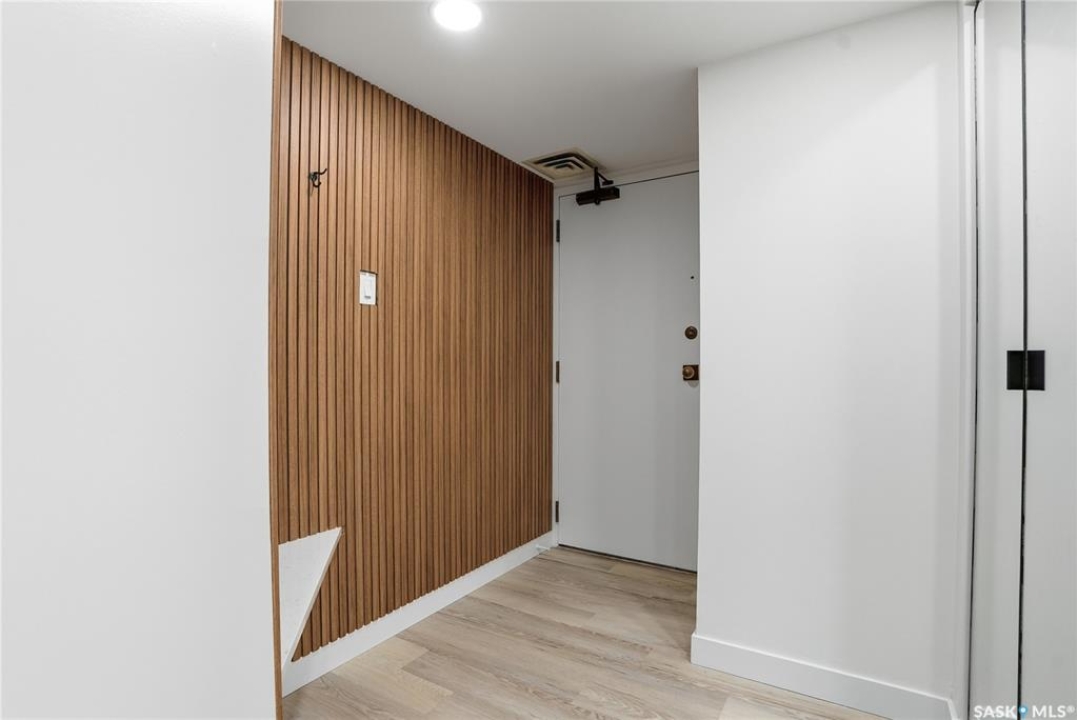 Redone head to toe, gorgeous professional interior renovation! Pristine and modern: fourth floor 1320 square-foot two bedroom two bath unit in the beautiful Renaissance building on Spadina Crescent, situated on the riverbank! Enter and be impressed, this incredibly bright unit is surrounded in windows, featuring newer light oak vinyl plank flooring throughout, smooth ceilings, updated fixtures, lighting, all cabinets, trim and baths. The new dreamy kitchen has white and light oak cabinets, black hardware and faucet, quartz countertops, gleaming stainless appliances and a eating bar peninsula. The kitchen kitchen connects to a dinette area, opening into a sprawling very spacious living room area, and another large dining area. In addition, this this very unique and sprawling floor plan features a den/office area and two large bedrooms, each with their own full bath with tiled tub surrounds. The master suite has a generous walk in closet, as well there is a storage room, insuite laundry and front entry storage. The building is renowned for its amenities including the Delta Hotel's resort-like indoor pool, recreation area and hot tub, fitness center and an outdoor patio. One underground parking stall P3-332 and storage unit, central air.