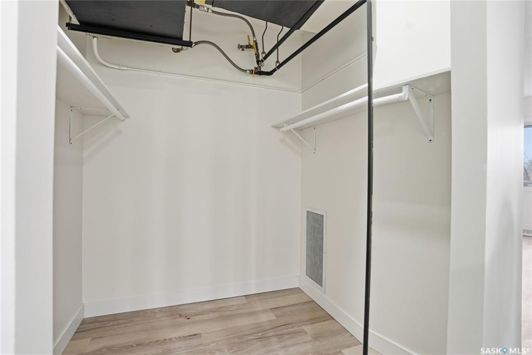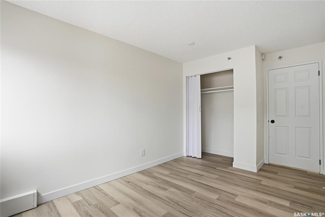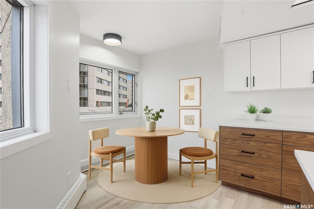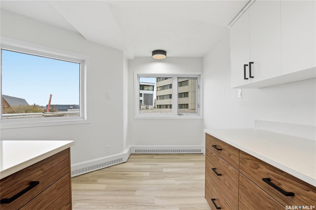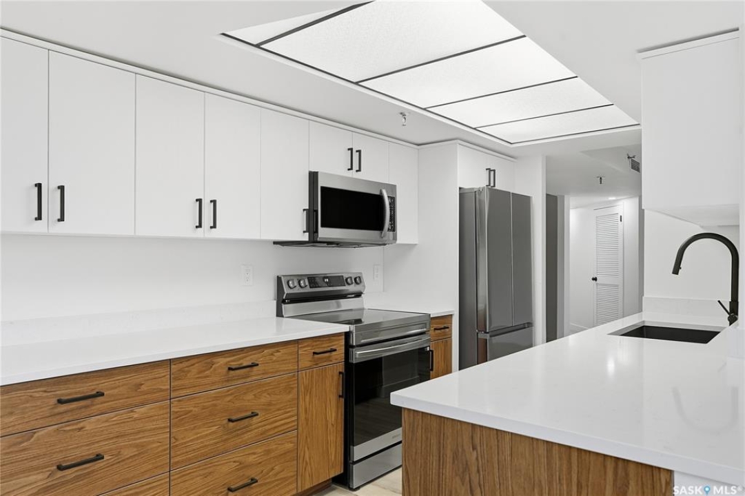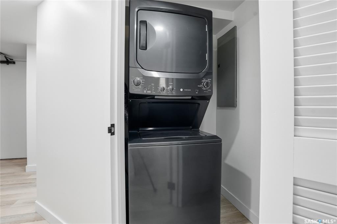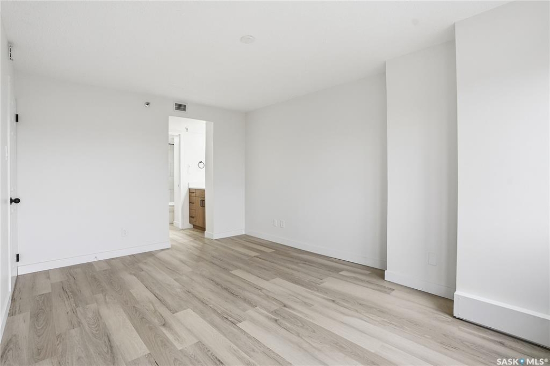 Redone head to toe, gorgeous professional interior renovation! Pristine and modern: fourth floor 1320 square-foot two bedroom two bath unit in the beautiful Renaissance building on Spadina Crescent, situated on the riverbank! Enter and be impressed, this incredibly bright unit is surrounded in windows, featuring newer light oak vinyl plank flooring throughout, smooth ceilings, updated fixtures, lighting, all cabinets, trim and baths. The new dreamy kitchen has white and light oak cabinets, black hardware and faucet, quartz countertops, gleaming stainless appliances and a eating bar peninsula. The kitchen kitchen connects to a dinette area, opening into a sprawling very spacious living room area, and another large dining area. In addition, this this very unique and sprawling floor plan features a den/office area and two large bedrooms, each with their own full bath with tiled tub surrounds. The master suite has a generous walk in closet, as well there is a storage room, insuite laundry and front entry storage. The building is renowned for its amenities including the Delta Hotel's resort-like indoor pool, recreation area and hot tub, fitness center and an outdoor patio. One underground parking stall P3-332 and storage unit, central air.