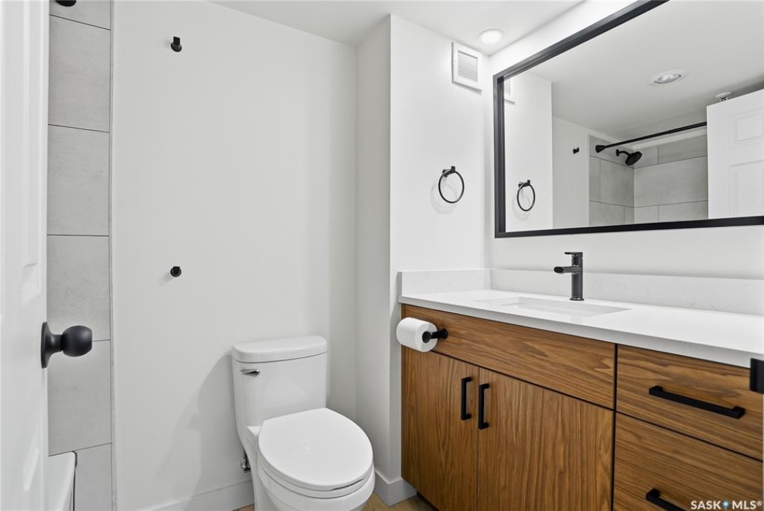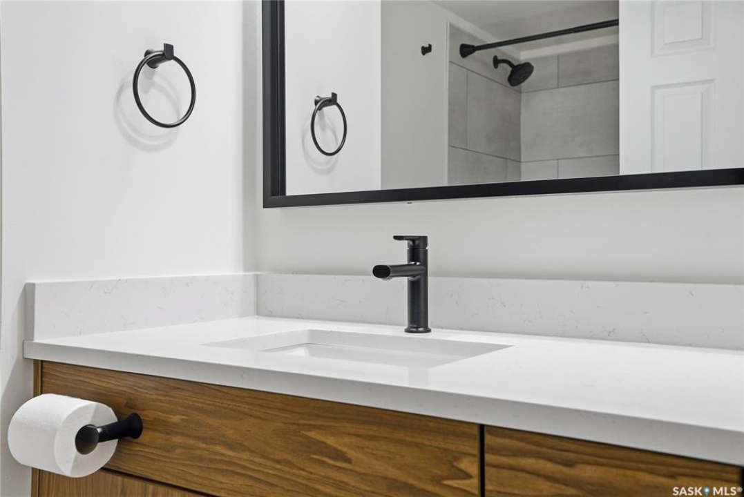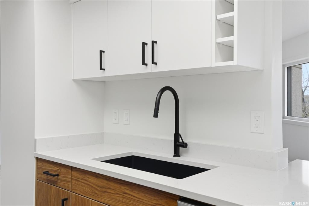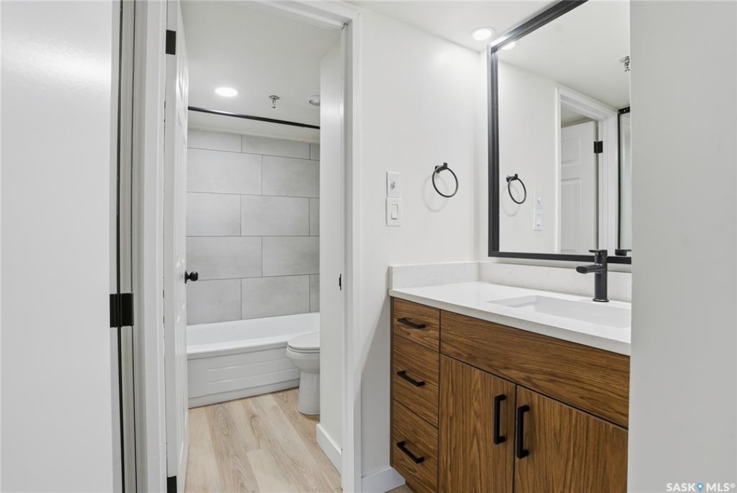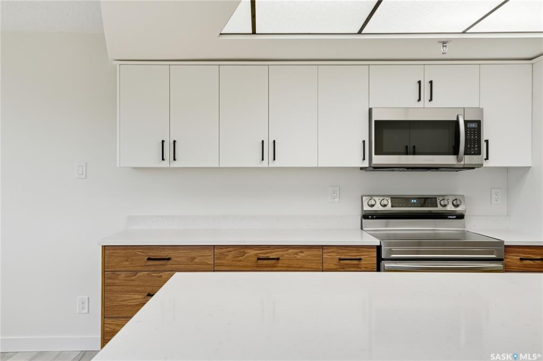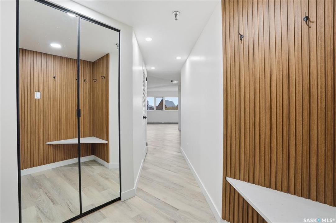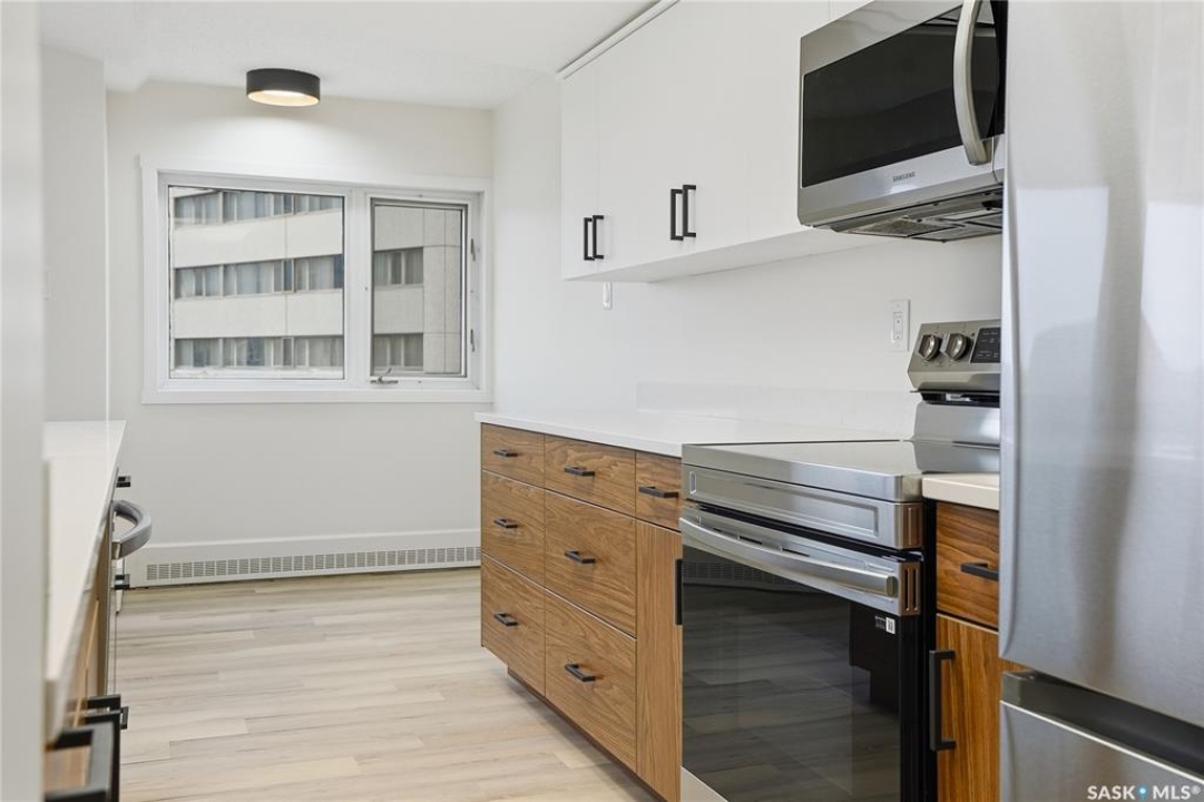 Redone head to toe, gorgeous professional interior renovation! Pristine and modern: fourth floor 1320 square-foot two bedroom two bath unit in the beautiful Renaissance building on Spadina Crescent, situated on the riverbank! Enter and be impressed, this incredibly bright unit is surrounded in windows, featuring newer light oak vinyl plank flooring throughout, smooth ceilings, updated fixtures, lighting, all cabinets, trim and baths. The new dreamy kitchen has white and light oak cabinets, black hardware and faucet, quartz countertops, gleaming stainless appliances and a eating bar peninsula. The kitchen kitchen connects to a dinette area, opening into a sprawling very spacious living room area, and another large dining area. In addition, this this very unique and sprawling floor plan features a den/office area and two large bedrooms, each with their own full bath with tiled tub surrounds. The master suite has a generous walk in closet, as well there is a storage room, insuite laundry and front entry storage. The building is renowned for its amenities including the Delta Hotel's resort-like indoor pool, recreation area and hot tub, fitness center and an outdoor patio. One underground parking stall P3-332 and storage unit, central air.