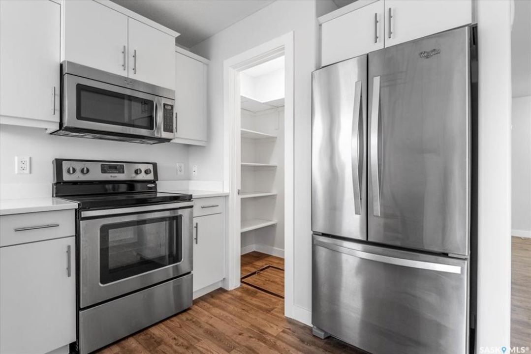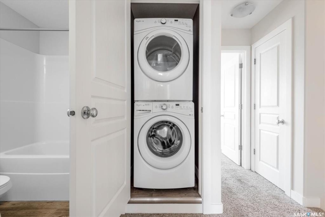 Welcome to this stylish and efficient 2-storey home in the heart of Harbour Landing. Built by Trademark Homes as part of their Freedom Series, this home offers 1,007 sq ft of thoughtfully designed living space on an engineered crawl space, eliminating basement concerns while offering an additional storage option. Inside, the layout is bright and welcoming, with large windows and a functional flow. The kitchen features white quartz countertops, modern cabinetry, walk-in pantry and stainless steel appliances. A cozy dining nook overlooks the backyard, the main floor also includes a 2-piece powder room and utility closet. Upstairs, you'll find three bedrooms, including a spacious primary with walk-in closet and oversized front-facing window. The second level also includes a full bath, laundry, and pull-down attic access with ladder — perfect for extra storage. Step outside to a fully fenced, zero-scaped backyard with a patio, deck and garden area, ideal for relaxing or entertaining. A rear parking pad provides off-street parking, and a base for a future garage. Located near walking paths, parks, and elementary school. this home offers comfort, quality, and convenience in one beautiful little package.