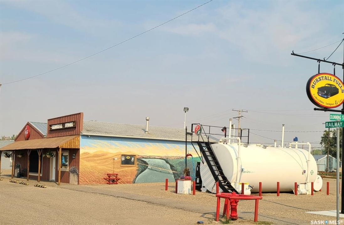 Burstall Fuels offers a rare investment opportunity in the heart of southwest Saskatchewan. Located in the beautiful small town of Burstall just inside the Saskatchewan–Alberta border, this well-known property is just minutes from the Burstall Compressor Station and benefits from the steady economic activity it brings, with hundreds of workers and contractors in the area creating a consistent demand for fuel, food, and convenience services. The operation is a busy, relatively self-sustaining 24/7 pay-at-the-pump fuel service, well advertised on the main access highways, and the pumps have been upgraded for reliability and efficiency. Situated on a corner lot for easy access, the station offers regular, diesel, and premium fuel. Attached is a charming convenience store with an old west general store façade that extends inside, offering snacks, beverages, essentials, and a unique selection of antiques, collectibles, giftware, souvenirs, and locally supplied products. There is exciting potential to expand the business even further, with space and opportunity to introduce a coffee shop, food service, or ready-to-eat meal offerings to generate additional revenue from the strong local workforce and passing traffic, while already offering homemade heat-and-eat meals, baking, snacks, and treats. A standout feature of the property is the inviting outdoor entertaining area, complete with picnic tables, a fire pit, and a cook house—perfect for hosting community events, car shows, special promotions, or simply providing a welcoming place for customers to relax. The property also includes a separate rental suite with its own entrance, offering added income potential or convenient on-site living. Whether serving locals, workers, or visitors exploring the Great Sand Hills and southwest Saskatchewan, this versatile property combines a thriving business, strong growth potential, and meaningful community connection—don't miss your chance to own this exceptional property.