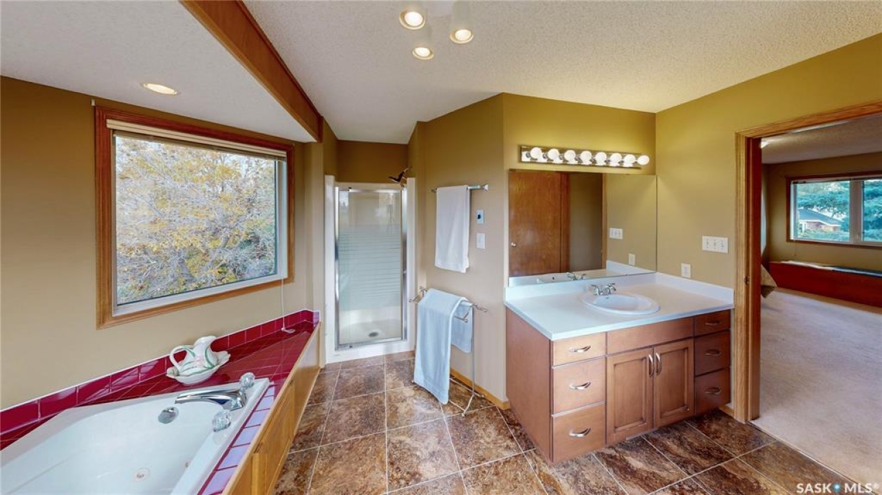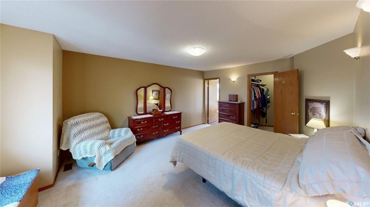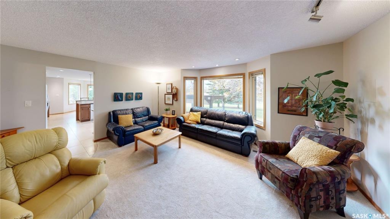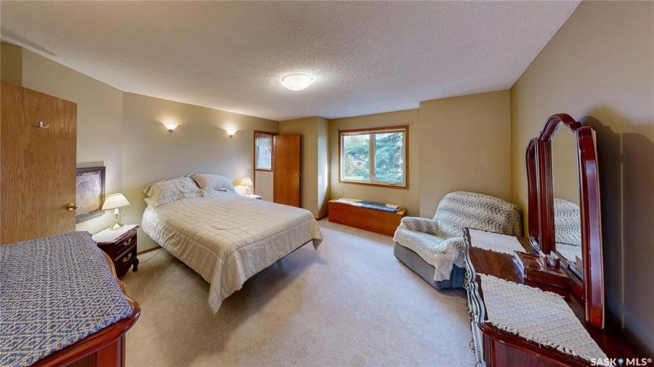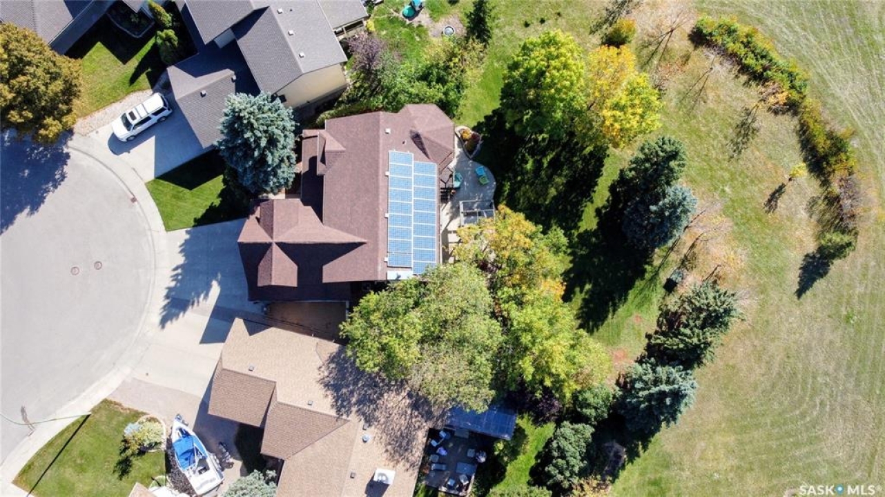 Welcome to 2631 Crocus Drive in the desirable Wood Meadows neighborhood close to WF Ready school and park, St. Marguerite School, and a short drive away from all the shopping amenities Regina's East End has. This original owner, 1991 built, 2588 square foot, 5 bedroom, 4 bathroom, 2 story house sits on a massive 8840 sqft irregular lot backing a walking path. The front yard has a lawn, pine tree, greenery and the double concrete driveway that leads to the 24'x24' double attached, insulated garage and covered front porch. There are 18 solar panels on the roof! The backyard has an endless lawn, trees and shrubs, a patio with an included pergola, a garden, a fenced area and a shed! You enter this home into the foyer that has a coat closet. Next is the family room. Walking through french doors you enter into the large dining room that is surrounded by large windows that overlook the beautiful green space. The updated kitchen is next with a window overlooking the back yard, cappuccino maple cabinets, granite counter tops and the included fridge, stove, microwave hood fan and built-in dishwasher are all included. Next is the living room with carpet flooring, a bay window, and a beautiful electric fireplace. The main floor is finished off with a 2pc bathroom, the door to the garage and a laundry room with a sink and cabinetry. Upstairs are 2 good sized bedrooms with ample closet space, the main 4pc bathroom with double sinks, another bedroom, and then the huge bonus room. The 2nd floor is completed with a large primary bedroom with a walk-in closet as well as a 4pc ensuite bathroom featuring a jet tub. The finished basement starts out with a large rec room, another large bedroom with a walk in closet and is finished off with a 3pc bathroom and the utility room that has 2 high efficiency furnaces (2015), the owned gas water heater (2024) and brand new water softener (2025). This house has also received updated windows throughout, and has central air conditioning!