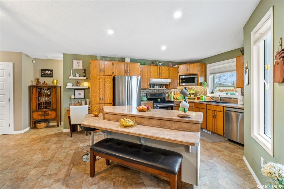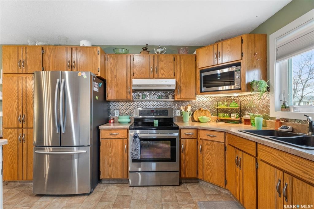213 1st Street, Beatty is spacious, well maintained and loved. As you enter the home, you are greeted with a large foyer that opens to the kitchen (complete with island), dining and sunken living room. The main floor also boasts a laundry room, 4 bedrooms, bathroom with soaker tub and a three piece ensuite. The basement has ample storage, large recreation room, den, three piece bathroom and bedroom. There is no shortage of room in this one! The furnace and central air were replaced in 2025 and almost all main floor windows have been replaced on past few years. This home site on three lots, has garden space, firepit and gorgeous deck. If the house didn't impress you enough, the 24x30 heated shop certainly will! Located only minutes from Melfort, this property provides peace and quiet with all neccessary services just down the highway!