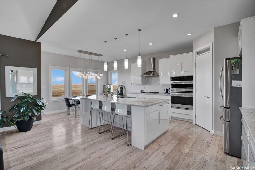 Sitina Estates is a hidden gem just minutes from Saskatoon, accessible via a double-lane highway. This 1880 sq ft bungalow is impeccably finished, featuring six bedrooms and three bathrooms. Located at the back of a cul-de-sac, the property offers exceptional curb appeal with a stucco and stone exterior and staggered garage doors on the triple-attached garage. The front door opens into a spacious tiled foyer with a striking two-sided gas fireplace, shared with the large living room, which is part of the open-concept main floor. The custom kitchen showcases quartz countertops with an island that includes bar seating, gloss-finish white cabinets, a built-in oven and microwave, a hood fan, and a gas range. A walk-through pantry provides easy access to the laundry/mudroom, which connects directly to the attached garage. The dining room is designed with large windows to maximize the natural views and provides access to a generously sized rear deck. Down the hallway, you'll find a four-piece bath and three bedrooms, including the primary suite, which boasts a walk-in closet and an ensuite with dual sinks, high-end fixtures, a Bain Ultra air tub, and a shower space awaiting your tile selection. The basement is nearly complete, with three additional bedrooms and a fully finished four-piece bath. The family room and den have exterior walls and electrical work already in place, leaving an opportunity for a handy buyer to add finishing touches. This quiet development, located just minutes from Saskatoon and the Vanscoy mine, offers the perfect balance of accessibility and the tranquility of acreage living with 2.6 acres to call your own. Call today for a private showing.