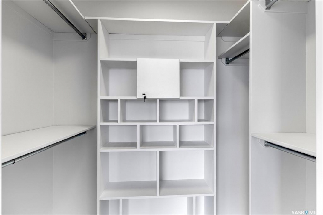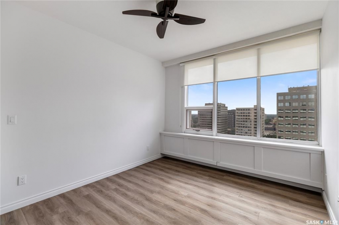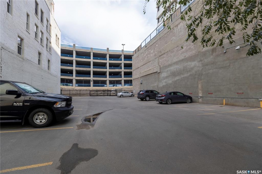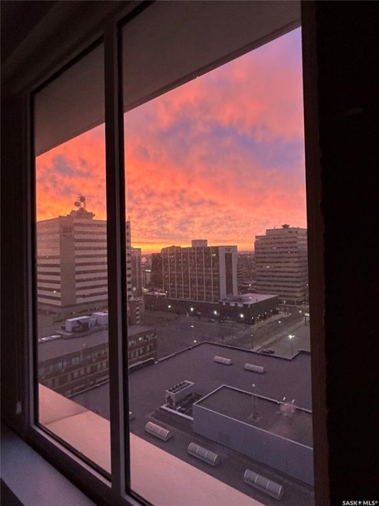 Featuring amazing views of the Regina skyline, this south facing executive condo takes in the sunset and sunrise and has been extensively renovated from top to bottom! Immediately when you walk in you will see a built-in entry bench with hooks and access to the in-suite laundry. The custom kitchen includes new quartz countertops with water fall edge and slab backsplash, stainless steel Amana appliances (refrigerator, stove, microwave and dishwasher), wooden shelving, a coffee station and sleek modern two tone cabinets that go right to the ceiling. The dining area includes a built-in banquette with storage so the amazing view can be enjoyed while you eat. The office area includes a feature wall and a custom wooden desk and shelves. The living room includes a built-in window seat with storage, a built-in tv bench and an electric fire place for those extra cold winter days. The bathroom has been tastefully updated with new paint, new mirror and lights. There is an extra deep soaker tub/shower as well. The bedroom features an amazing custom walk-in closet, with both shelving and rod storage. Condo fees include water and heat, and access to a full 24/7 gym, a social room with pool table, a roof top patio with BBQs and a hot tub and a Monday to Friday (8am-4pm) concierge at the entry. This unit comes with central air conditioning and one outdoor parking spot right outside the building in a secured gated lot. It also includes a 3x5 foot storage locker in the basement. Schedule your showing today!