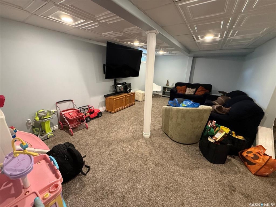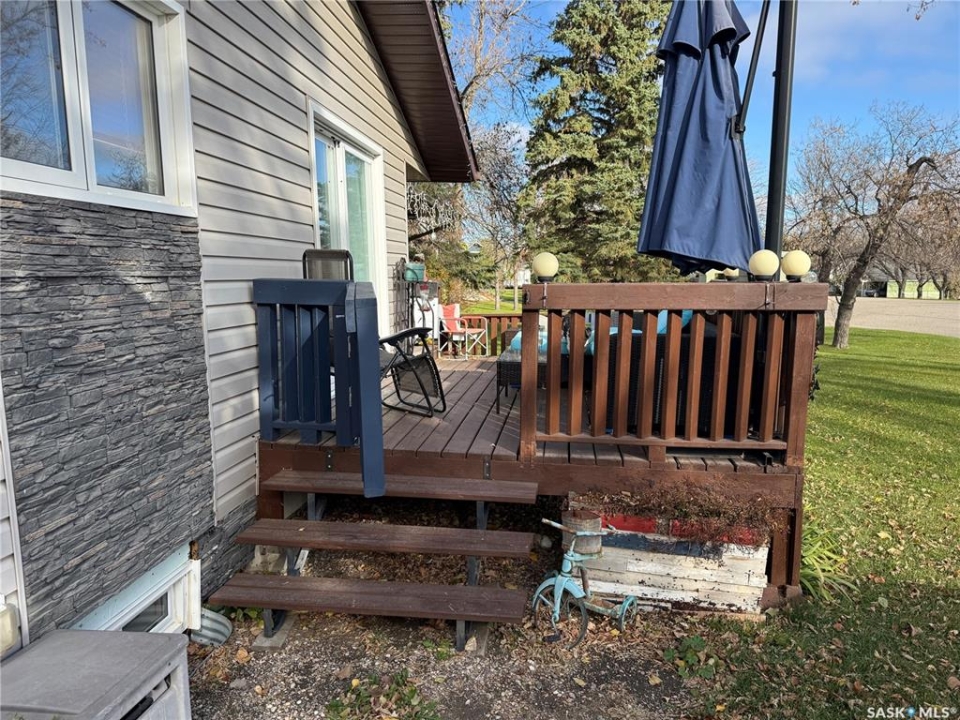 Welcome to the friendly community of Storthoaks! This property is sure to impress any buyer with its amazing yard, attached garage and modern layout. If offers a large kitchen with ample cupboard space that opens to the dining room. The dining room has patio doors to access the deck. The living room is spacious and has a bay window which is great for someone with plants. Down the hallway is the primary bedroom that accesses the main floor 4 piece bathroom. There are 2 additional bedrooms on the main floor as well as a den/office area. There is also a 2 piece bathroom/laundry room that is just off the foyer. The basement offers a raised family room and opens to the rec room. This area would be perfect for a pool table or games area. There are 2 large rooms in the basement, a 4 piece bathroom, office room and large storage room. The outside yard is very private with mature trees, garden area, rv parking and a shed. This home is on a corner lot and has been very well cared for. Updates include: New shingles in 2024 & 2025 completed.