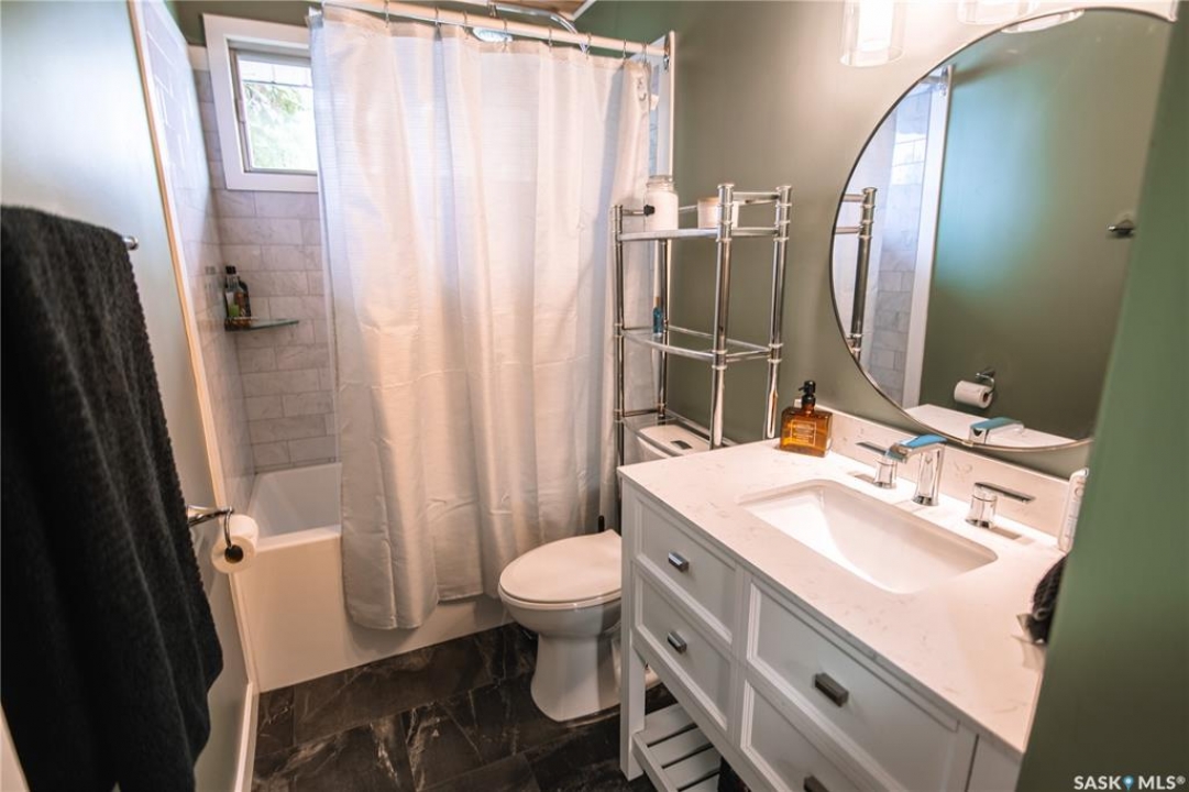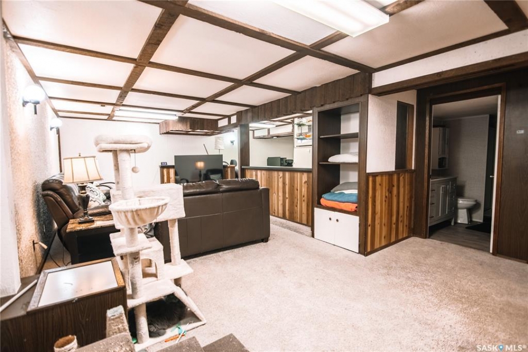 This beautifully maintained 1040 sq ft bungalow shows exceptionally well and offers a perfect blend of comfort, functionality, and thoughtful updates throughout. The main floor features a bright and spacious living room filled with natural light. The kitchen is both practical and inviting, showcasing painted white cabinets, a large walk-in pantry, and an eating area with a newer PVC window. The generous primary bedroom was originally two bedrooms and could easily be converted back if desired. A well-sized second bedroom and an upgraded four-piece bathroom complete the main level. The fully developed basement is equally impressive, featuring a large L-shaped rec room with a wet bar, full-size fridge, and built-in bookcases — perfect for entertaining or relaxing. You'll also find a three-piece bathroom complete with a cedar-lined dry heat sauna, an additional bedroom, a laundry area and a separate mechanical room. Outside, enjoy a fully fenced and beautifully landscaped yard with a patio, mature trees, and shrubs. There's a 22x24 double detached garage with lane access and a convenient single front driveway, providing ample parking options. Other notable updates include: New high-efficiency furnace and central air conditioning, new flooring and vanity in the downstairs bathroom, upgraded tub surround, flooring, and exhaust fan in the upstairs bathroom, roof with fiberglass shingles and newer garage door opener. Conveniently located within walking distance to both public and separate schools, close to shopping, parks, and all amenities, this home truly stands out for its care and condition.