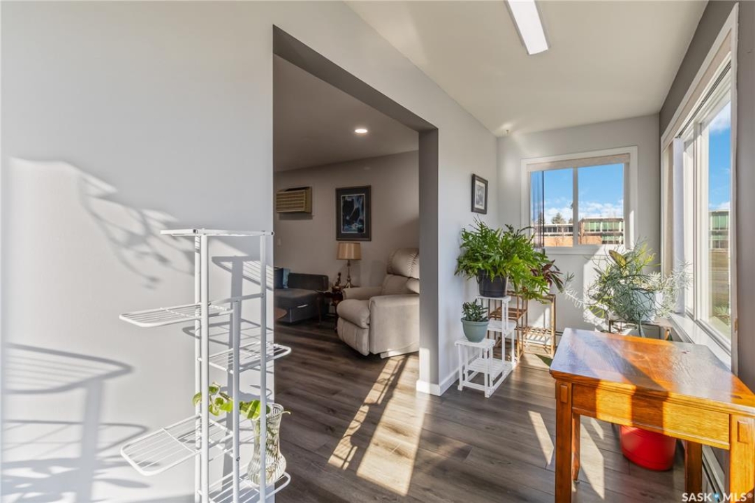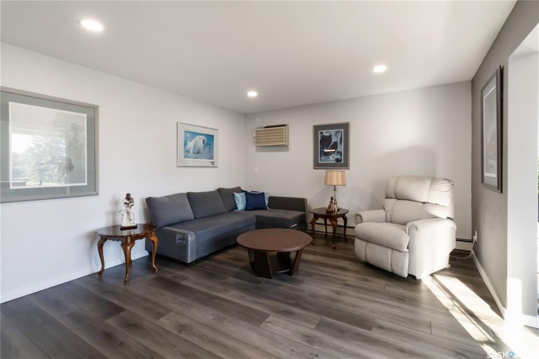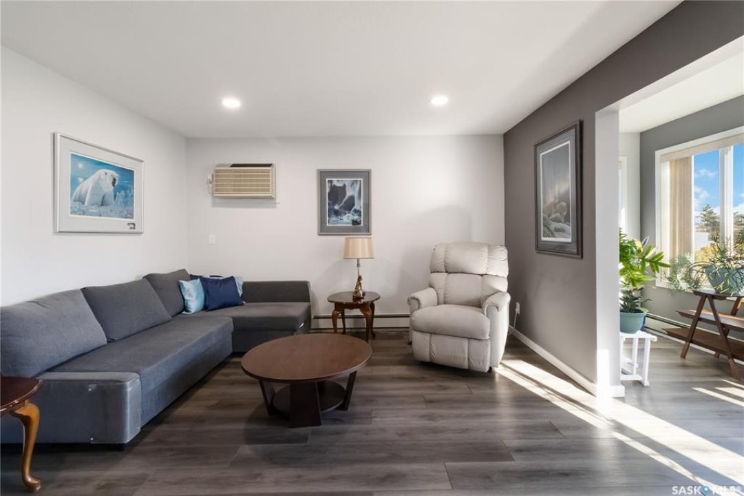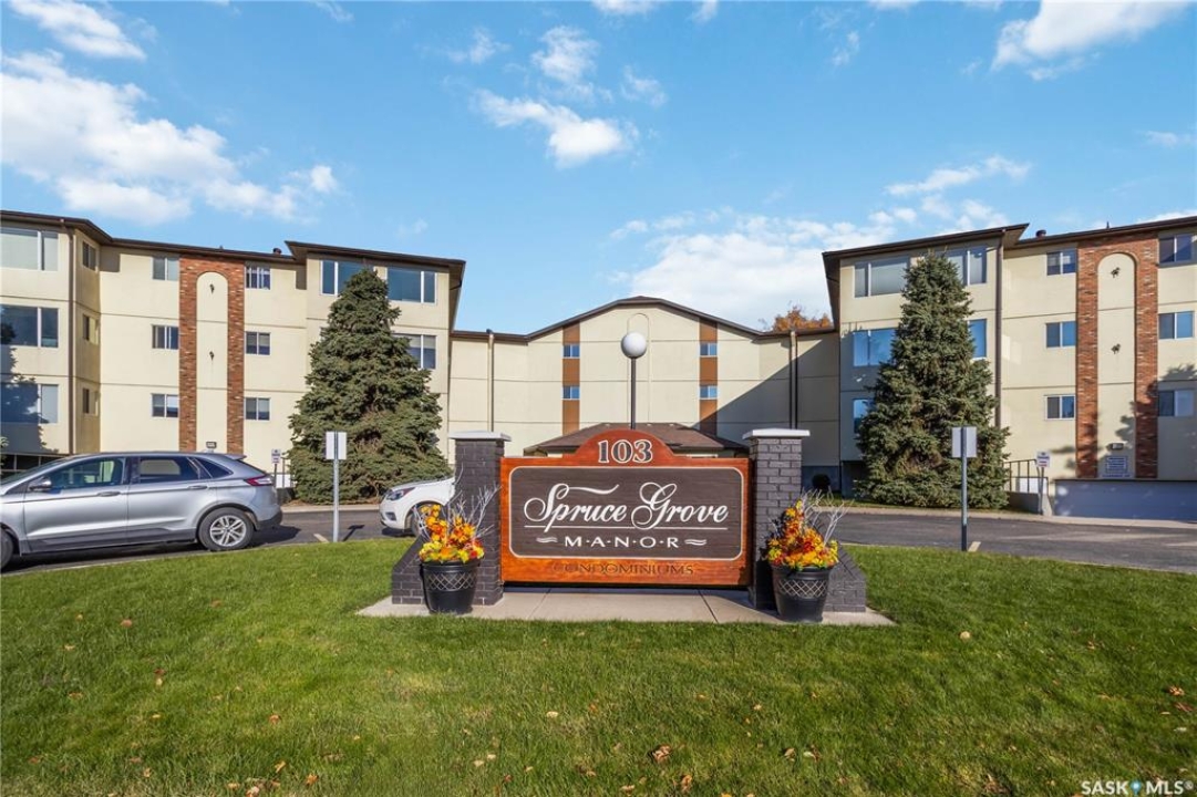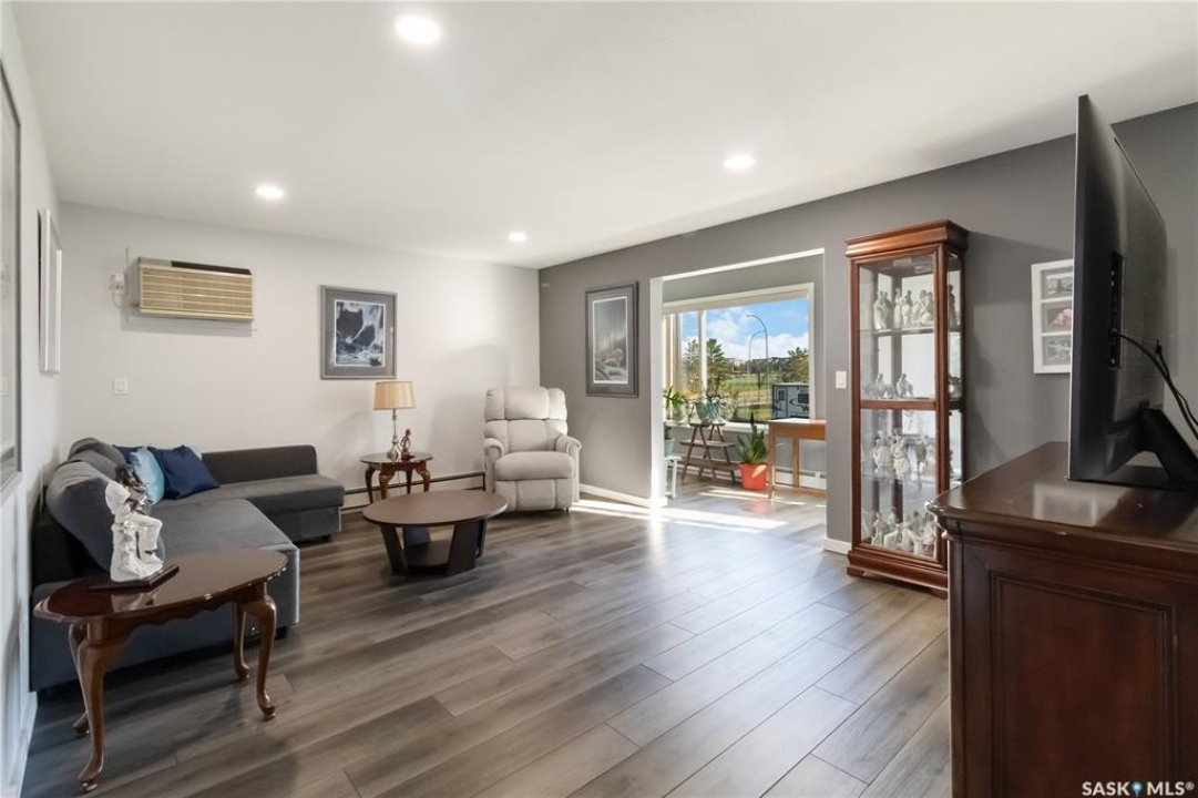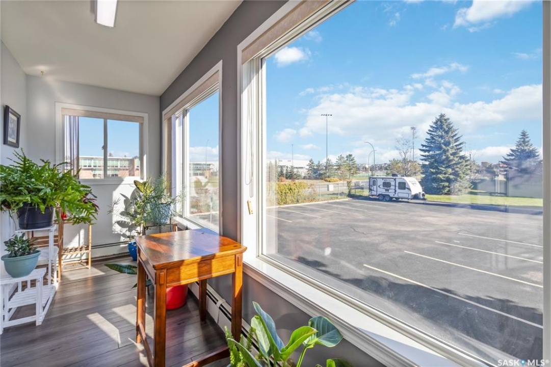 Welcome to 112-103 Keevil Crescent! This spacious 1,500 sq ft renovated condo is move in ready. Recent upgrades include new flooring throughout, a modern kitchen with new cabinetry and quartz countertops, newer appliances, new lighting - with recessed lights added in the living room, updated bathrooms, and new windows. The condo boasts two large bedrooms plus a versatile den/office while the laundry room offers extra space for a freezer or desk/crafts. The living room is roomy, and the sunroom is perfect for a plant lover or enjoying your morning coffee. The kitchen provides ample space for a future island and has plenty of room for a large dining table. The main four-piece bath features a new vanity, flooring and paint. The large primary bedroom includes a three-piece bath with a wheelchair-accessible shower as well as a walk-in closet and another spacious bedroom is just down the hall. Additional highlights include one heated underground parking spot, a spacious storage room, an elevator, exterior parking for owners, and visitor parking out front. Conveniently located within walking distance of various stores and a library.