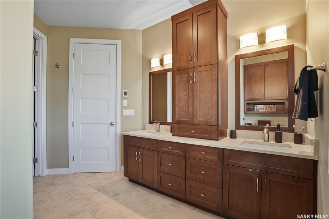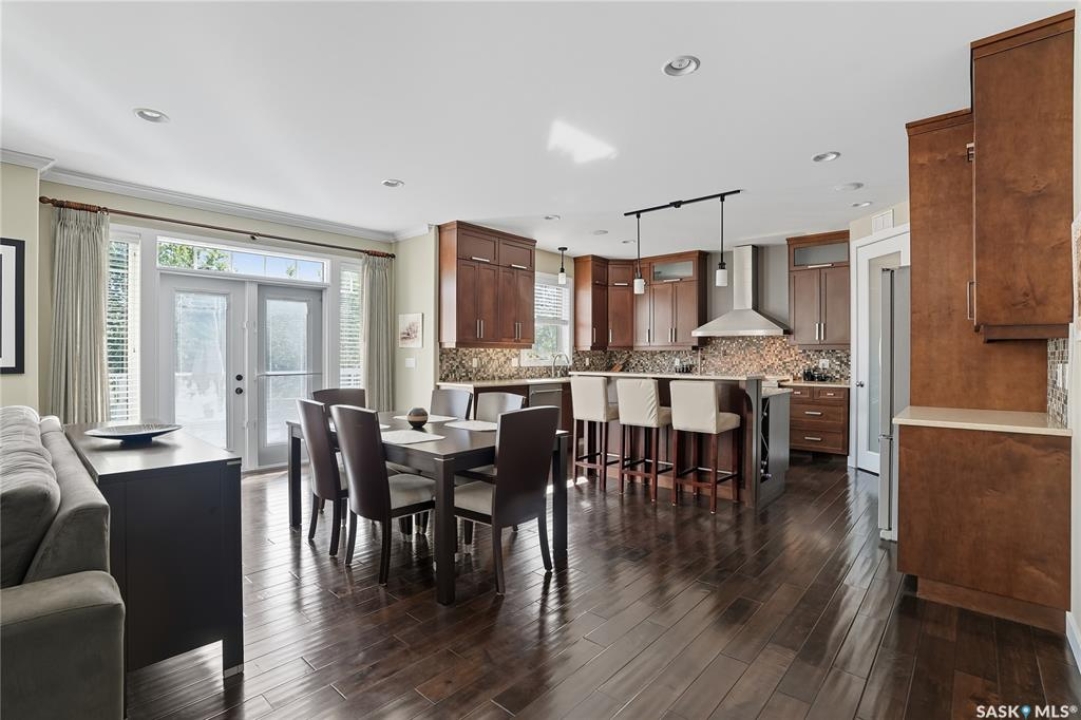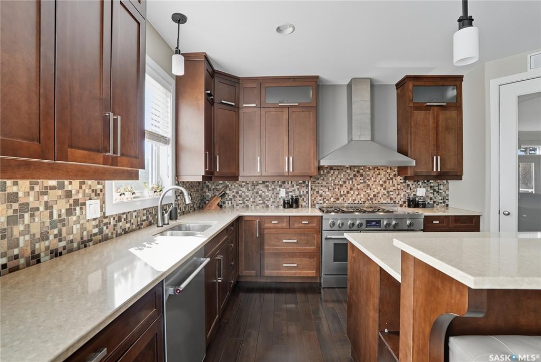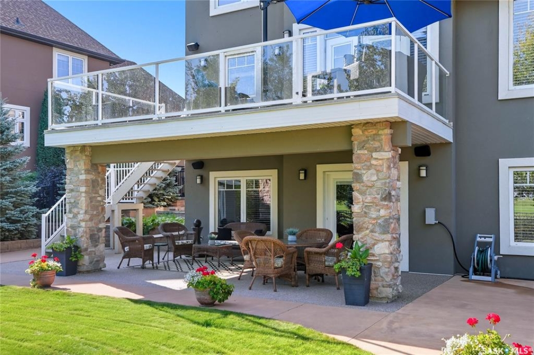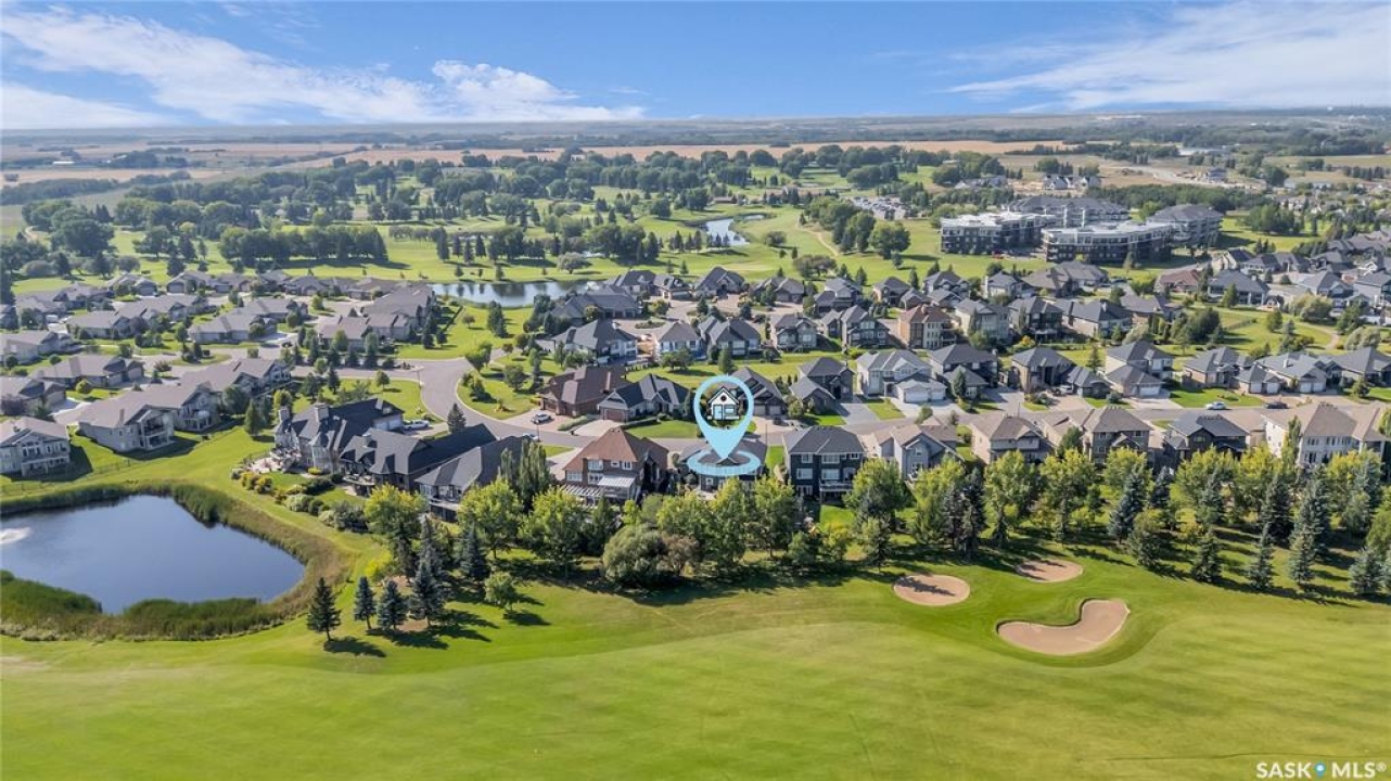 Welcome to 69-602 Cartwright Street – Luxury Living in The Willows Experience refined elegance in this immaculate 2,539 sq ft walkout two-storey, ideally located in Saskatoon's premier golf community, The Willows. Backing the lush fairways, this professionally landscaped home offers exceptional design, upscale finishes, and seamless indoor-outdoor living. Step into a grand tiled foyer with French doors leading to a stylish main-floor office/den. The open-concept living area is warm and inviting, with gleaming hardwood floors, recessed lighting, and built-in surround sound. A stunning gas fireplace with stone surround and wood mantle anchors the living room, creating a cozy yet sophisticated atmosphere. The chef-inspired kitchen showcases custom maple cabinetry, quartz countertops, a large island with raised eating bar, built-in wine rack, pot filler, and a premium 48” Jenn-Air gas range with industrial-grade exterior-vented hood. Under-cabinet lighting, a tiled backsplash, and corner pantry complete the space. The dining area opens to an east-facing deck with built-in speakers, gas BBQ hook-up, and sweeping golf course views. Upstairs, retreat to a luxurious primary suite with French door entry, spa-like ensuite featuring dual vanities, makeup station, tiled steam shower, and walk-in closet. Two additional bedrooms, a 4-piece bath, and a well-appointed laundry room with cabinetry and sink complete this level. The fully developed walkout basement includes a spacious family room with wet bar, 4th bedroom, 3-piece bath, and a flex room/den. Step out to a covered patio with exposed aggregate, speakers, firepit, hot tub (new cover 2025), pergola, and beautifully landscaped yard with shed and underground sprinklers. Additional features: 9' ceilings, solid 8' doors, upgraded trim, Control4 system, heated triple garage, zone heating, hot water heater (2025), central air/vac, and in-floor heat in bathrooms. Luxury, comfort, and location—this home has it all.