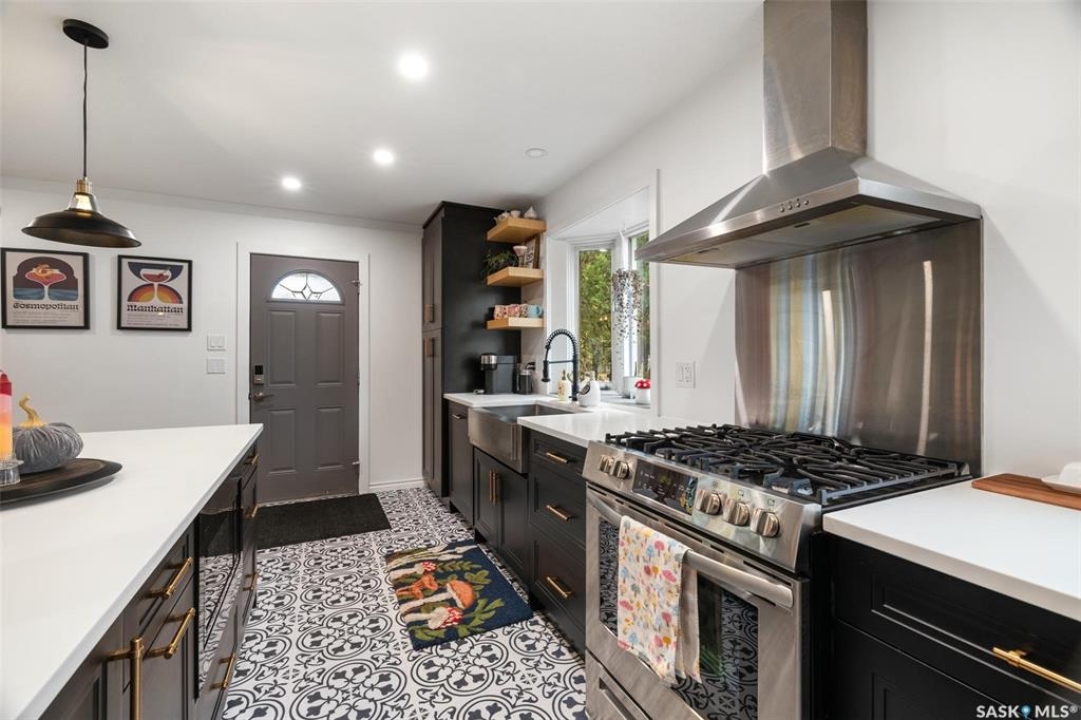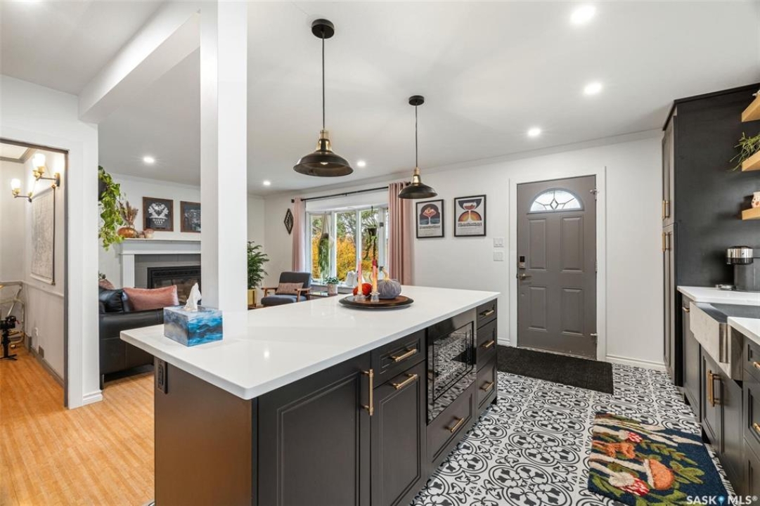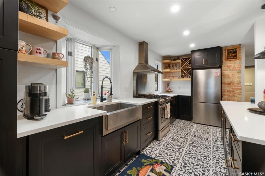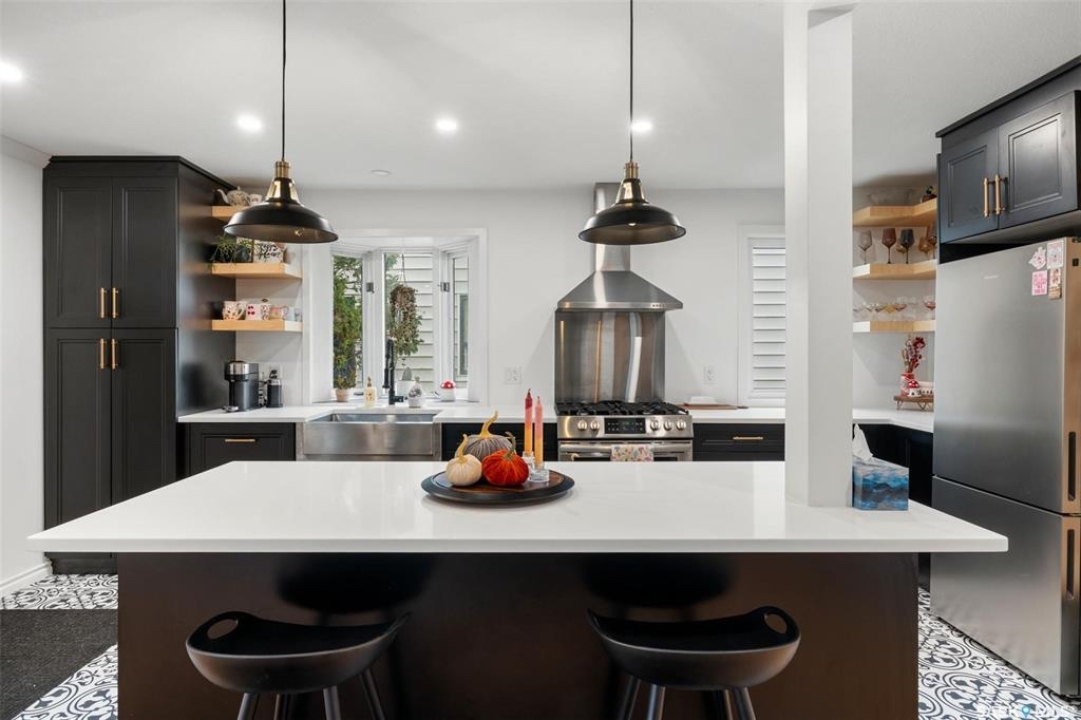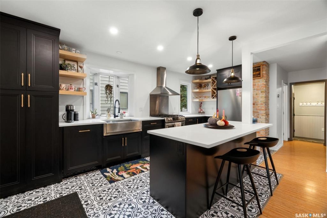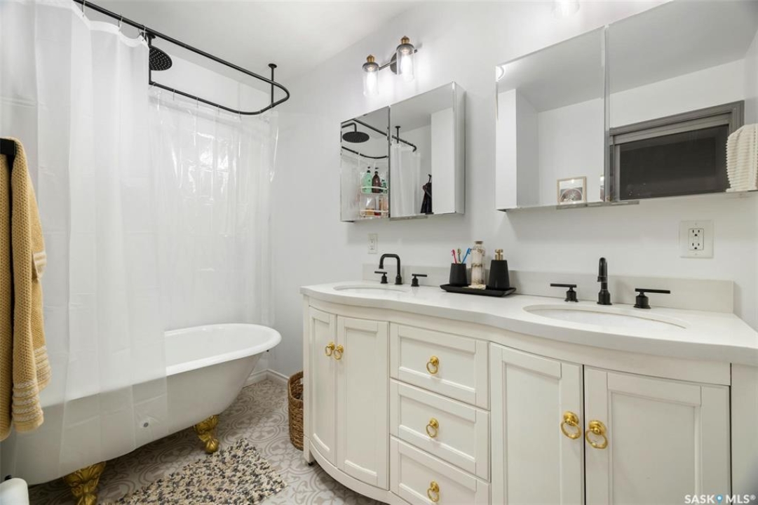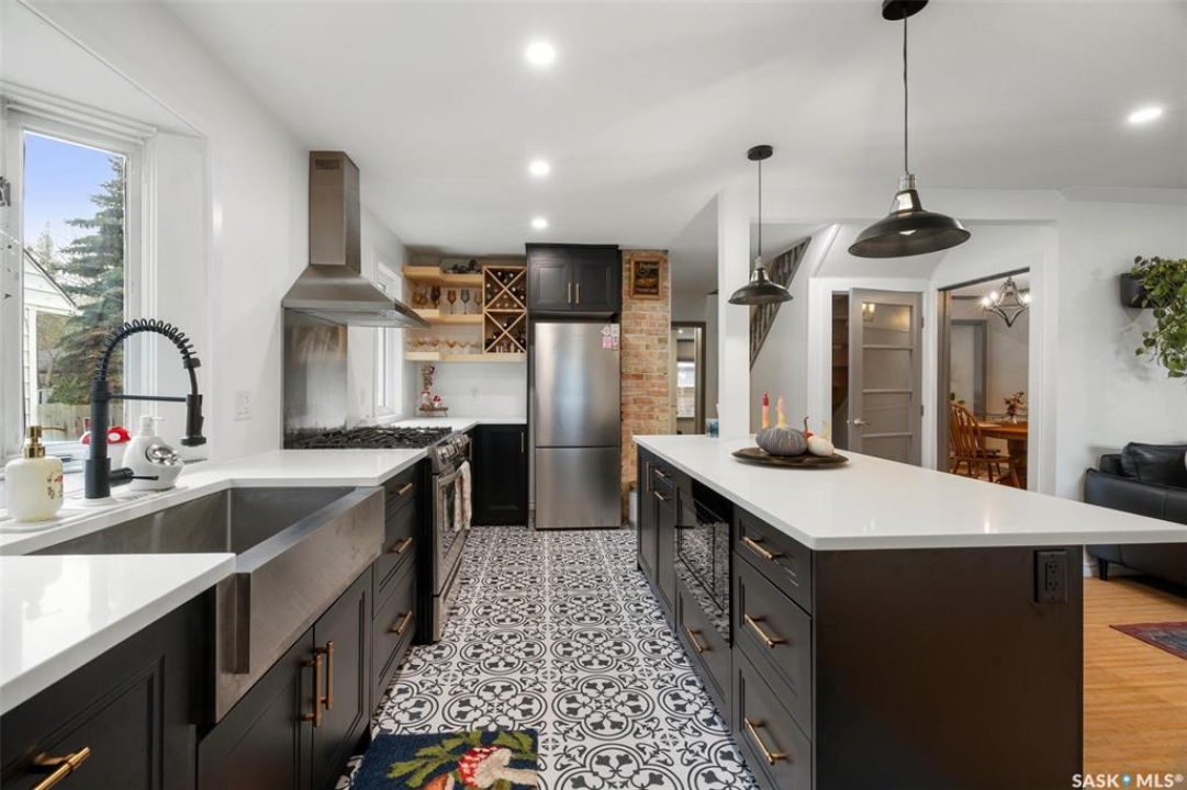 Timeless character and modern design come together in this beautifully renovated 2,049 sq ft home in the highly desirable area of River Heights. 2808 Montague is set on a large 5,715 sq. ft. lot, and this property provides both comfort and space inside and out. The main floor features a renovated kitchen designed with striking black shaker cabinets, quartz countertops, a gas stove, and a stainless steel farmhouse apron sink. The black and white patterned vinyl tile adds a touch of vintage charm, tying together the kitchen's modern-meets-classic aesthetic. The inviting living room showcases a traditional mantle with a gas fireplace, while the dining room exudes character with its bay window and ceiling medallion, adding architectural detail and warmth. A secondary sunk-in living room offers an additional gathering space, complete with an electric fireplace - perfect for those cozy evenings. Practicality meets design in the spacious mudroom, which includes main-floor laundry and garden doors leading to the backyard and deck, ideal for relaxing or entertaining. A convenient powder room with a pedestal sink completes the main floor. Upstairs, the primary bedroom impresses with vaulted 10-foot ceilings and its own gas fireplace, creating a luxurious retreat. The adjoining sunroom is a standout feature - bright, peaceful, and truly special. To top it off, the walk in closet adds the perfect finishing touch. The main bathroom has been thoughtfully renovated with a traditional double-sink vanity and a cast iron clawfoot tub, adding a timeless vintage touch. Two additional well-sized bedrooms complete the upper level. Outside, the double detached heated garage - with two extra adjacent parking spaces - provides ample room for vehicles and storage. Altogether, this home perfectly balances character and comfort, offering versatile living spaces and a thoughtfully updated interior that feels both welcoming and refined.