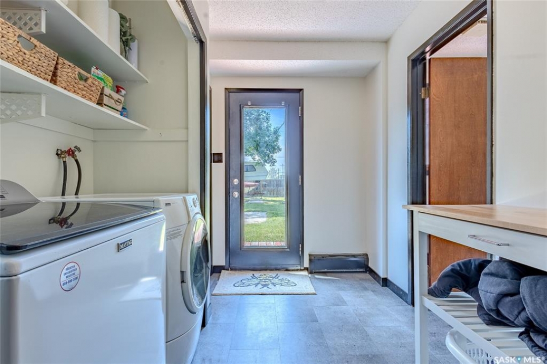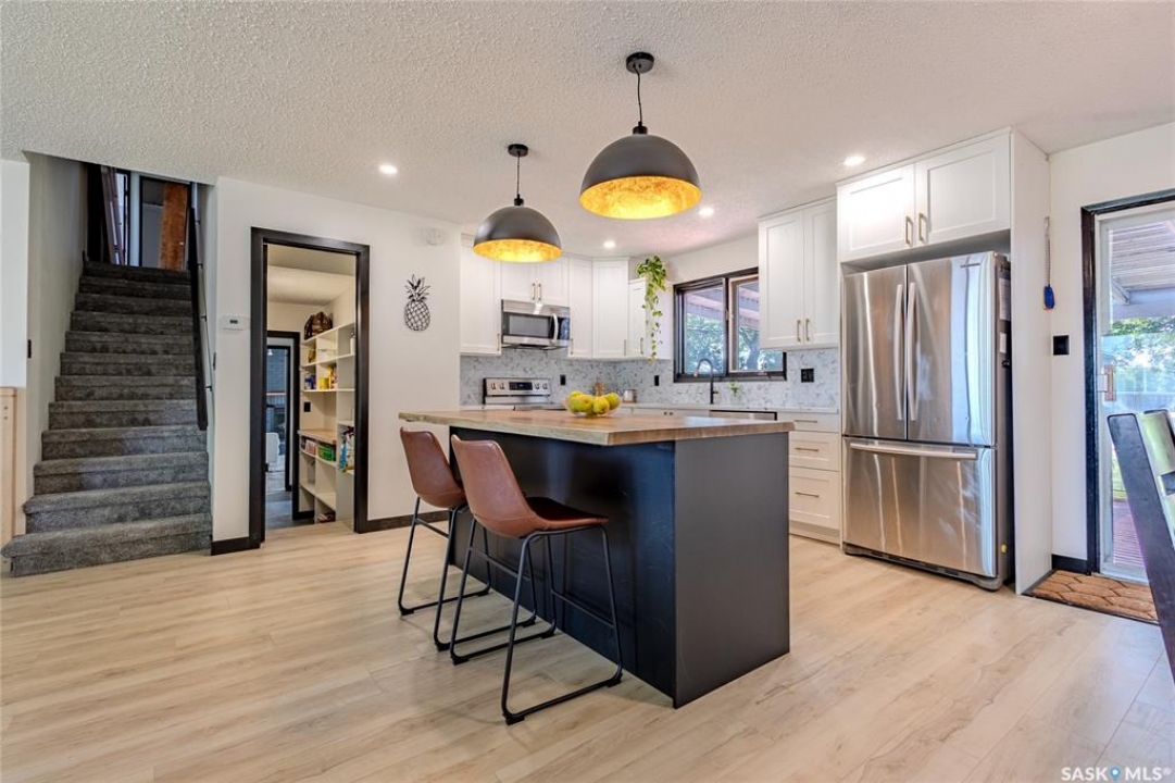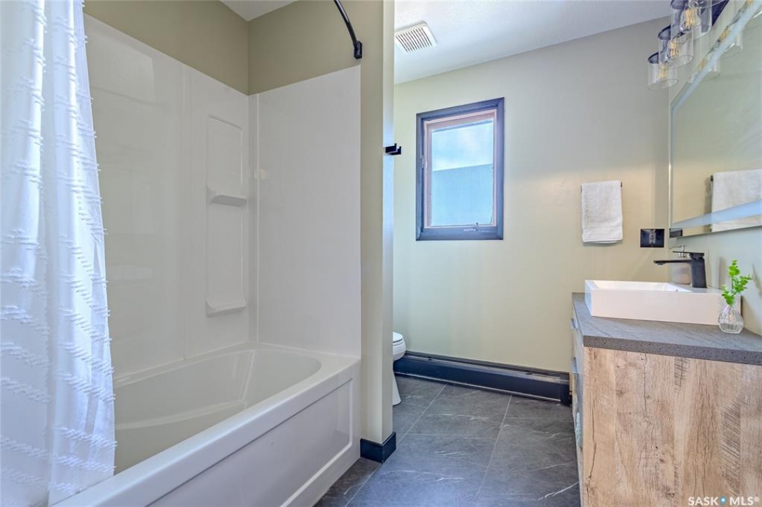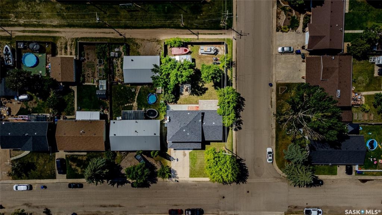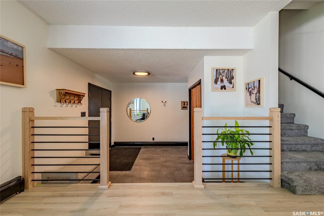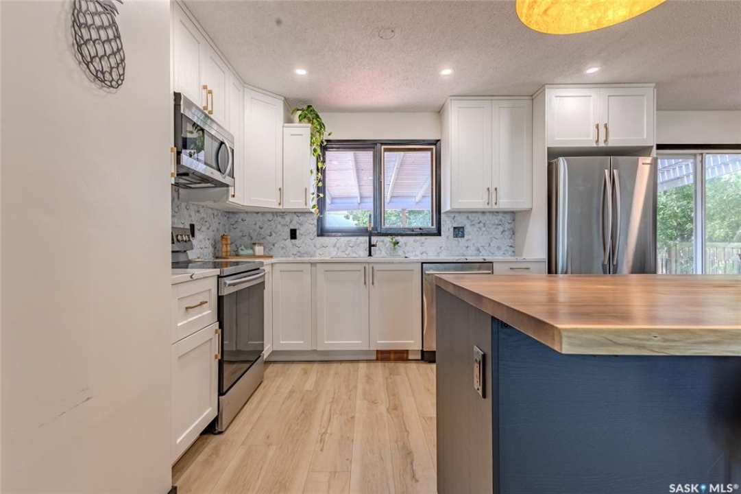 Welcome to this small town gem, perfect for families looking for more value without giving up the convenience of Saskatoon. Just a short drive from the city, this home gives you the space, comfort, and community feel that's hard to find in the city at this price point. This home is ideally situated on a large lot backing the park and high school, perfect for growing families. Step into a spacious front entry that leads up to a stunningly renovated main floor featuring new laminate flooring and a bright bay window in the living room. The updated kitchen has a black butcher block eat-up island, quartz countertops, under-cabinet lighting, backsplash, stainless steel appliances, and a double undermount sink. A functional walkthrough pantry connects to the rear mudroom with main floor laundry and a convenient two-piece bath. The adjacent dining area offers direct access to the back deck, while a cozy family room with wood-burning fireplace and additional patio doors provides a second main floor gathering space. Upstairs, you'll find three bedrooms with new carpet including a spacious primary suite with a walkthrough closet and a luxurious en-suite featuring a double vanity, freestanding tub, and oversized shower. The partially finished basement includes a fourth bedroom, rec room, storage, and a bonus room perfect for a play area or indoor hockey practice. The large backyard is fully fenced with a gate for RV access, a storage shed, and plenty of room to play. A double attached heated garage completes this fantastic property, ready for a new family to call it home! Contact your Realtor today to schedule a private showing.