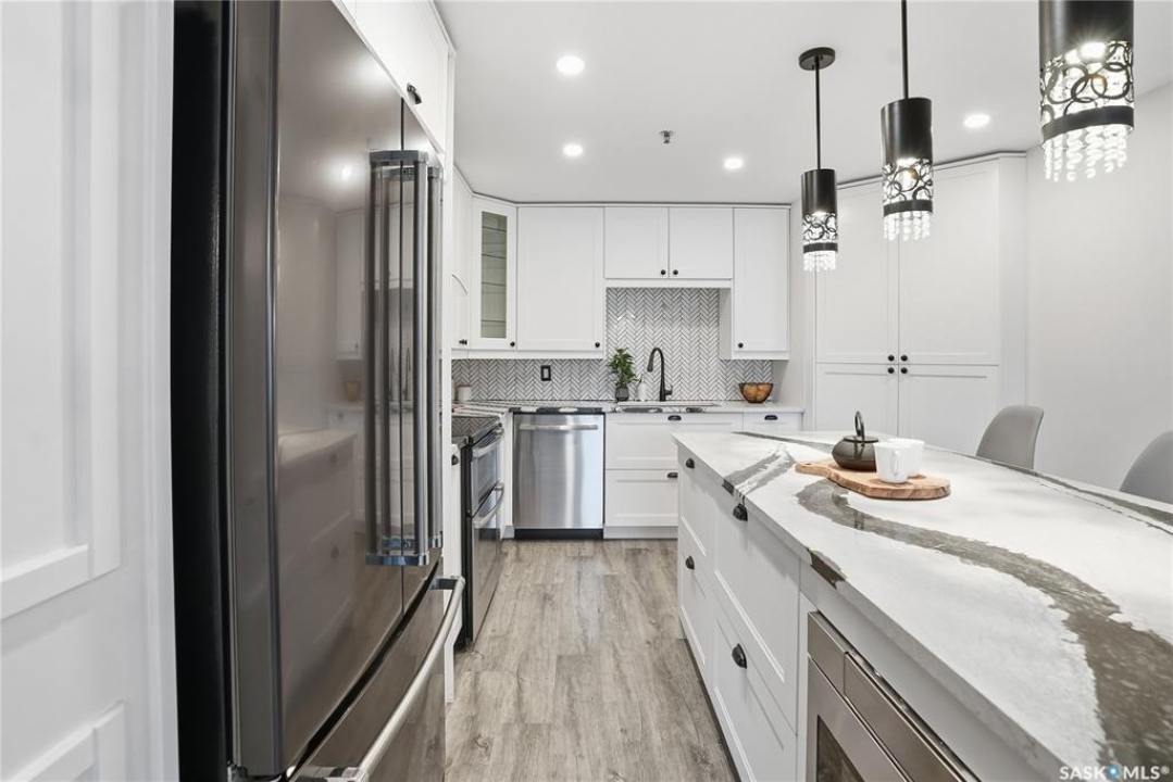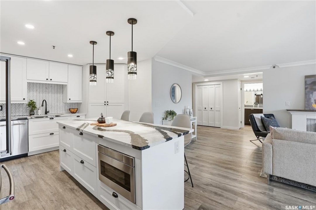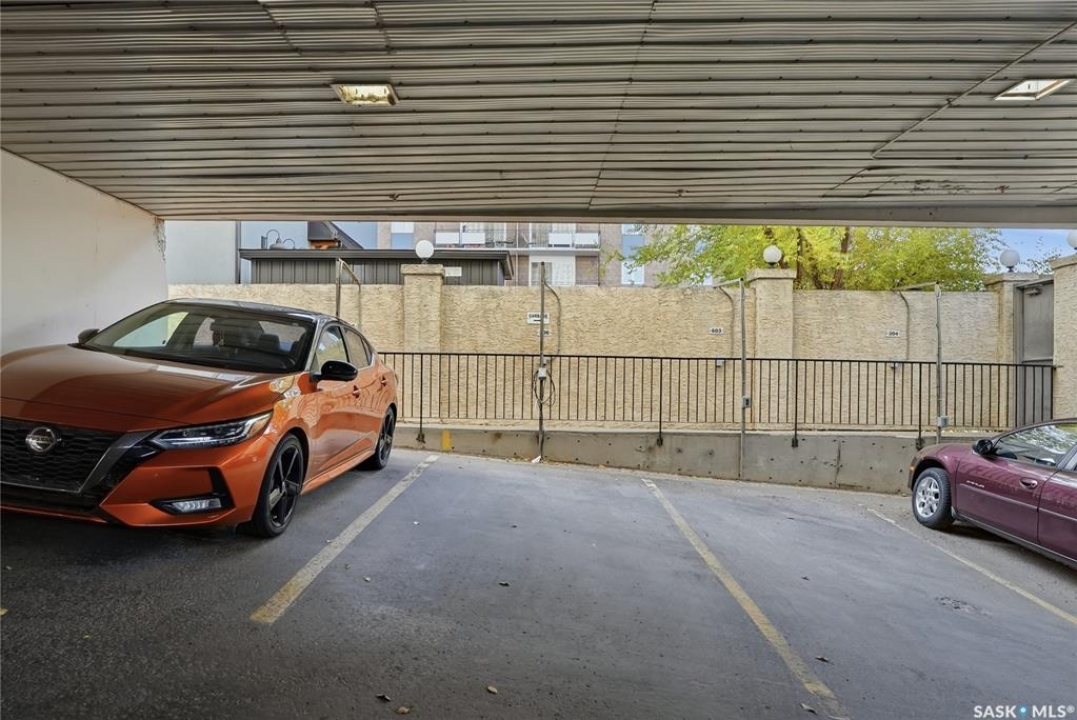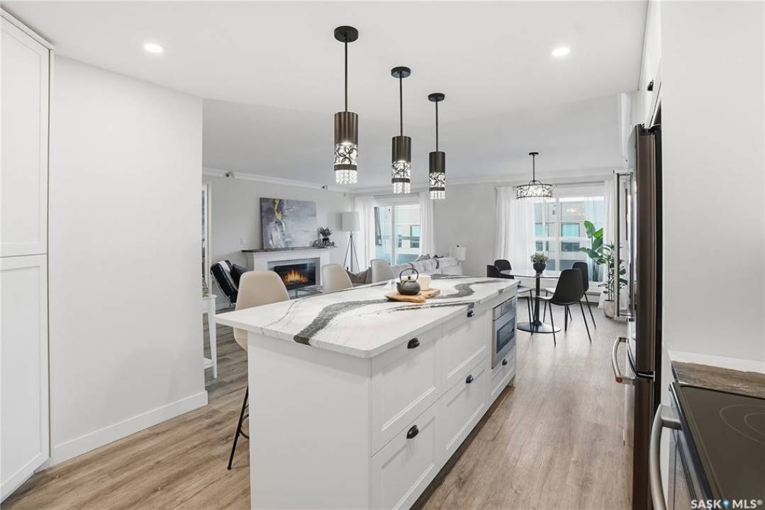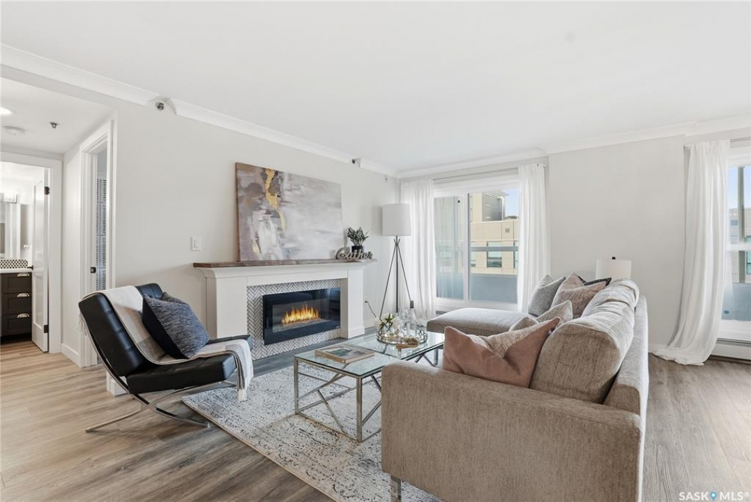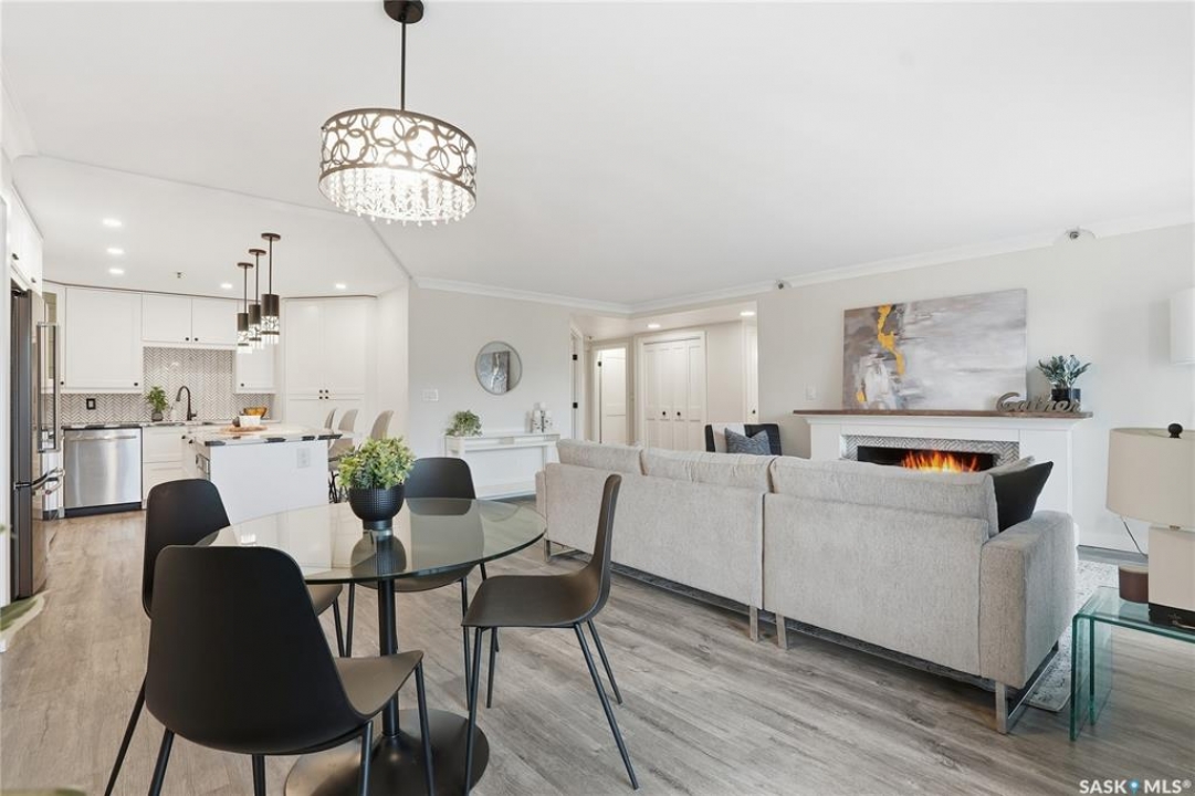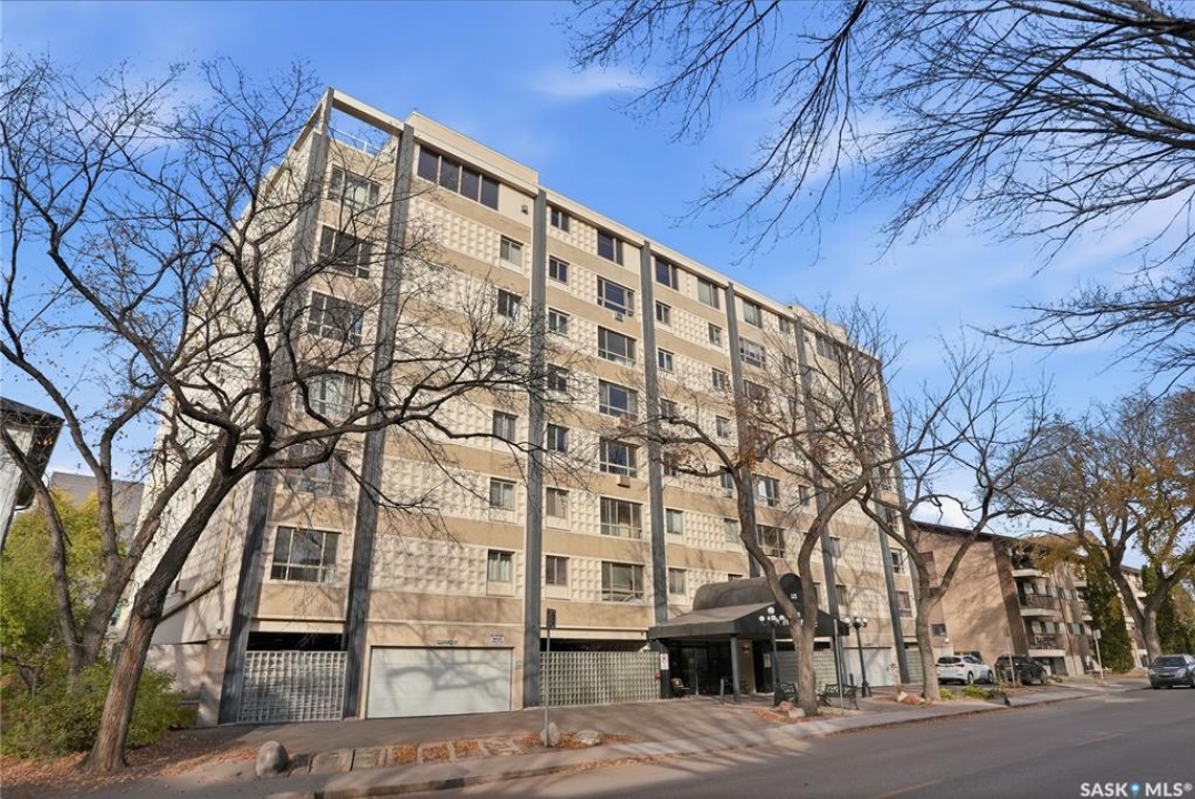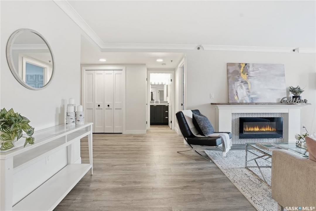 Welcome to The Wycliffe – A Rare City Park Gem! Experience modern elegance and timeless charm in this immaculate, 2-bedroom, 2-bathroom+den executive condo located in the heart of downtown Saskatoon. With over 1,475 sq.ft. of beautifully renovated living space, this third-floor suite offers the perfect blend of sophistication, comfort, and convenience at an unbeatable price! Step inside to discover a custom-designed kitchen featuring quartz countertops, a sleek tile backsplash, stainless steel appliances, and a massive island with seating — ideal for entertaining or everyday living. The kitchen opens seamlessly into a spacious living area, where a cozy fireplace with a classic live-edge mantle sets the tone for relaxed evenings at home. The primary suite is a true retreat, complete with a large walk-in closet and a stunning ensuite boasting a tiled glass shower. A second generous bedroom and a fully renovated 4-piece bath provide the perfect guest wing. Working from home? The private den with French doors offers the perfect quiet workspace. Highlights include: Covered breezeway deck – a unique feature of this unit, ideal for morning coffee or evening relaxation, crown molding throughout with newer paint, flooring, and trim, newer fridge and washer and dryer, newer windows and doors, wide hallways, and two elevators for convenience, covered parking stall included, beautifully maintained building with rooftop patio and welcoming common area. Perfectly positioned in Saskatoon's highly sought-after City Park neighborhood, you're just steps from the river, downtown core, Earls restaurant, shopping, and City Hospital. All buyers/buyer's agents to verify measurements. This condo must be seen to be appreciated – opportunities like this are rare! Book your private showing today.