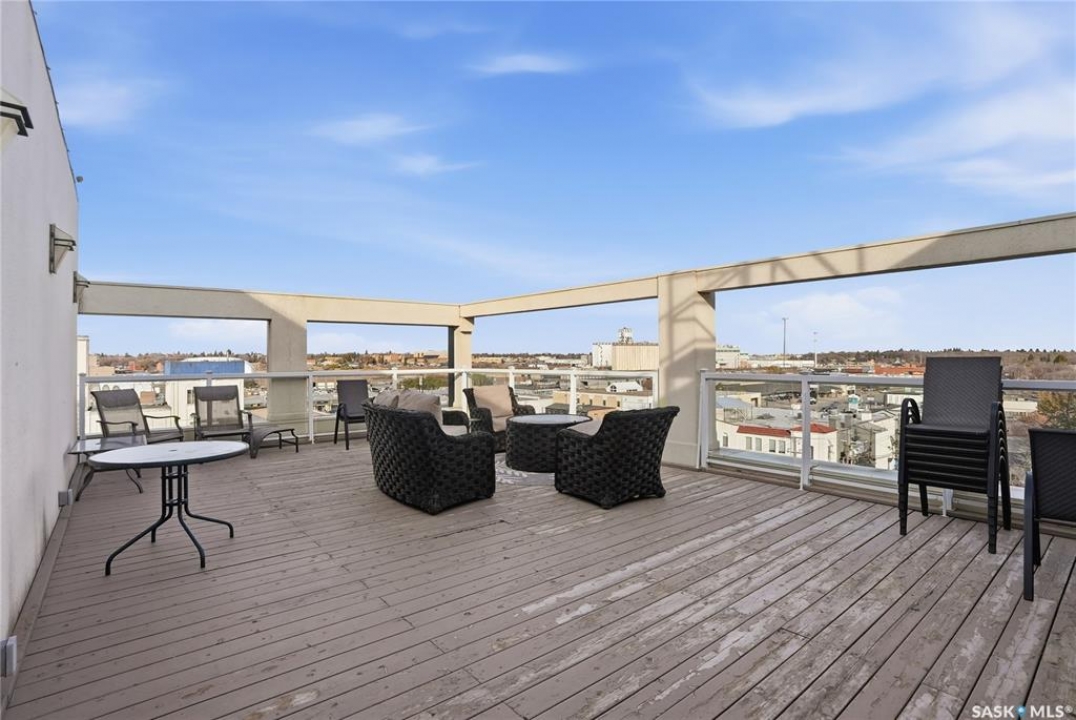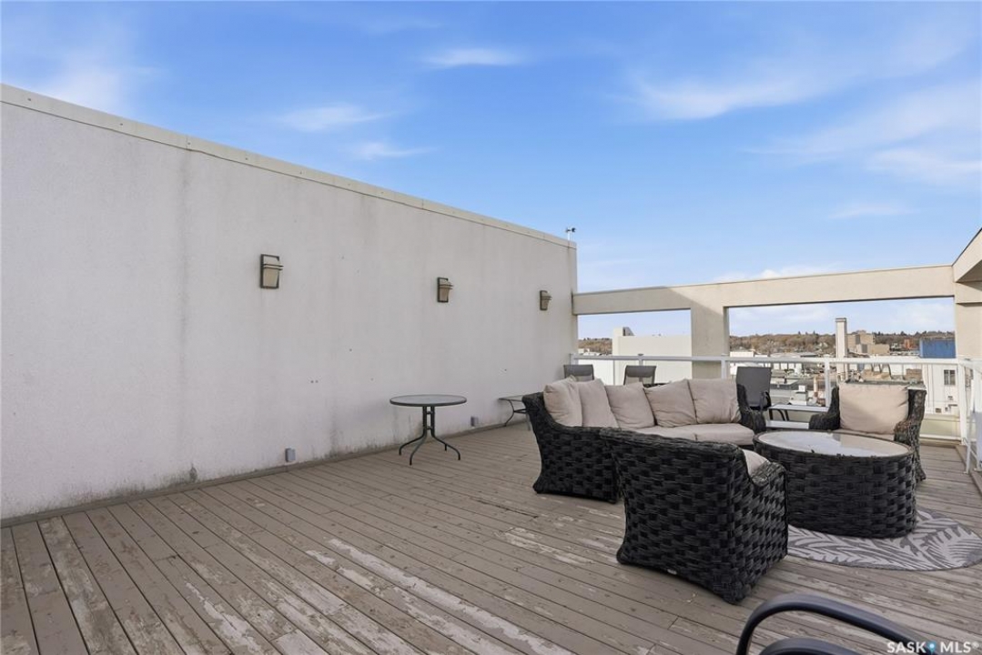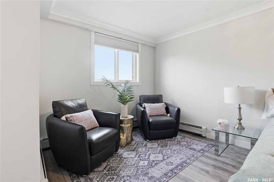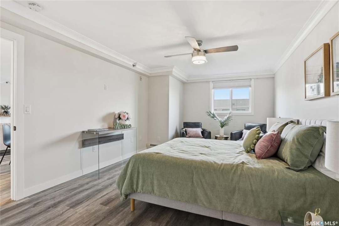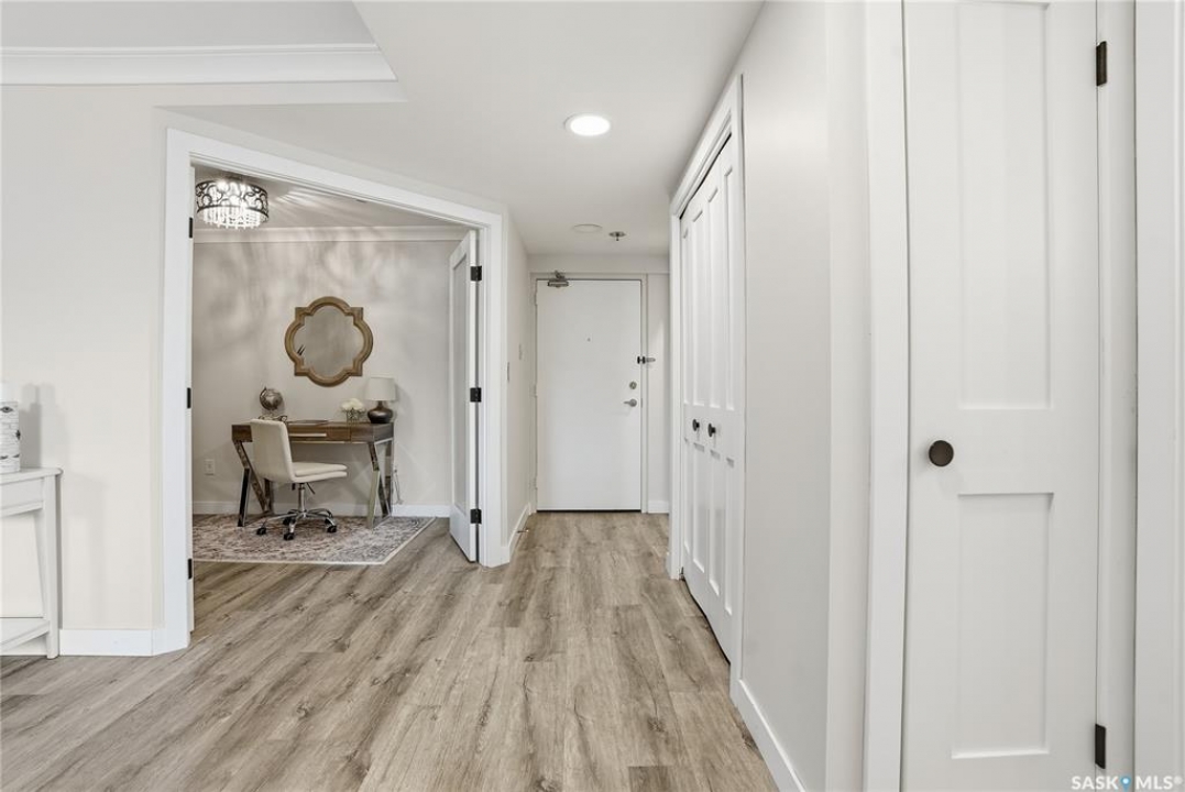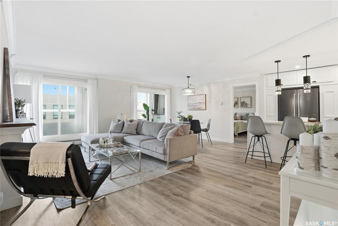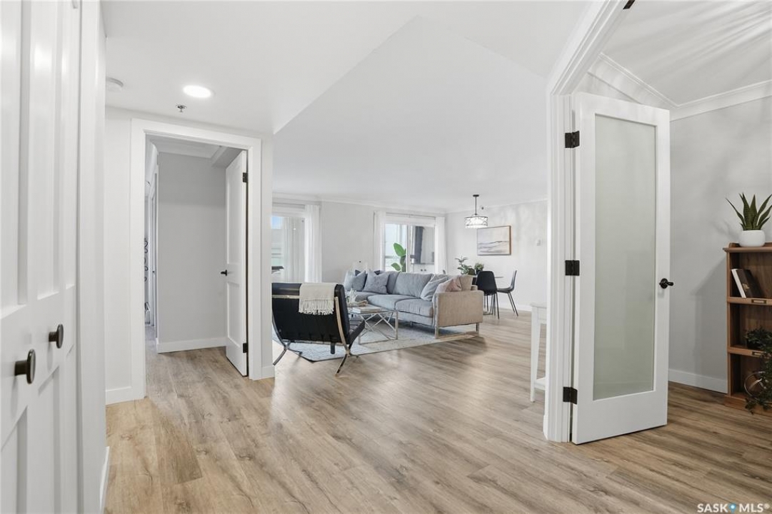 Welcome to The Wycliffe – A Rare City Park Gem! Experience modern elegance and timeless charm in this immaculate, 2-bedroom, 2-bathroom+den executive condo located in the heart of downtown Saskatoon. With over 1,475 sq.ft. of beautifully renovated living space, this third-floor suite offers the perfect blend of sophistication, comfort, and convenience at an unbeatable price! Step inside to discover a custom-designed kitchen featuring quartz countertops, a sleek tile backsplash, stainless steel appliances, and a massive island with seating — ideal for entertaining or everyday living. The kitchen opens seamlessly into a spacious living area, where a cozy fireplace with a classic live-edge mantle sets the tone for relaxed evenings at home. The primary suite is a true retreat, complete with a large walk-in closet and a stunning ensuite boasting a tiled glass shower. A second generous bedroom and a fully renovated 4-piece bath provide the perfect guest wing. Working from home? The private den with French doors offers the perfect quiet workspace. Highlights include: Covered breezeway deck – a unique feature of this unit, ideal for morning coffee or evening relaxation, crown molding throughout with newer paint, flooring, and trim, newer fridge and washer and dryer, newer windows and doors, wide hallways, and two elevators for convenience, covered parking stall included, beautifully maintained building with rooftop patio and welcoming common area. Perfectly positioned in Saskatoon's highly sought-after City Park neighborhood, you're just steps from the river, downtown core, Earls restaurant, shopping, and City Hospital. All buyers/buyer's agents to verify measurements. This condo must be seen to be appreciated – opportunities like this are rare! Book your private showing today.