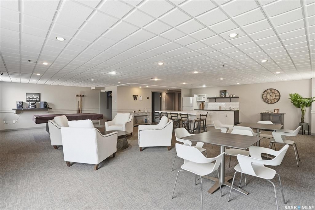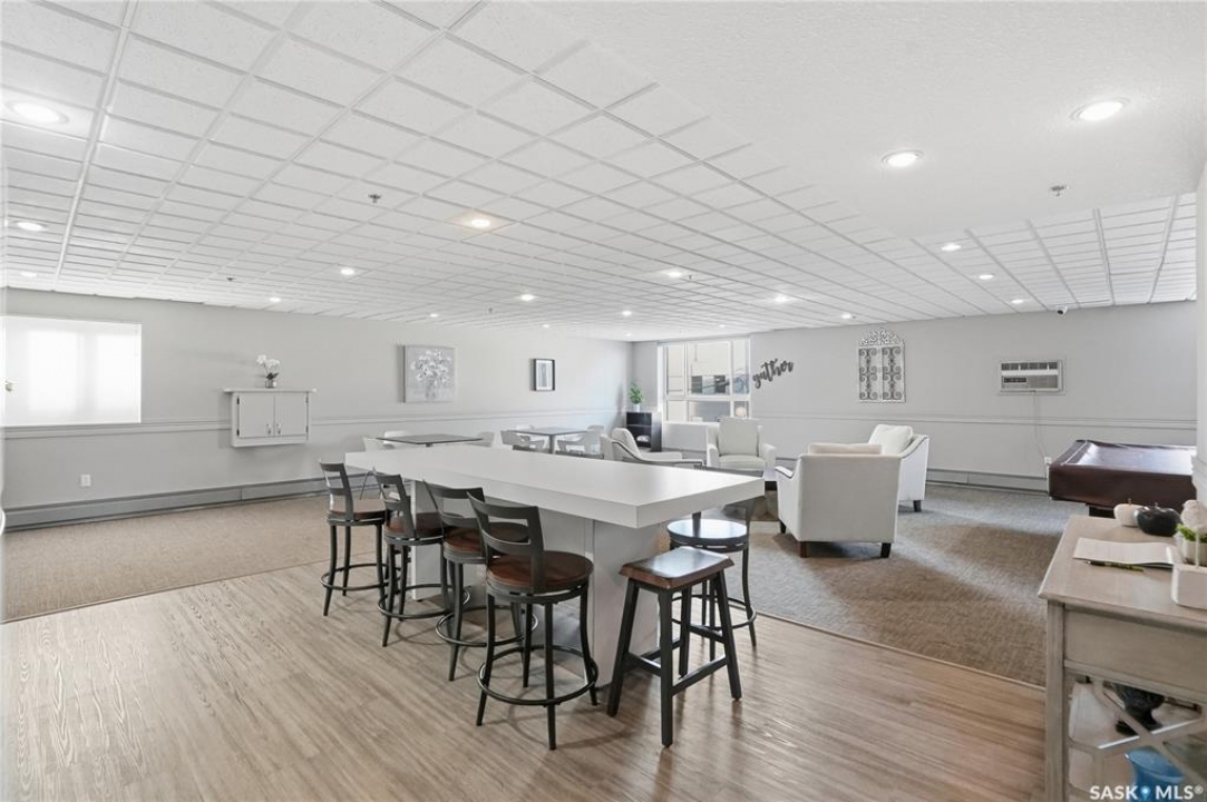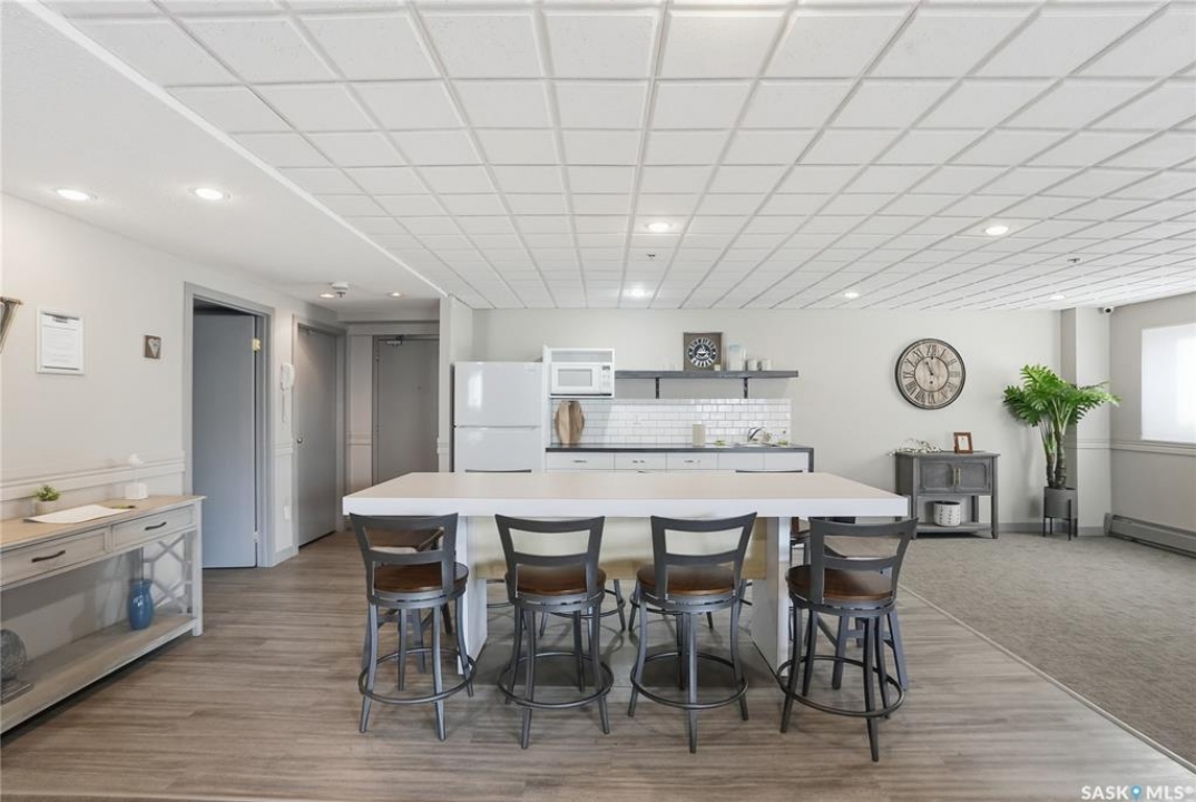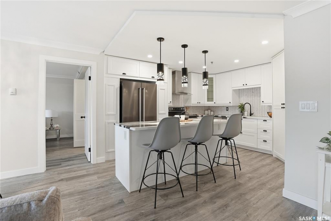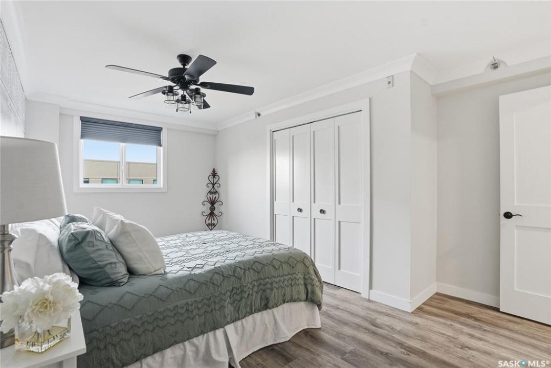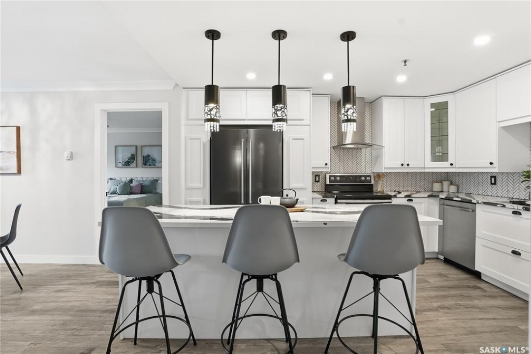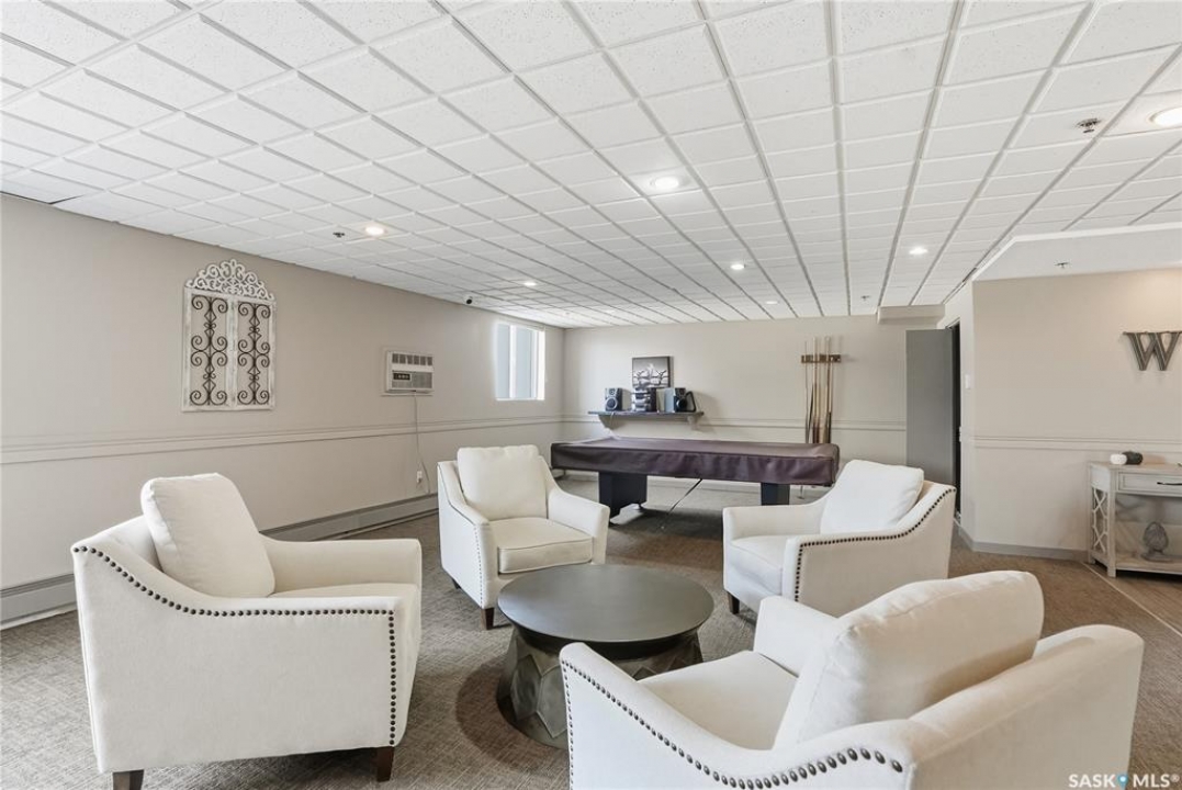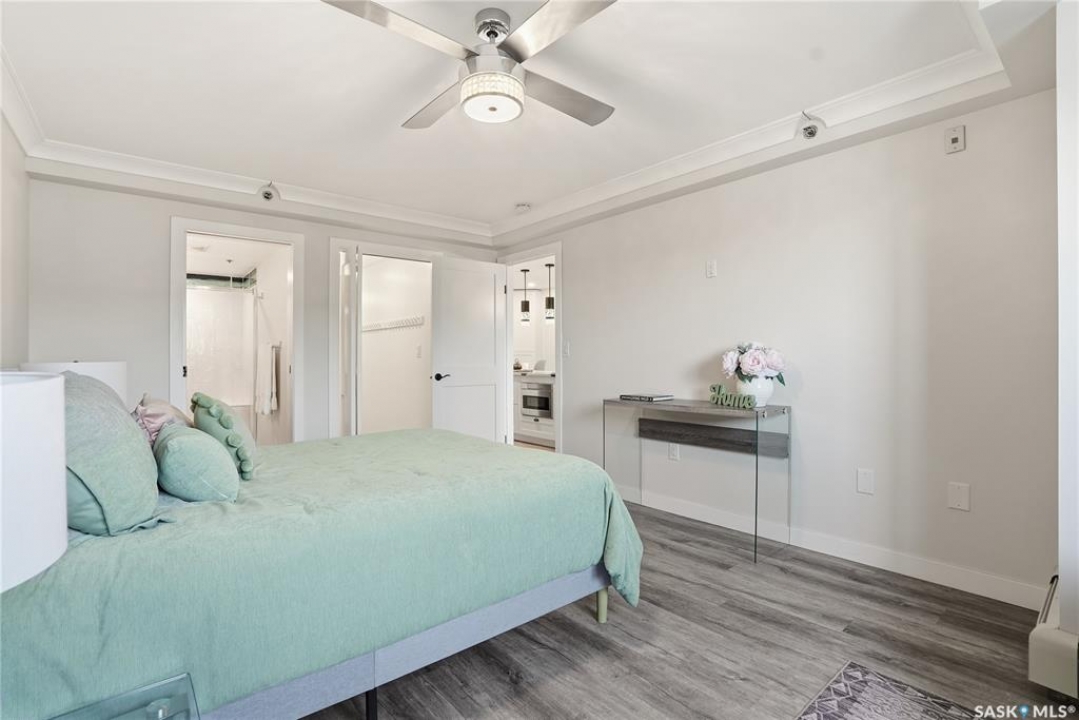 Welcome to The Wycliffe – A Rare City Park Gem! Experience modern elegance and timeless charm in this immaculate, 2-bedroom, 2-bathroom+den executive condo located in the heart of downtown Saskatoon. With over 1,475 sq.ft. of beautifully renovated living space, this third-floor suite offers the perfect blend of sophistication, comfort, and convenience at an unbeatable price! Step inside to discover a custom-designed kitchen featuring quartz countertops, a sleek tile backsplash, stainless steel appliances, and a massive island with seating — ideal for entertaining or everyday living. The kitchen opens seamlessly into a spacious living area, where a cozy fireplace with a classic live-edge mantle sets the tone for relaxed evenings at home. The primary suite is a true retreat, complete with a large walk-in closet and a stunning ensuite boasting a tiled glass shower. A second generous bedroom and a fully renovated 4-piece bath provide the perfect guest wing. Working from home? The private den with French doors offers the perfect quiet workspace. Highlights include: Covered breezeway deck – a unique feature of this unit, ideal for morning coffee or evening relaxation, crown molding throughout with newer paint, flooring, and trim, newer fridge and washer and dryer, newer windows and doors, wide hallways, and two elevators for convenience, covered parking stall included, beautifully maintained building with rooftop patio and welcoming common area. Perfectly positioned in Saskatoon's highly sought-after City Park neighborhood, you're just steps from the river, downtown core, Earls restaurant, shopping, and City Hospital. All buyers/buyer's agents to verify measurements. This condo must be seen to be appreciated – opportunities like this are rare! Book your private showing today.