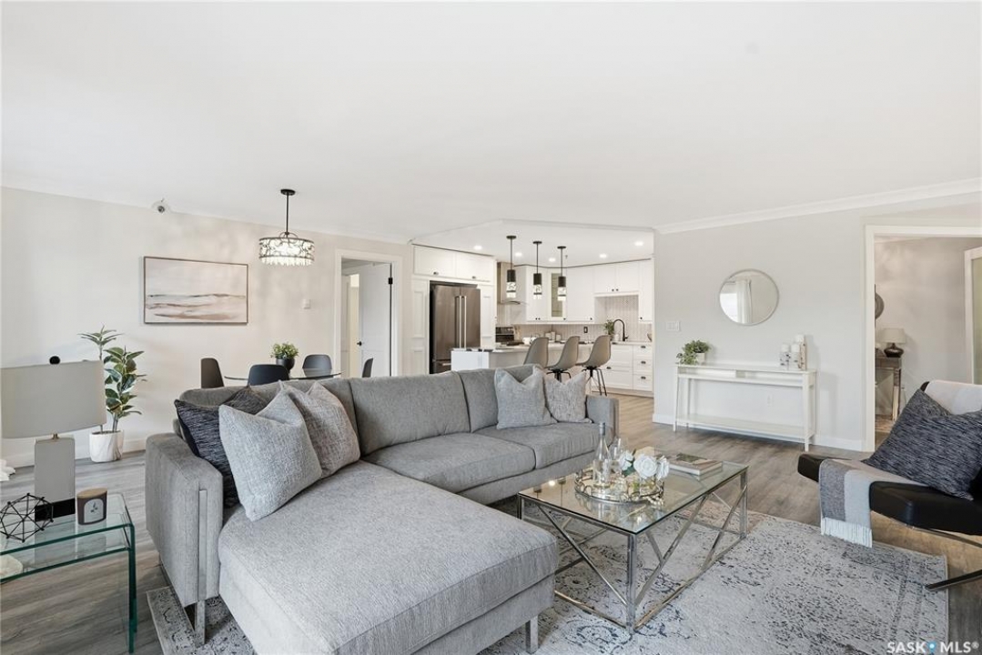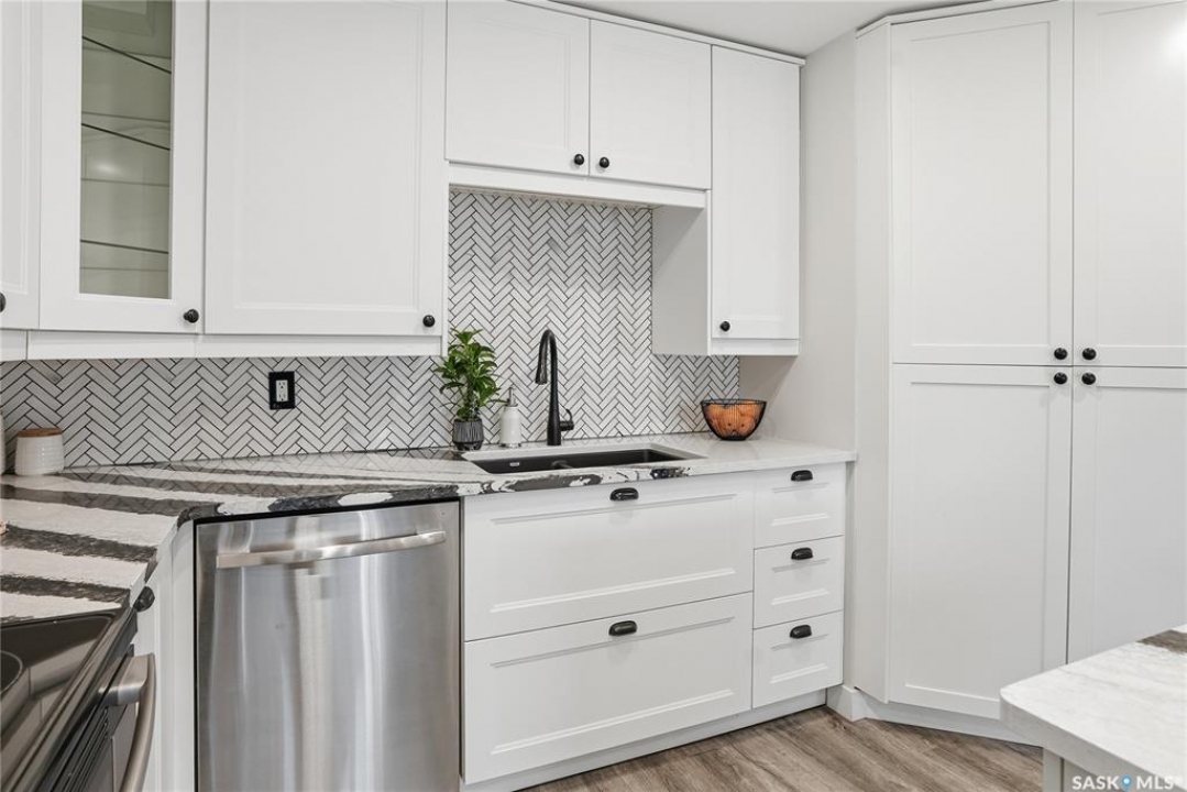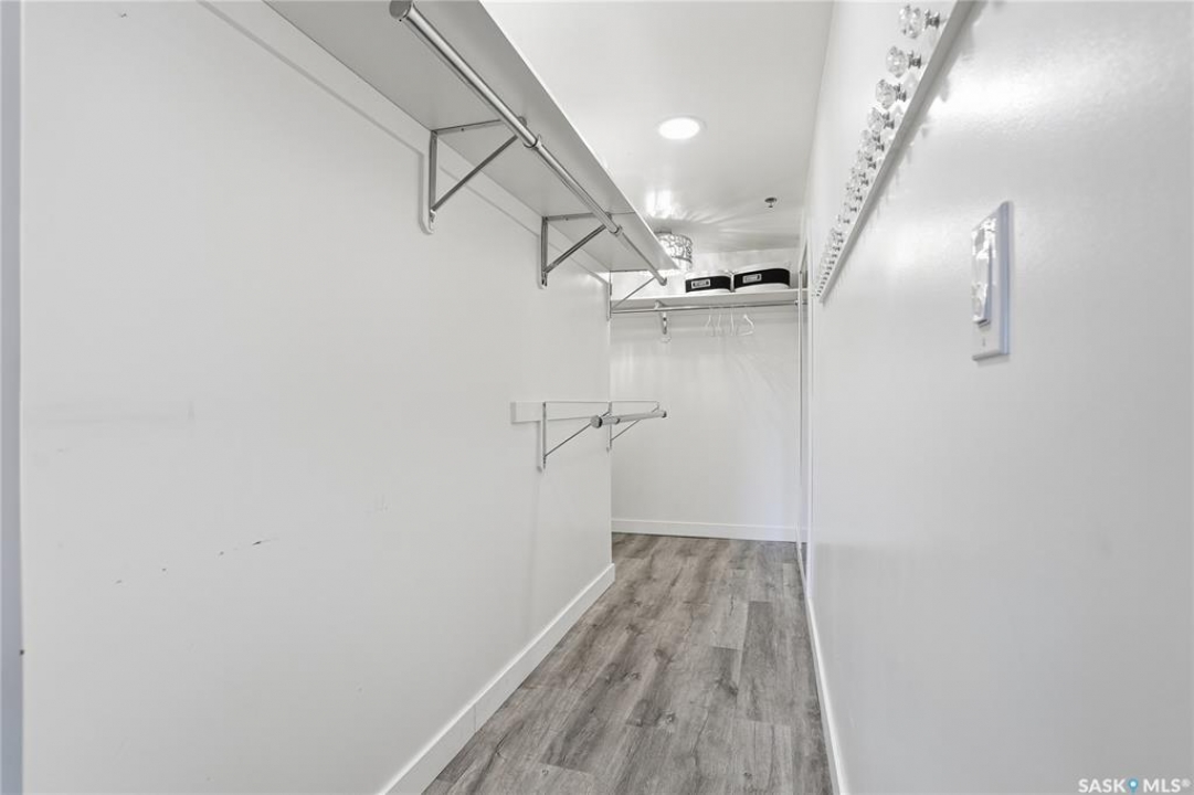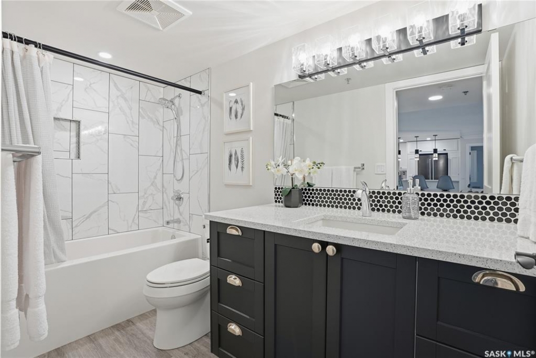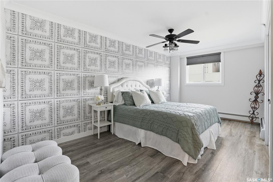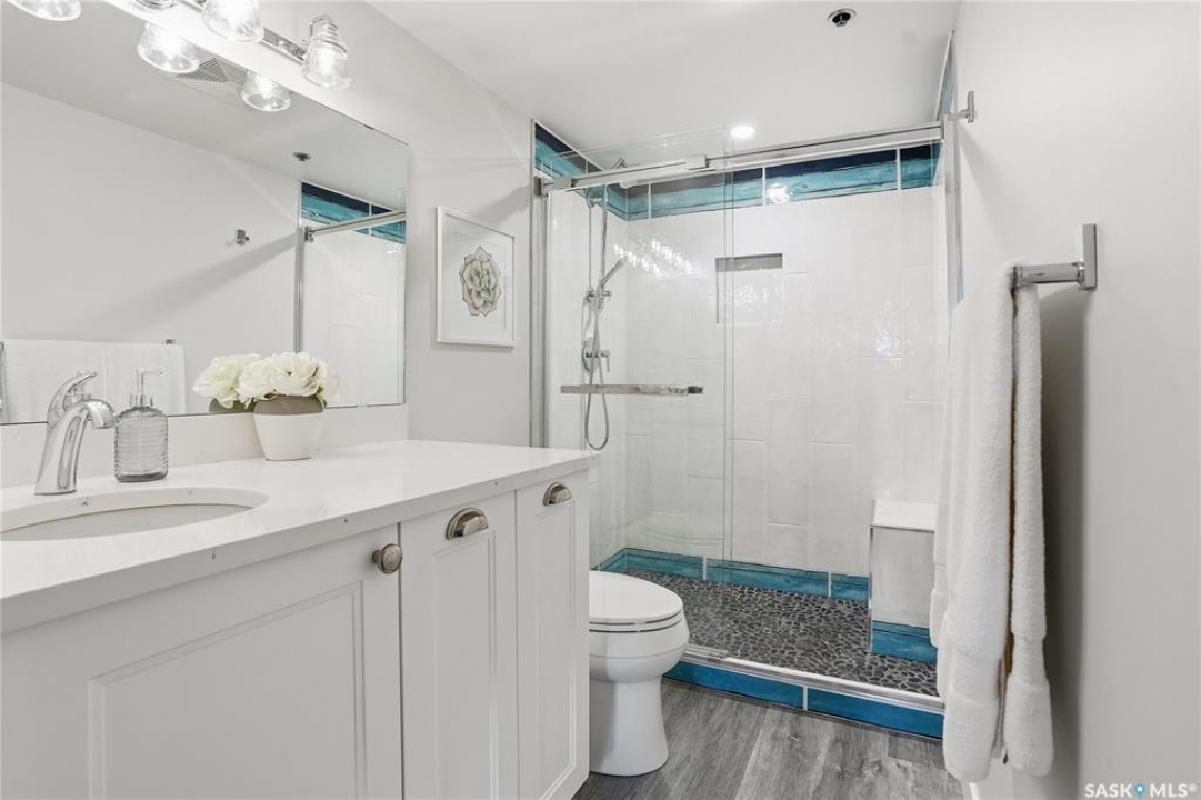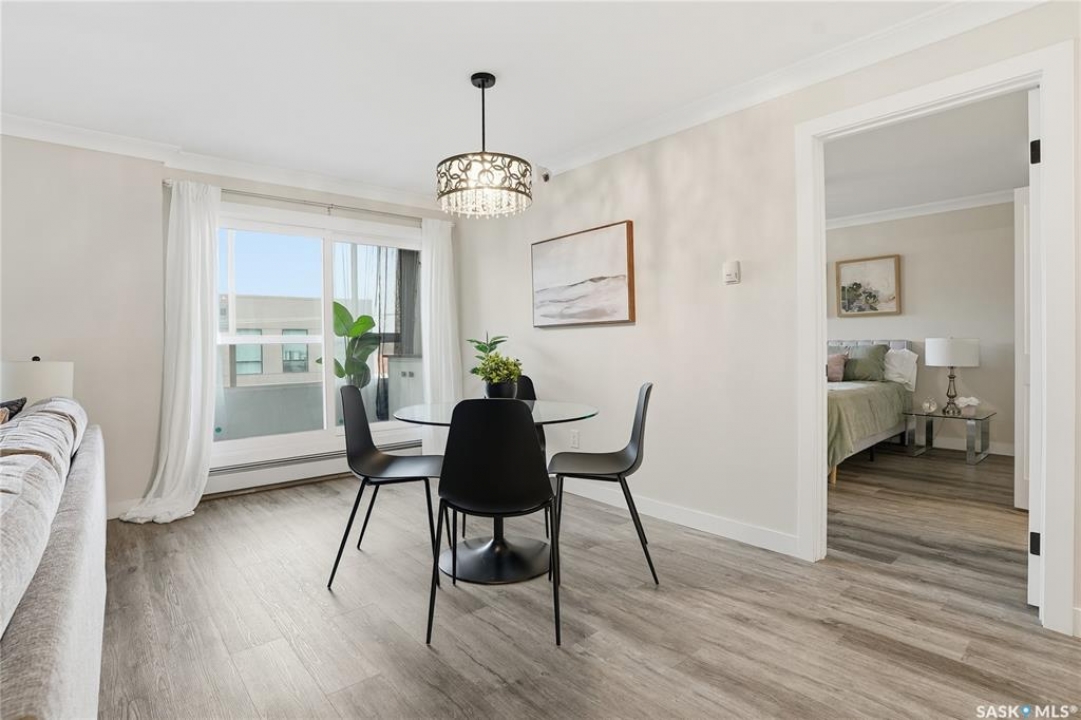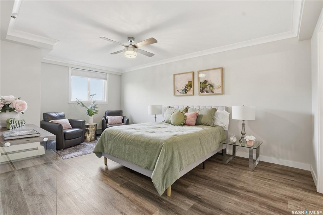Welcome to The Wycliffe – A Rare City Park Gem! Experience modern elegance and timeless charm in this immaculate, 2-bedroom, 2-bathroom+den executive condo located in the heart of downtown Saskatoon. With over 1,475 sq.ft. of beautifully renovated living space, this third-floor suite offers the perfect blend of sophistication, comfort, and convenience at an unbeatable price! Step inside to discover a custom-designed kitchen featuring quartz countertops, a sleek tile backsplash, stainless steel appliances, and a massive island with seating — ideal for entertaining or everyday living. The kitchen opens seamlessly into a spacious living area, where a cozy fireplace with a classic live-edge mantle sets the tone for relaxed evenings at home. The primary suite is a true retreat, complete with a large walk-in closet and a stunning ensuite boasting a tiled glass shower. A second generous bedroom and a fully renovated 4-piece bath provide the perfect guest wing. Working from home? The private den with French doors offers the perfect quiet workspace. Highlights include: Covered breezeway deck – a unique feature of this unit, ideal for morning coffee or evening relaxation, crown molding throughout with newer paint, flooring, and trim, newer fridge and washer and dryer, newer windows and doors, wide hallways, and two elevators for convenience, covered parking stall included, beautifully maintained building with rooftop patio and welcoming common area. Perfectly positioned in Saskatoon's highly sought-after City Park neighborhood, you're just steps from the river, downtown core, Earls restaurant, shopping, and City Hospital. All buyers/buyer's agents to verify measurements. This condo must be seen to be appreciated – opportunities like this are rare! Book your private showing today.