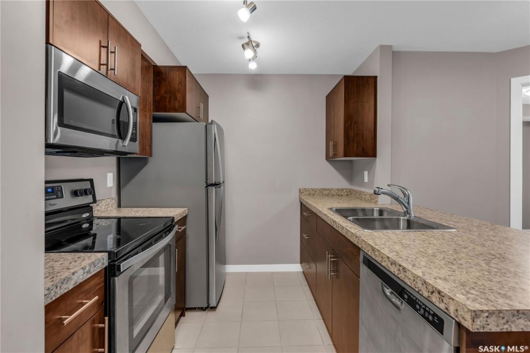 TWO conveniently located parking spots-one underground(32) and one surface stall(22) with immediate possession available on this move-in ready, mint condition 2 bedroom, den and 2 full bath home; upgrades include hardwood in living area, ceramic tile in kitchen and back entry, stainless steel appliances and c/air; Levolor blinds; 2 carbon/smoke detectors replaced; recently cleaned carpets; fridge, stove, washer, dryer, dishwasher, c/air, microwave/range hood included. Water, sewer and heat included in condo fees. Extra hardwood and ceramic tile will be left with unit.