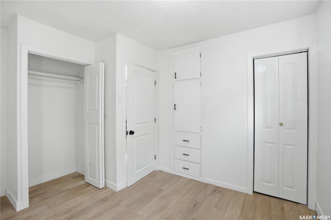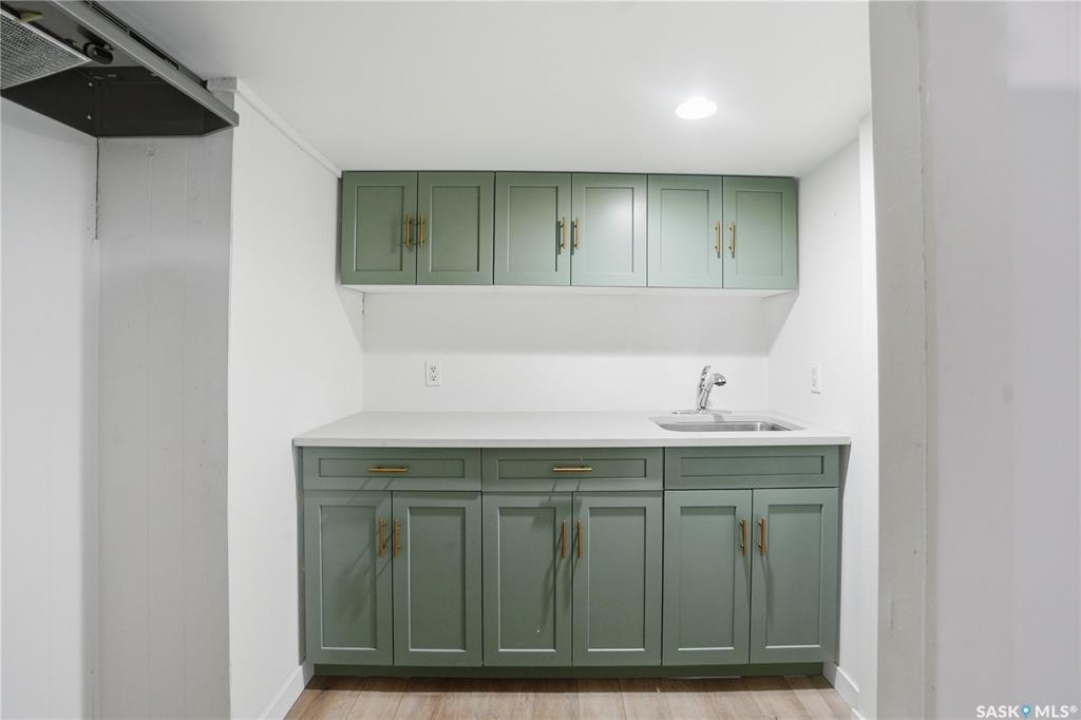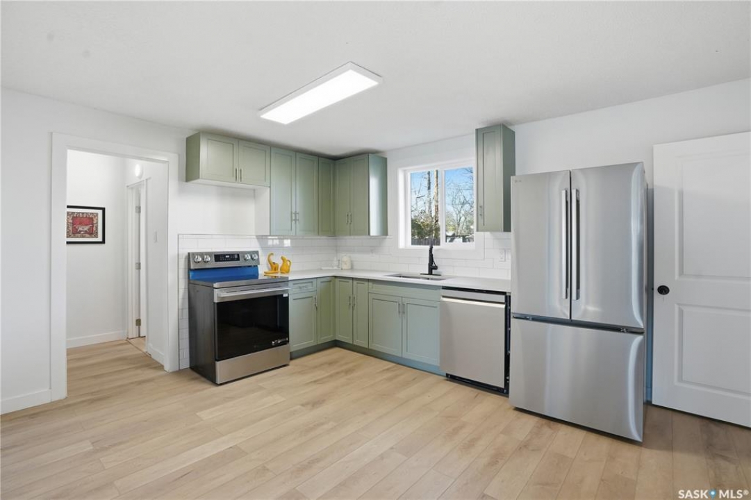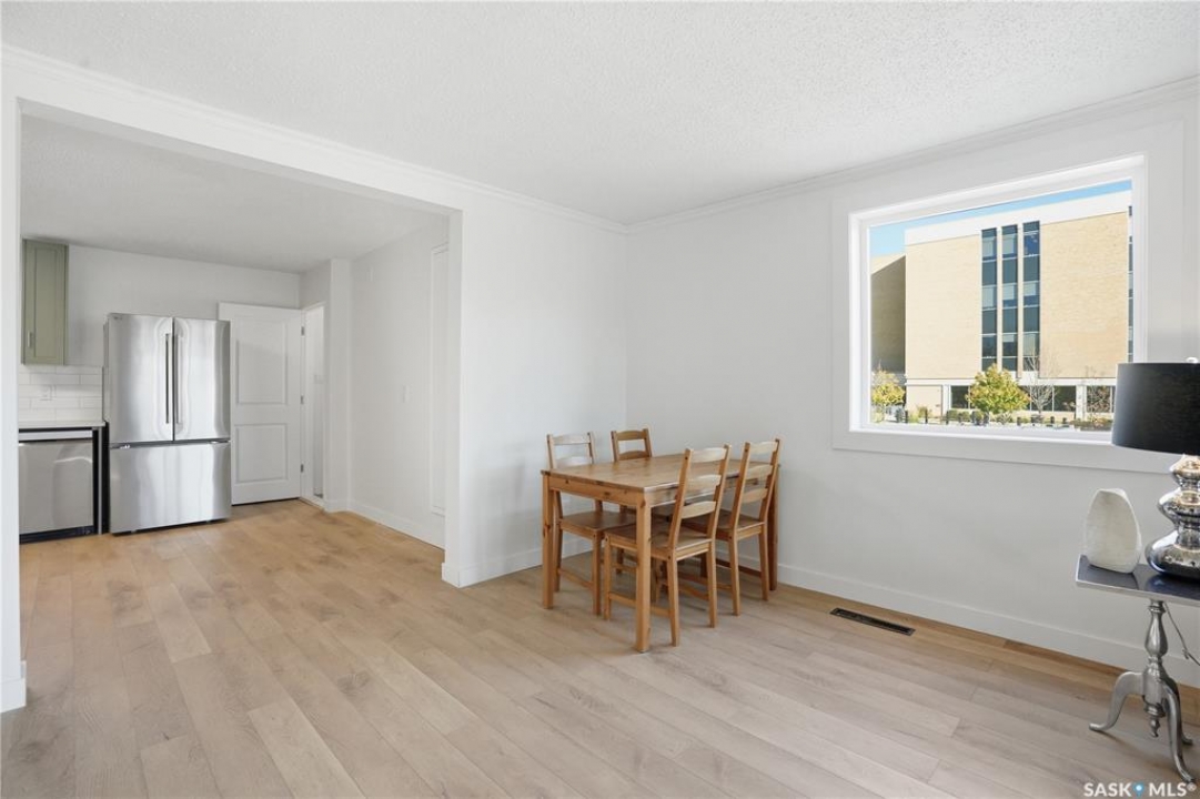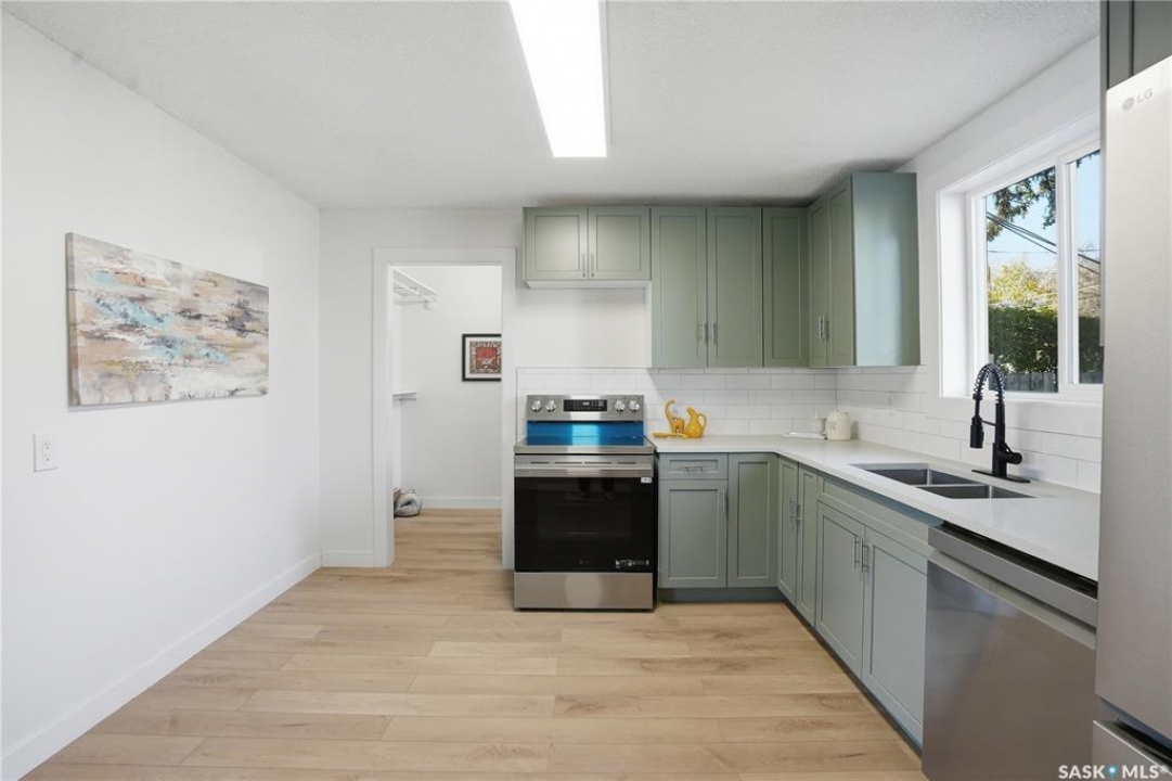 Newly renovated 914 sq ft bungalow in Caswell Hill! Featuring brand-new kitchen cabinets, appliances, flooring, windows, furnace, and hot water tank. The main floor offers two bedrooms, a full modern bathroom, and a spacious living and dining area. The basement has a separate entrance and includes two self-contained units: Unit A with one bedroom, a living room, a kitchen, and a 3-piece bathroom; and Unit B with a living space, a full bathroom, and a counter with sink — perfect as a studio or guest suite. Located directly across the street from Saskatchewan Polytechnic, this property is ideal for families with students or for generating rental income to help with your mortgage! Double detached garage is insulated and boarded ,its ready for the coming winter. Seprate electrical panel in the garage.