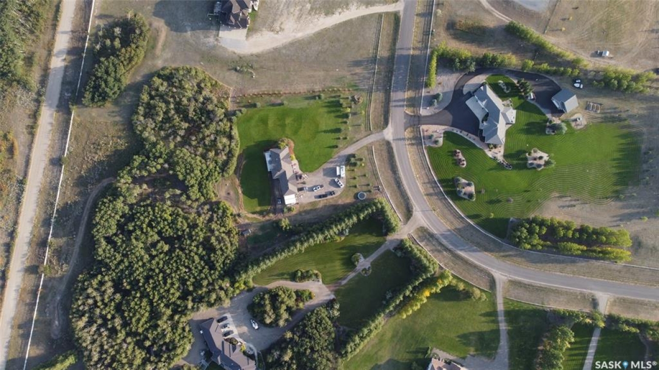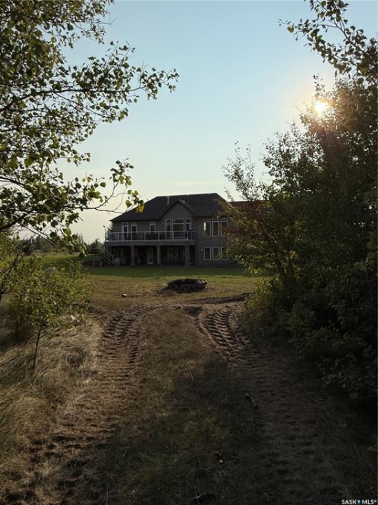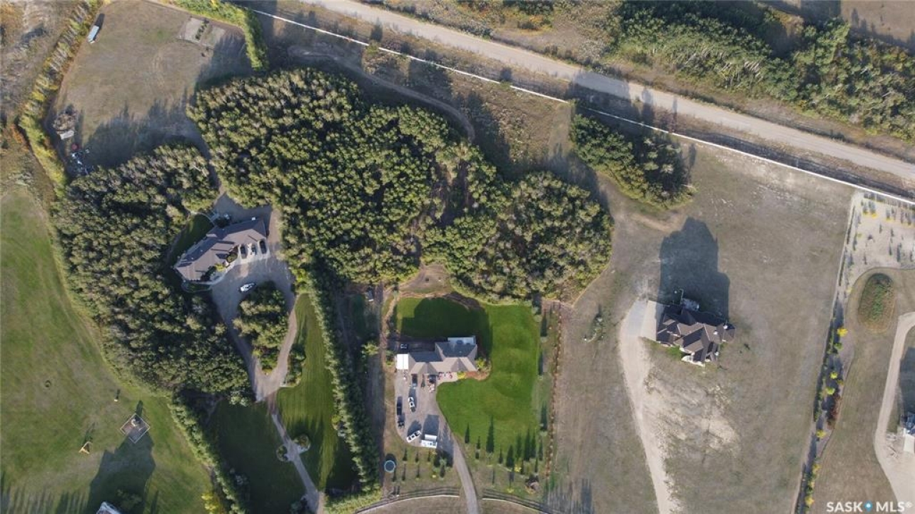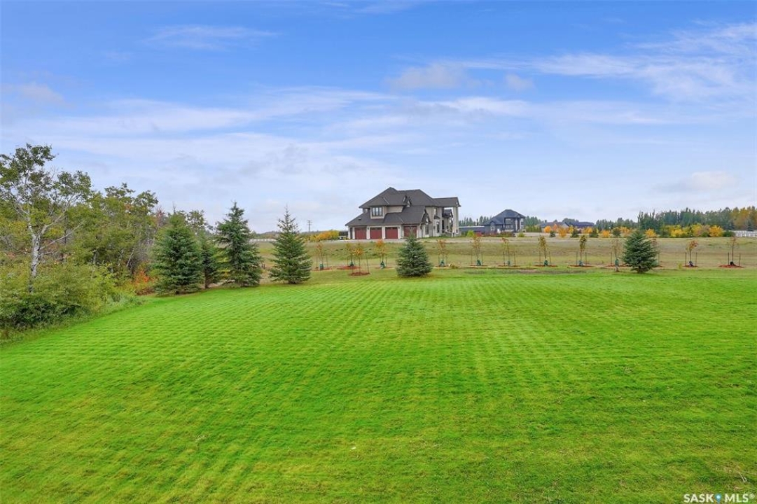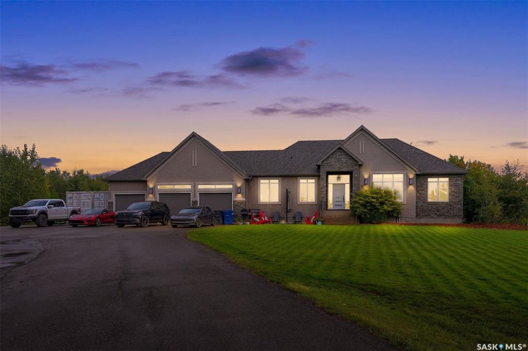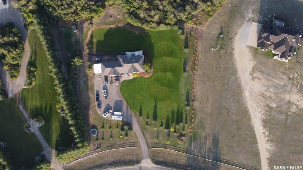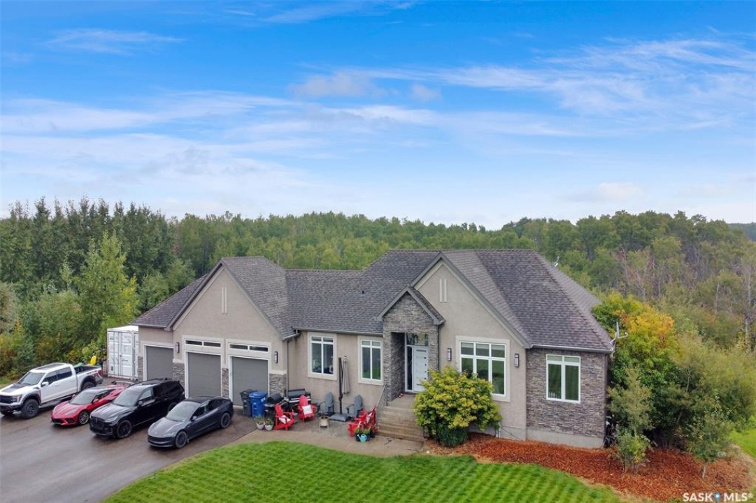 Don't miss this stunning walkout bungalow nestled on a prime 4.9-acre lot, highlighted by over 2 acres of mature trees complete with private walking and biking paths, a rare retreat just minutes from the city and walking distance to White Butte trails. This 1840 sq ft bungalow offers over 3,600 sq ft of beautifully developed living space with 5 bedrooms, a den, and 3 bathrooms, designed for both family living and entertaining. The exterior showcases stucco and stone finishes with a triple attached heated garage, with gemstone lighting, in-ground sprinklers attached to well. A fully paved driveway provides ample parking for guests, trailers, and toys. Step inside to a bright, open foyer with tile floors that lead into the expansive main level. The living room features vaulted ceilings, hardwood flooring, and a striking floor to ceiling fireplace, with large windows that flood the space with natural light and frame picturesque views of your private acreage. The kitchen is both stylish and functional, complete with quartz countertops, a large island, stainless steel appliances, and abundant cabinetry. A convenient walk-through pantry connects to the laundry/mudroom with direct access to the heated garage. The dining area, surrounded by windows, opens onto a wrap-around deck with a gas BBQ hookup, the perfect spot for summer entertaining. The main floor offers 3 bedrooms, including a spacious primary suite with a walk-in closet and a 3-pc ensuite. A garden door off the ensuite leads to the deck, offering a private outdoor escape. A full bathroom with a tiled soaker tub serves the additional bedrooms. The fully developed walkout basement extends your living space with a large recreation room featuring a second fireplace, French doors to a versatile den, 2 additional bedrooms, and a 3-pc bathroom. Walkout access opens onto a covered aggregate patio featuring gemstone lighting and the beautifully landscaped backyard, where the treed acreage and private trails await.