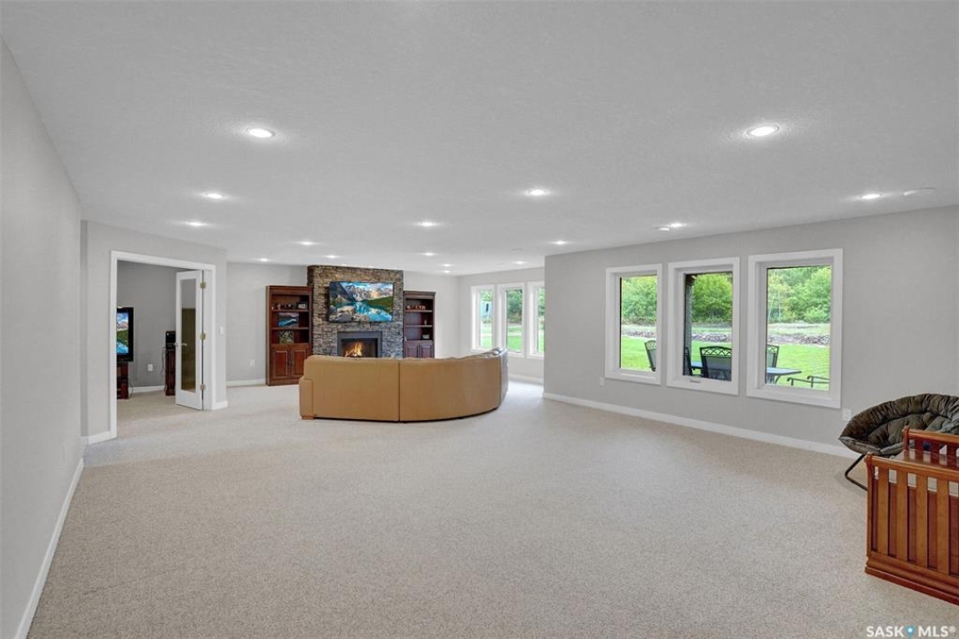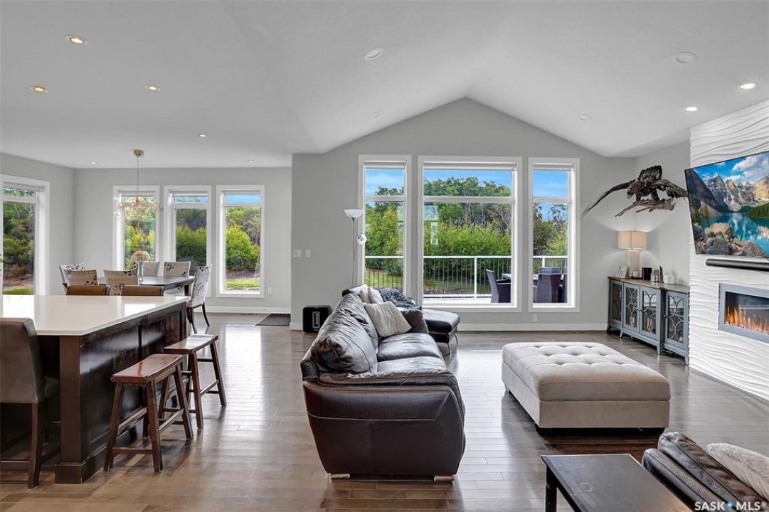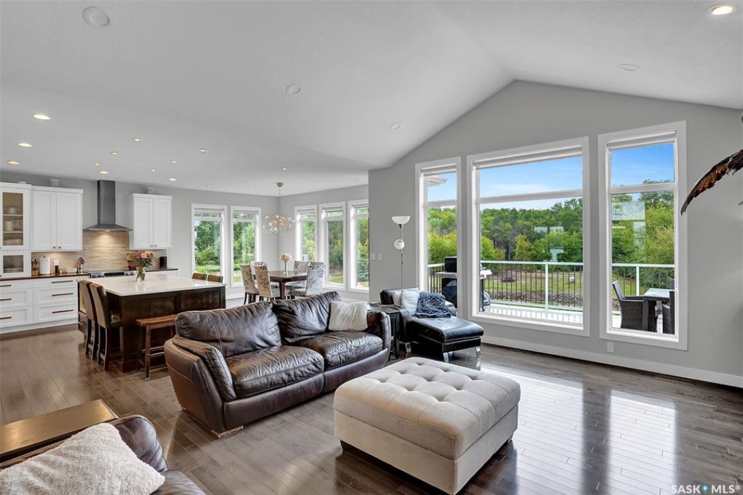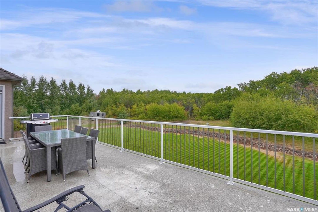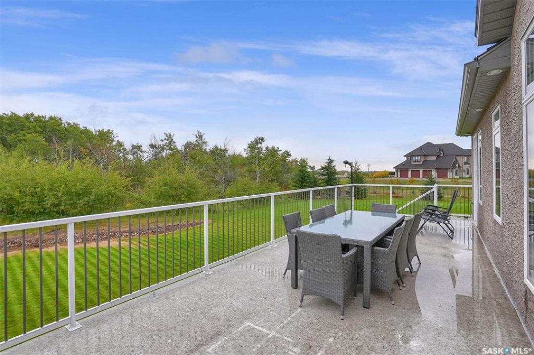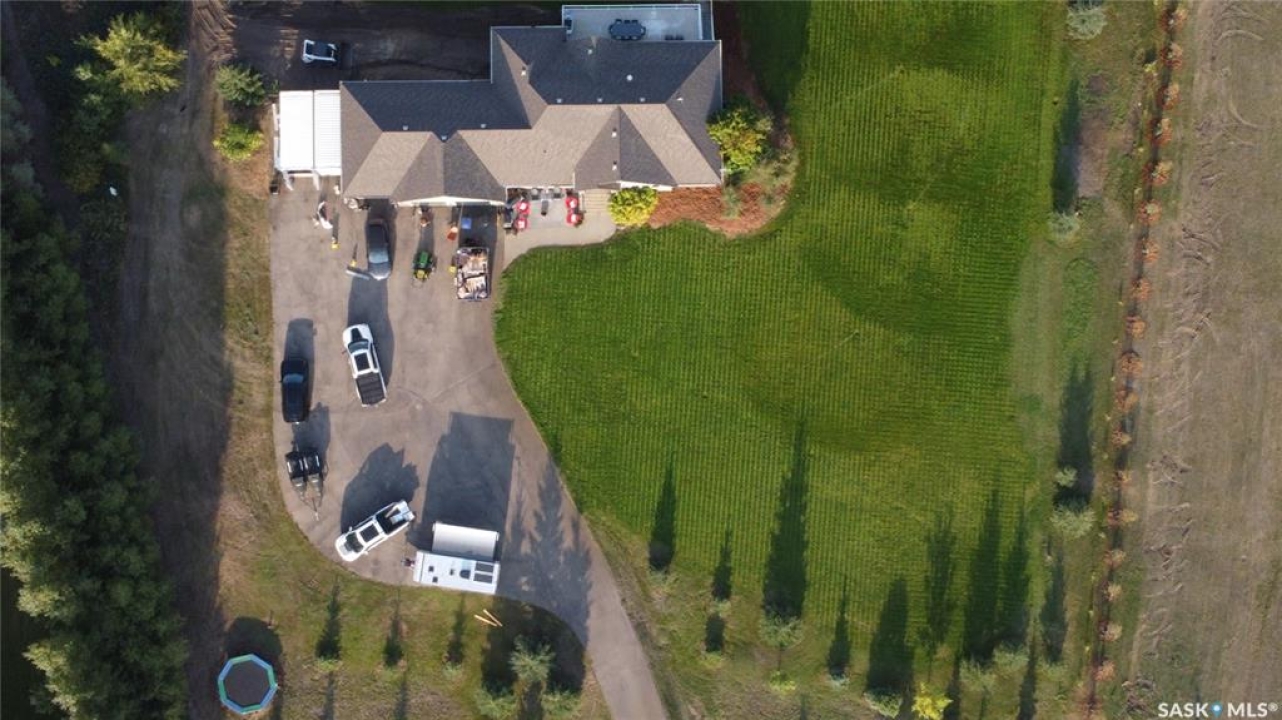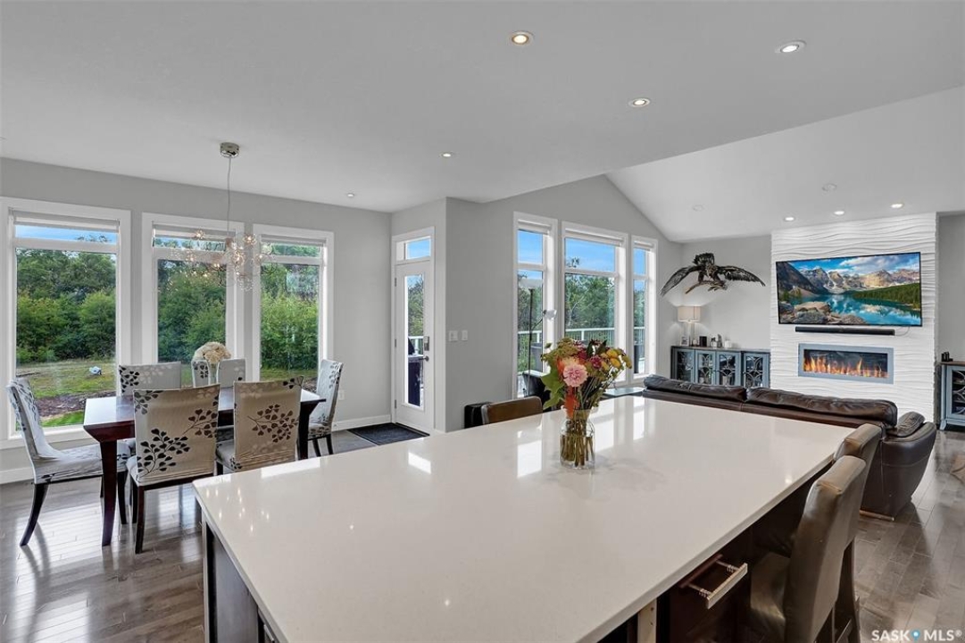 Don't miss this stunning walkout bungalow nestled on a prime 4.9-acre lot, highlighted by over 2 acres of mature trees complete with private walking and biking paths, a rare retreat just minutes from the city and walking distance to White Butte trails. This 1840 sq ft bungalow offers over 3,600 sq ft of beautifully developed living space with 5 bedrooms, a den, and 3 bathrooms, designed for both family living and entertaining. The exterior showcases stucco and stone finishes with a triple attached heated garage, with gemstone lighting, in-ground sprinklers attached to well. A fully paved driveway provides ample parking for guests, trailers, and toys. Step inside to a bright, open foyer with tile floors that lead into the expansive main level. The living room features vaulted ceilings, hardwood flooring, and a striking floor to ceiling fireplace, with large windows that flood the space with natural light and frame picturesque views of your private acreage. The kitchen is both stylish and functional, complete with quartz countertops, a large island, stainless steel appliances, and abundant cabinetry. A convenient walk-through pantry connects to the laundry/mudroom with direct access to the heated garage. The dining area, surrounded by windows, opens onto a wrap-around deck with a gas BBQ hookup, the perfect spot for summer entertaining. The main floor offers 3 bedrooms, including a spacious primary suite with a walk-in closet and a 3-pc ensuite. A garden door off the ensuite leads to the deck, offering a private outdoor escape. A full bathroom with a tiled soaker tub serves the additional bedrooms. The fully developed walkout basement extends your living space with a large recreation room featuring a second fireplace, French doors to a versatile den, 2 additional bedrooms, and a 3-pc bathroom. Walkout access opens onto a covered aggregate patio featuring gemstone lighting and the beautifully landscaped backyard, where the treed acreage and private trails await.