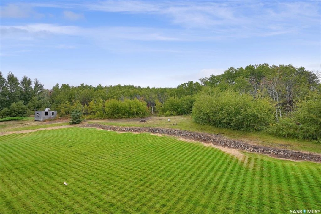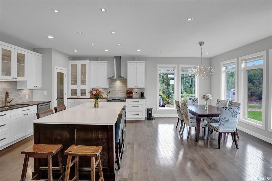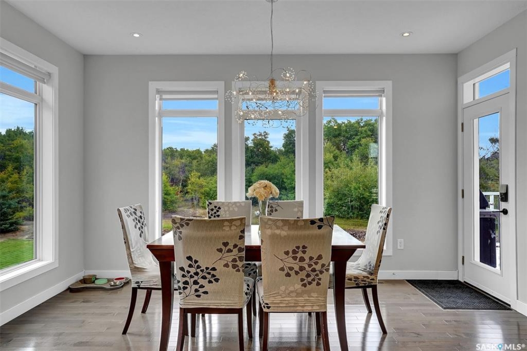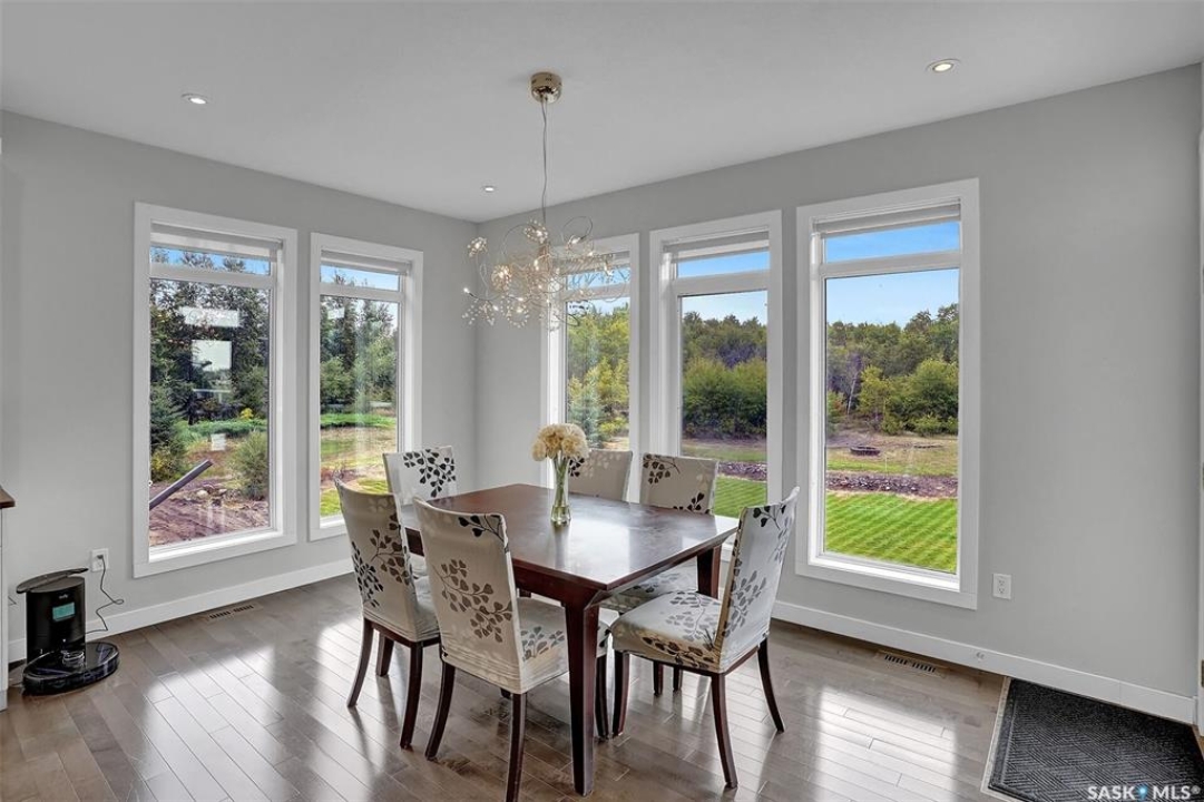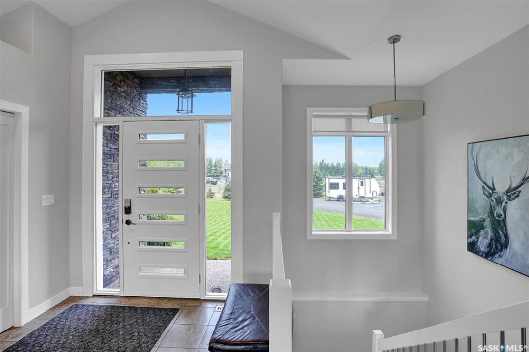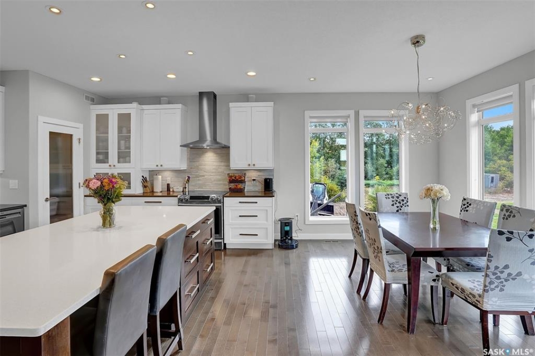 Don't miss this stunning walkout bungalow nestled on a prime 4.9-acre lot, highlighted by over 2 acres of mature trees complete with private walking and biking paths, a rare retreat just minutes from the city and walking distance to White Butte trails. This 1840 sq ft bungalow offers over 3,600 sq ft of beautifully developed living space with 5 bedrooms, a den, and 3 bathrooms, designed for both family living and entertaining. The exterior showcases stucco and stone finishes with a triple attached heated garage, with gemstone lighting, in-ground sprinklers attached to well. A fully paved driveway provides ample parking for guests, trailers, and toys. Step inside to a bright, open foyer with tile floors that lead into the expansive main level. The living room features vaulted ceilings, hardwood flooring, and a striking floor to ceiling fireplace, with large windows that flood the space with natural light and frame picturesque views of your private acreage. The kitchen is both stylish and functional, complete with quartz countertops, a large island, stainless steel appliances, and abundant cabinetry. A convenient walk-through pantry connects to the laundry/mudroom with direct access to the heated garage. The dining area, surrounded by windows, opens onto a wrap-around deck with a gas BBQ hookup, the perfect spot for summer entertaining. The main floor offers 3 bedrooms, including a spacious primary suite with a walk-in closet and a 3-pc ensuite. A garden door off the ensuite leads to the deck, offering a private outdoor escape. A full bathroom with a tiled soaker tub serves the additional bedrooms. The fully developed walkout basement extends your living space with a large recreation room featuring a second fireplace, French doors to a versatile den, 2 additional bedrooms, and a 3-pc bathroom. Walkout access opens onto a covered aggregate patio featuring gemstone lighting and the beautifully landscaped backyard, where the treed acreage and private trails await.