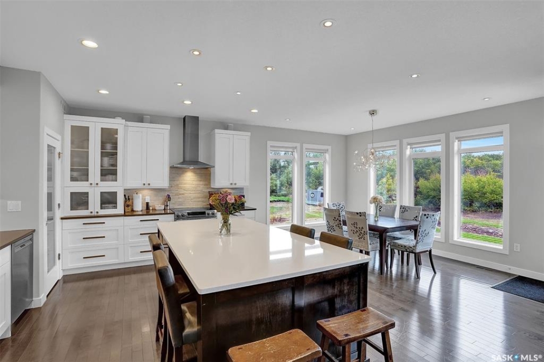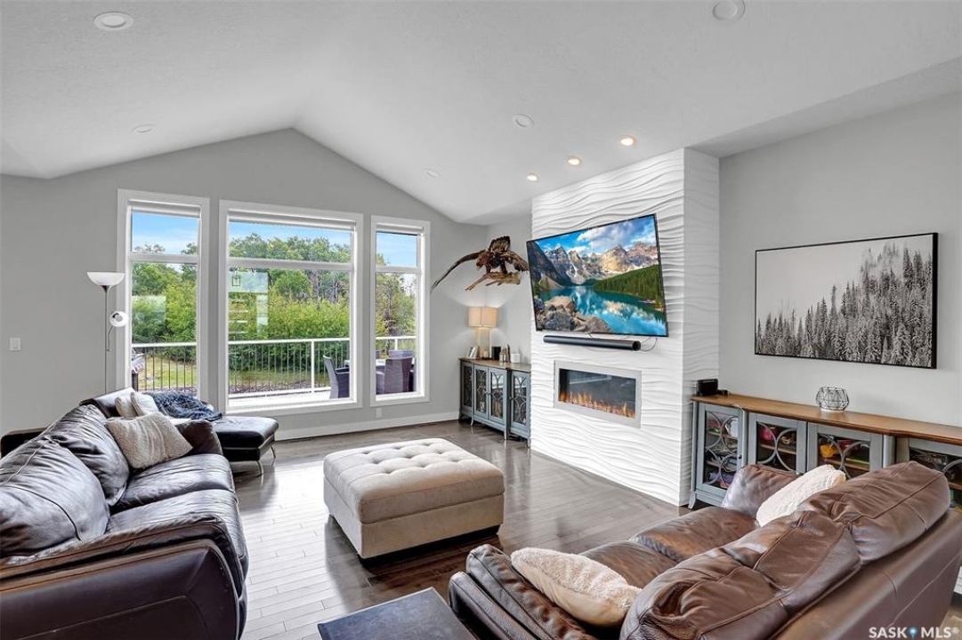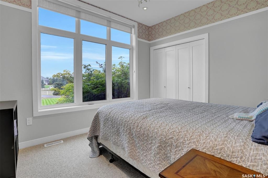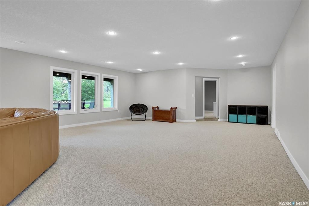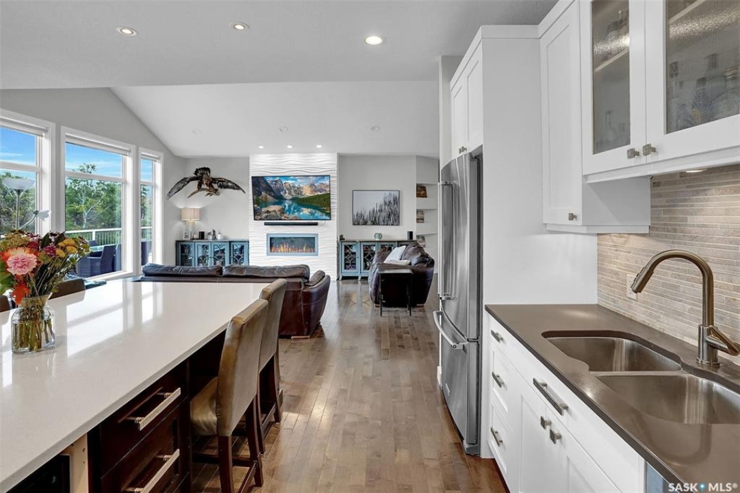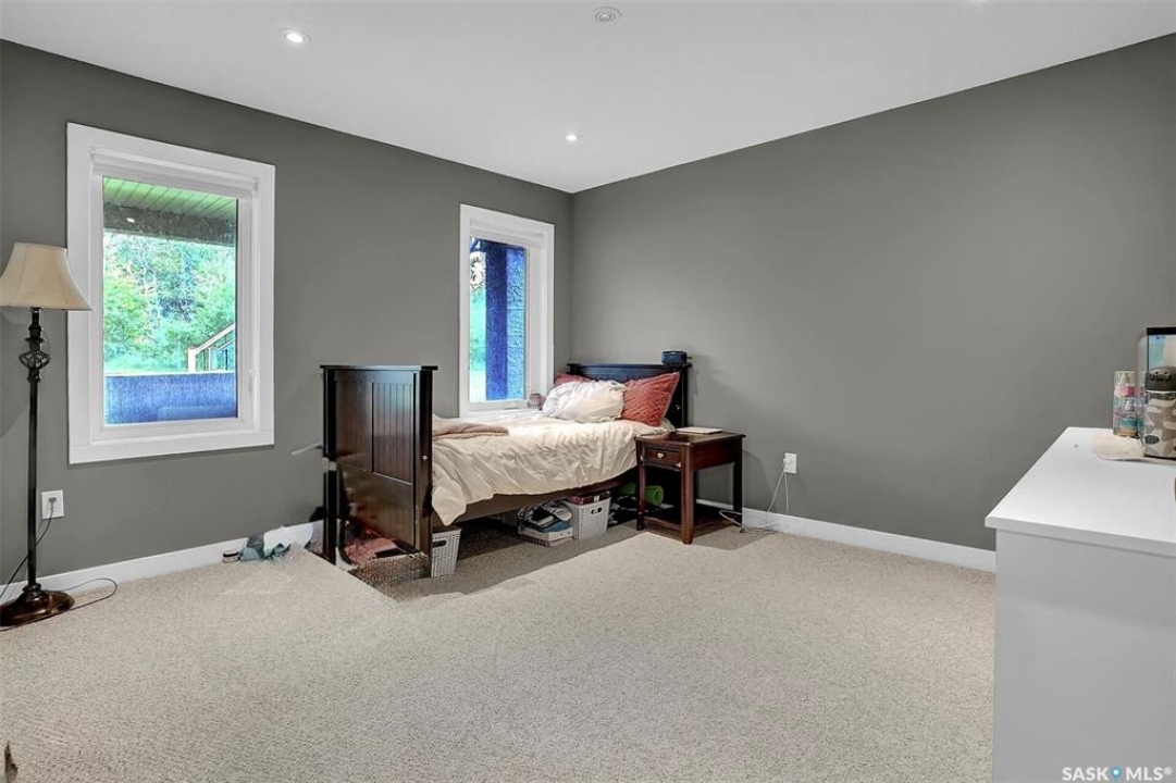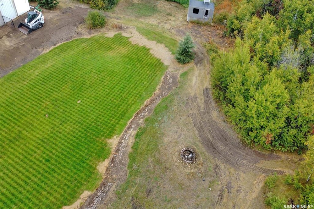Don't miss this stunning walkout bungalow nestled on a prime 4.9-acre lot, highlighted by over 2 acres of mature trees complete with private walking and biking paths, a rare retreat just minutes from the city and walking distance to White Butte trails. This 1840 sq ft bungalow offers over 3,600 sq ft of beautifully developed living space with 5 bedrooms, a den, and 3 bathrooms, designed for both family living and entertaining. The exterior showcases stucco and stone finishes with a triple attached heated garage, with gemstone lighting, in-ground sprinklers attached to well. A fully paved driveway provides ample parking for guests, trailers, and toys. Step inside to a bright, open foyer with tile floors that lead into the expansive main level. The living room features vaulted ceilings, hardwood flooring, and a striking floor to ceiling fireplace, with large windows that flood the space with natural light and frame picturesque views of your private acreage. The kitchen is both stylish and functional, complete with quartz countertops, a large island, stainless steel appliances, and abundant cabinetry. A convenient walk-through pantry connects to the laundry/mudroom with direct access to the heated garage. The dining area, surrounded by windows, opens onto a wrap-around deck with a gas BBQ hookup, the perfect spot for summer entertaining. The main floor offers 3 bedrooms, including a spacious primary suite with a walk-in closet and a 3-pc ensuite. A garden door off the ensuite leads to the deck, offering a private outdoor escape. A full bathroom with a tiled soaker tub serves the additional bedrooms. The fully developed walkout basement extends your living space with a large recreation room featuring a second fireplace, French doors to a versatile den, 2 additional bedrooms, and a 3-pc bathroom. Walkout access opens onto a covered aggregate patio featuring gemstone lighting and the beautifully landscaped backyard, where the treed acreage and private trails await.