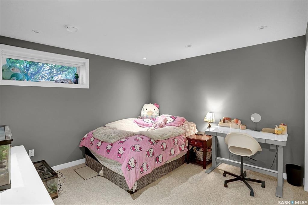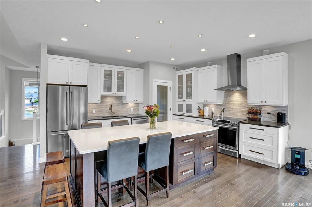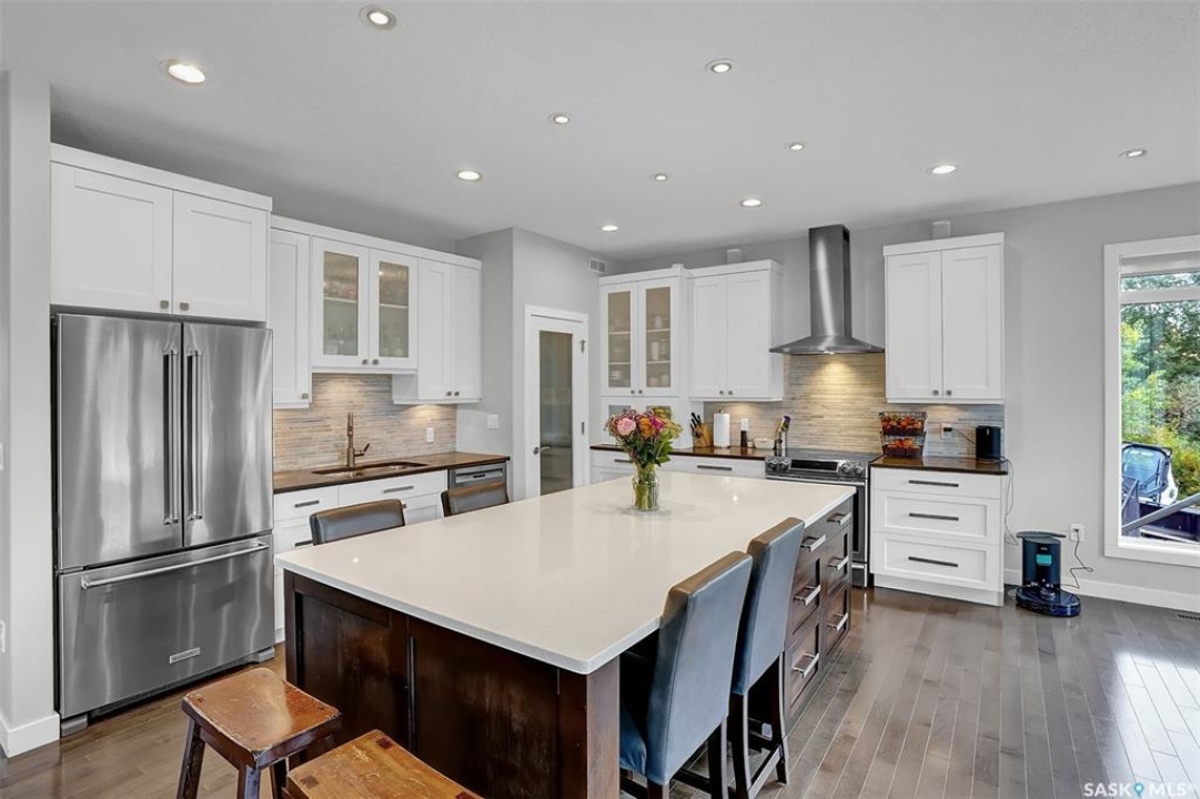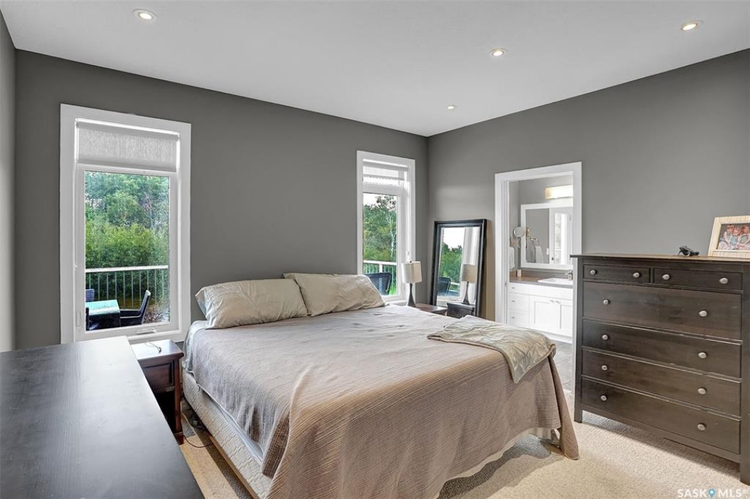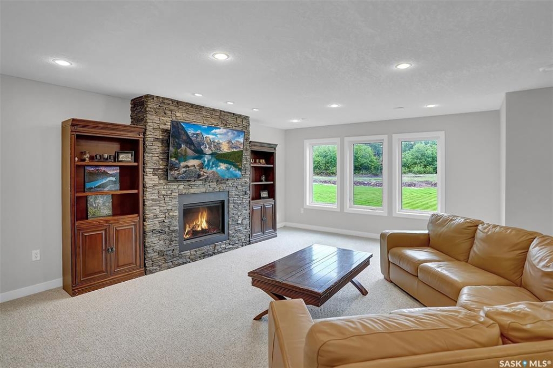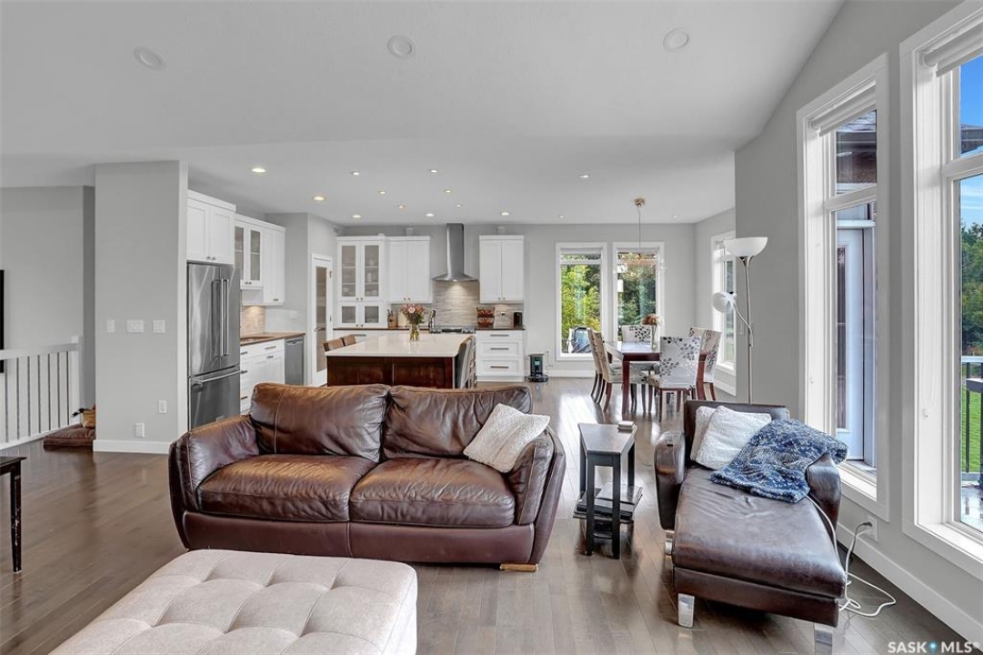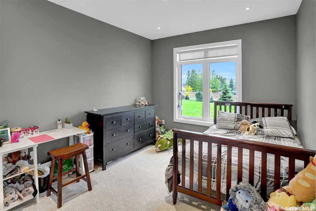 Don't miss this stunning walkout bungalow nestled on a prime 4.9-acre lot, highlighted by over 2 acres of mature trees complete with private walking and biking paths, a rare retreat just minutes from the city and walking distance to White Butte trails. This 1840 sq ft bungalow offers over 3,600 sq ft of beautifully developed living space with 5 bedrooms, a den, and 3 bathrooms, designed for both family living and entertaining. The exterior showcases stucco and stone finishes with a triple attached heated garage, with gemstone lighting, in-ground sprinklers attached to well. A fully paved driveway provides ample parking for guests, trailers, and toys. Step inside to a bright, open foyer with tile floors that lead into the expansive main level. The living room features vaulted ceilings, hardwood flooring, and a striking floor to ceiling fireplace, with large windows that flood the space with natural light and frame picturesque views of your private acreage. The kitchen is both stylish and functional, complete with quartz countertops, a large island, stainless steel appliances, and abundant cabinetry. A convenient walk-through pantry connects to the laundry/mudroom with direct access to the heated garage. The dining area, surrounded by windows, opens onto a wrap-around deck with a gas BBQ hookup, the perfect spot for summer entertaining. The main floor offers 3 bedrooms, including a spacious primary suite with a walk-in closet and a 3-pc ensuite. A garden door off the ensuite leads to the deck, offering a private outdoor escape. A full bathroom with a tiled soaker tub serves the additional bedrooms. The fully developed walkout basement extends your living space with a large recreation room featuring a second fireplace, French doors to a versatile den, 2 additional bedrooms, and a 3-pc bathroom. Walkout access opens onto a covered aggregate patio featuring gemstone lighting and the beautifully landscaped backyard, where the treed acreage and private trails await.