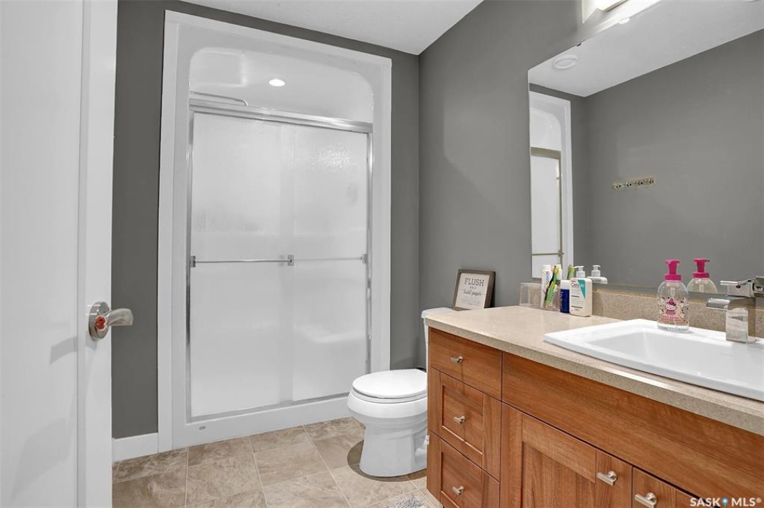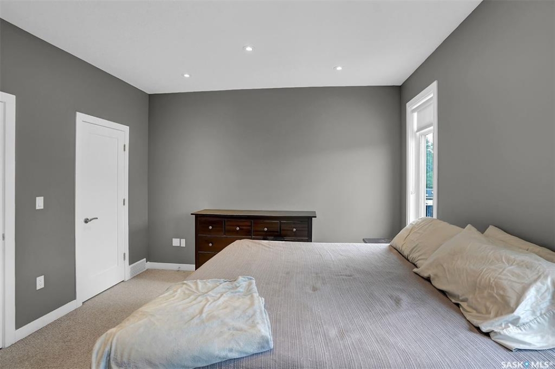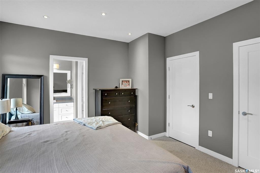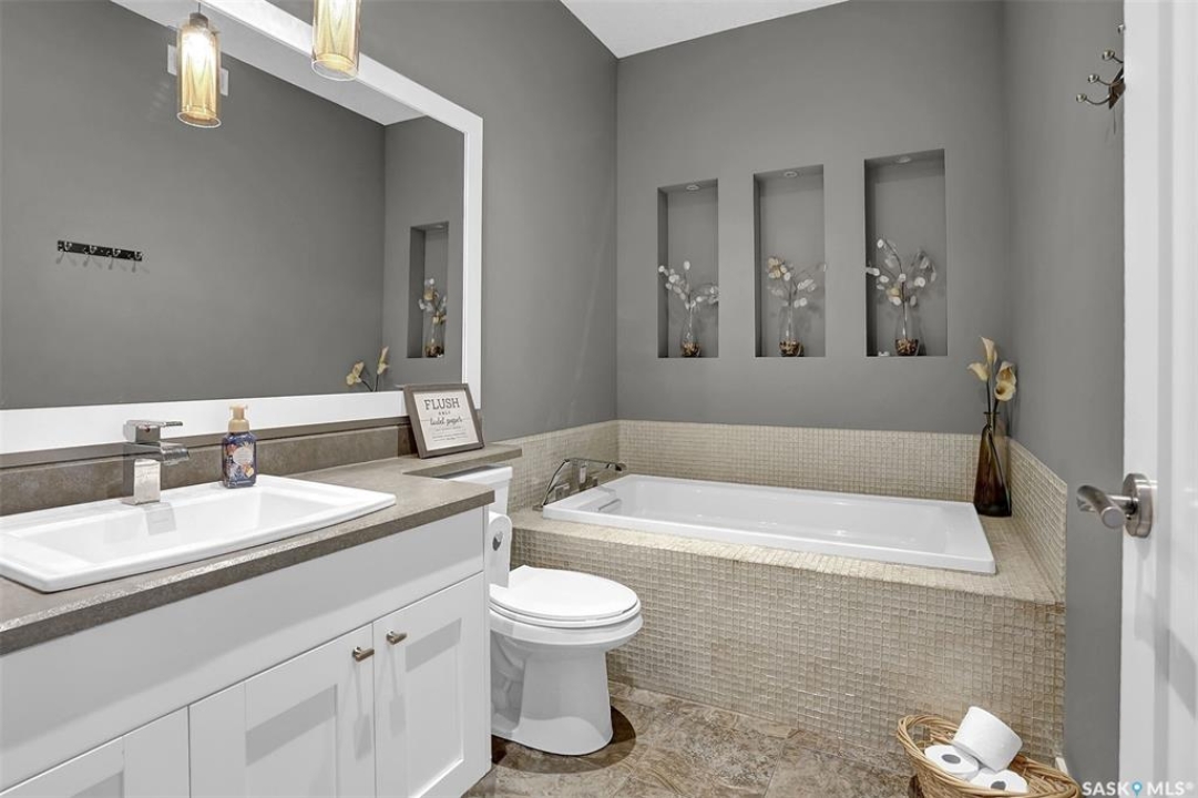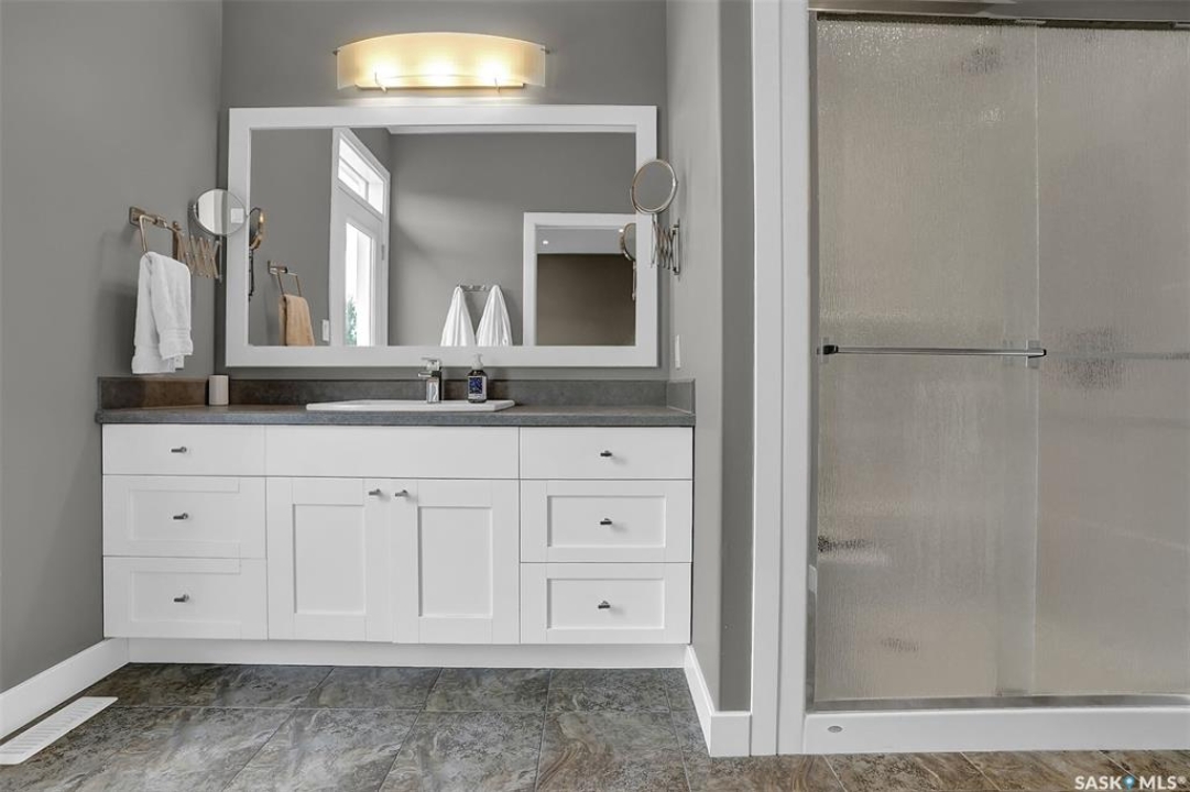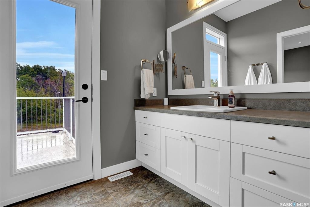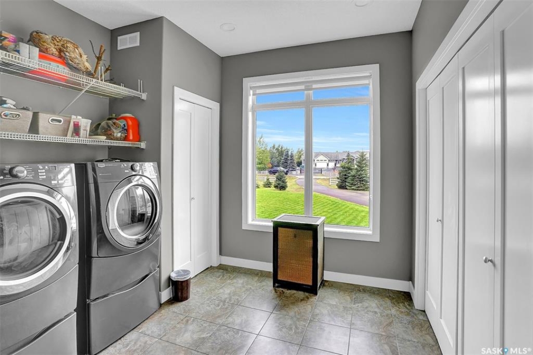 Don't miss this stunning walkout bungalow nestled on a prime 4.9-acre lot, highlighted by over 2 acres of mature trees complete with private walking and biking paths, a rare retreat just minutes from the city and walking distance to White Butte trails. This 1840 sq ft bungalow offers over 3,600 sq ft of beautifully developed living space with 5 bedrooms, a den, and 3 bathrooms, designed for both family living and entertaining. The exterior showcases stucco and stone finishes with a triple attached heated garage, with gemstone lighting, in-ground sprinklers attached to well. A fully paved driveway provides ample parking for guests, trailers, and toys. Step inside to a bright, open foyer with tile floors that lead into the expansive main level. The living room features vaulted ceilings, hardwood flooring, and a striking floor to ceiling fireplace, with large windows that flood the space with natural light and frame picturesque views of your private acreage. The kitchen is both stylish and functional, complete with quartz countertops, a large island, stainless steel appliances, and abundant cabinetry. A convenient walk-through pantry connects to the laundry/mudroom with direct access to the heated garage. The dining area, surrounded by windows, opens onto a wrap-around deck with a gas BBQ hookup, the perfect spot for summer entertaining. The main floor offers 3 bedrooms, including a spacious primary suite with a walk-in closet and a 3-pc ensuite. A garden door off the ensuite leads to the deck, offering a private outdoor escape. A full bathroom with a tiled soaker tub serves the additional bedrooms. The fully developed walkout basement extends your living space with a large recreation room featuring a second fireplace, French doors to a versatile den, 2 additional bedrooms, and a 3-pc bathroom. Walkout access opens onto a covered aggregate patio featuring gemstone lighting and the beautifully landscaped backyard, where the treed acreage and private trails await.