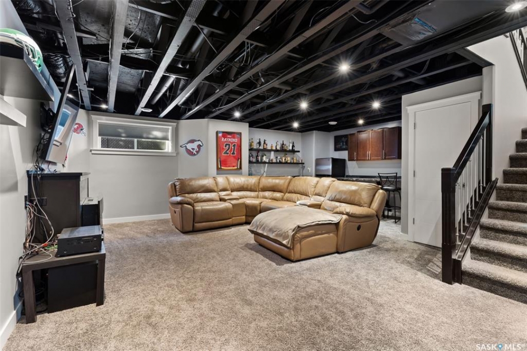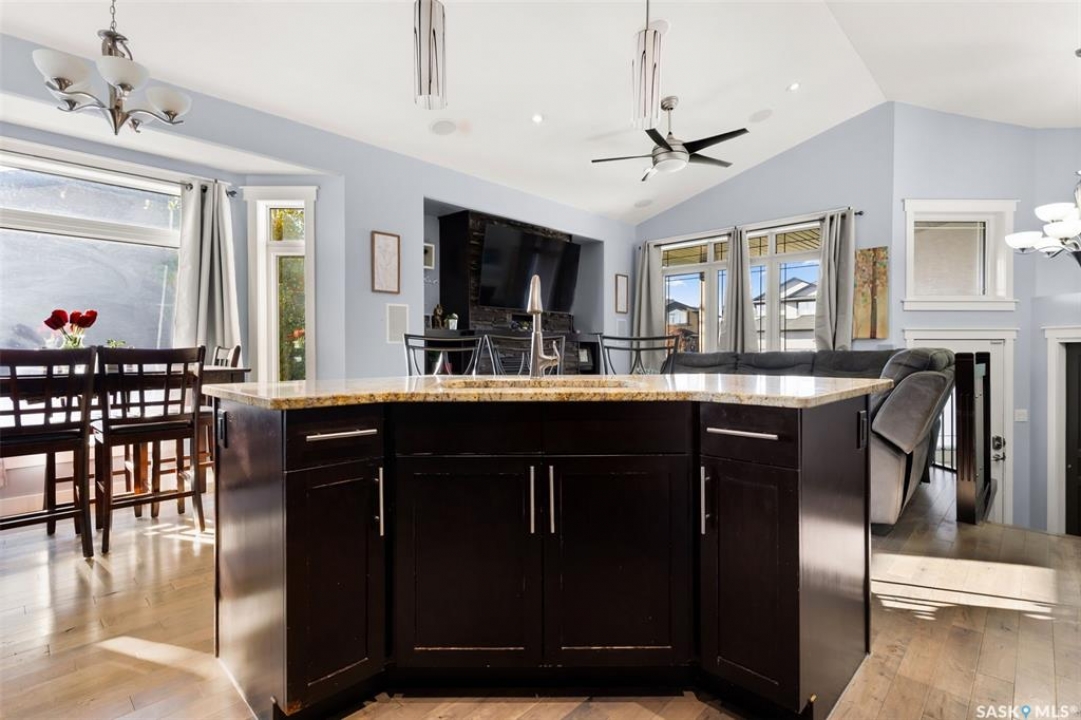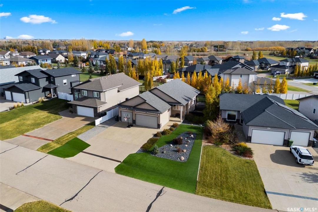 Welcome to 37 Churchill Cres in White City, just minutes from Regina and within walking distance of the new school. Set on a well-kept lot with xeriscaped front landscaping that minimizes maintenance, this property makes a strong first impression with its curb appeal. An open foyer introduces a bright and airy main level enhanced by pot lighting and vaulted ceilings. The living room centers on a gas fireplace with a stacked-stone surround, creating a comfortable gathering space that flows seamlessly into the dining area and kitchen. The kitchen features espresso maple cabinetry, a granite eat-up island for casual meals, and a walk-in pantry for organized storage, with direct access to the covered veranda for easy indoor-outdoor living. The primary bedroom is positioned for privacy and includes its own deck access, a 4pc ensuite, and a walk-in closet. Two additional good-sized bedrooms on the main level offer recessed closets for efficient use of space, while a 4pc. main bath and convenient main-floor laundry complete the floor. The fully finished basement expands the home's livability with a large family room, a games area, and a wet bar that makes entertaining effortless. A spacious fourth bedroom and another 4pc bathroom provide excellent guest or teenager accommodation. Storage is abundant, and the basement was spray-foamed by the builder, contributing to comfort and energy efficiency. The 32'×26' heated triple garage is a standout, offering a 14' ceiling, and the option of a car lift (negotiable). The backyard is set up for relaxation and play with a hot tub, a dog run, raised garden boxes for seasonal planting, and a storage shed to keep tools and toys out of sight. Underground sprinklers serve the landscaped areas, and the covered veranda extends the outdoor season. Altogether, this home blends everyday functionality with thoughtful extras in a family-oriented community close to city conveniences.