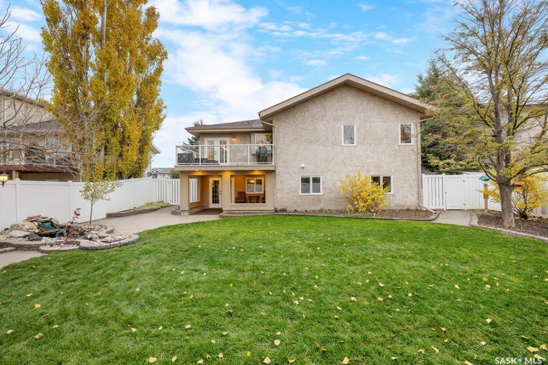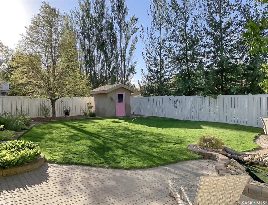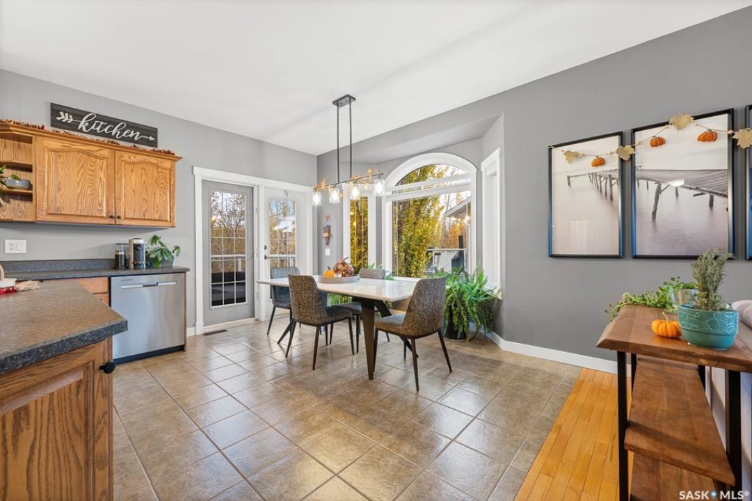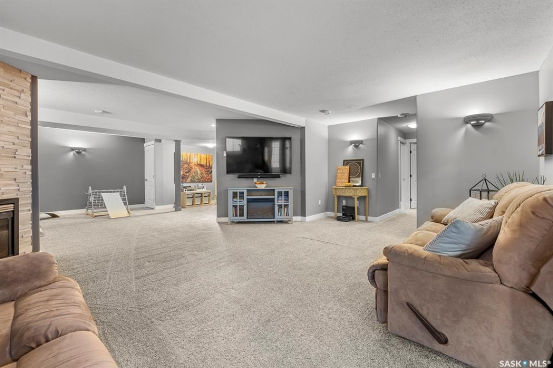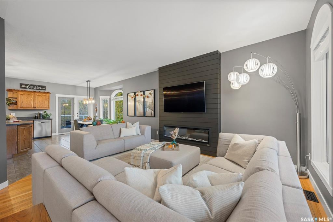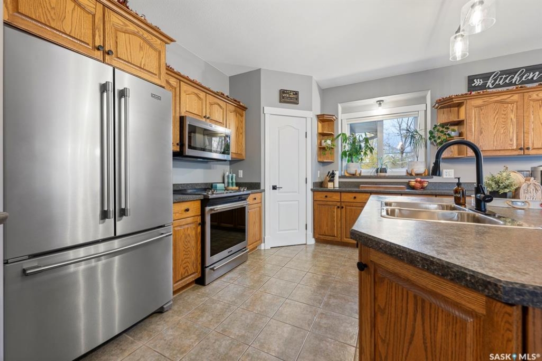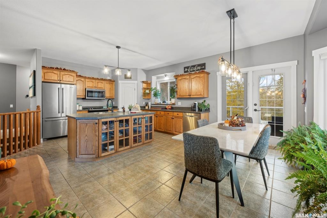 Welcome home to this 1,376 sq ft walkout bungalow in Pilot Butte. This 4-bedroom, 3-bath home offers a balance of comfort, style, and a serene setting. The open-concept main floor is bright and welcoming, featuring a kitchen that flows into the dining and living areas. Step out from the kitchen onto the new deck with a natural gas hookup. The primary bedroom has vaulted ceilings and an ensuite with heated floors and a custom walk-in shower. A second bedroom, full bath, and main floor laundry complete this level. The spacious walkout basement offers large windows, a cozy gas fireplace, and two additional bedrooms with a full bathroom. The covered lower patio overlooks the landscaped backyard, mature trees, and pond with an environmental reserve backdrop. Highlights include a heated double garage, exterior RV parking, a private well, and a covered south-facing front porch. Convenient access to Highways 1 and 46 provides a quick and easy commute to Regina. Recent updates: Garage heater (2015), HRV (2015), Eavestroughs (2015), Central air (2015), Shingles (2017), Kitchen appliances (2020), Water heater (2020), Ensuite (2022), Washer/dryer (2025), Back deck (2025). Located on a quiet street with no thru traffic and within walking distance to Pilot Butte School, this home is move-in ready and waiting to welcome you.