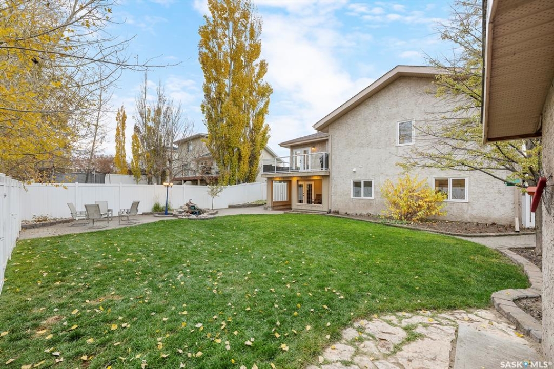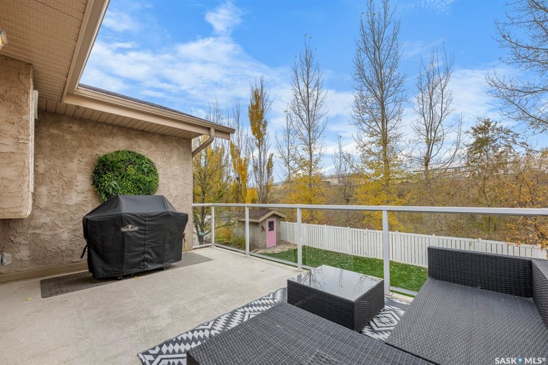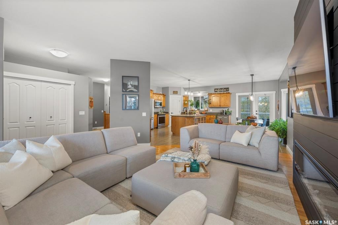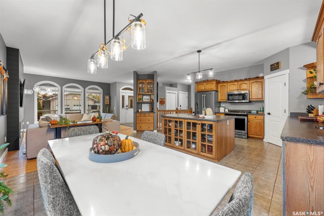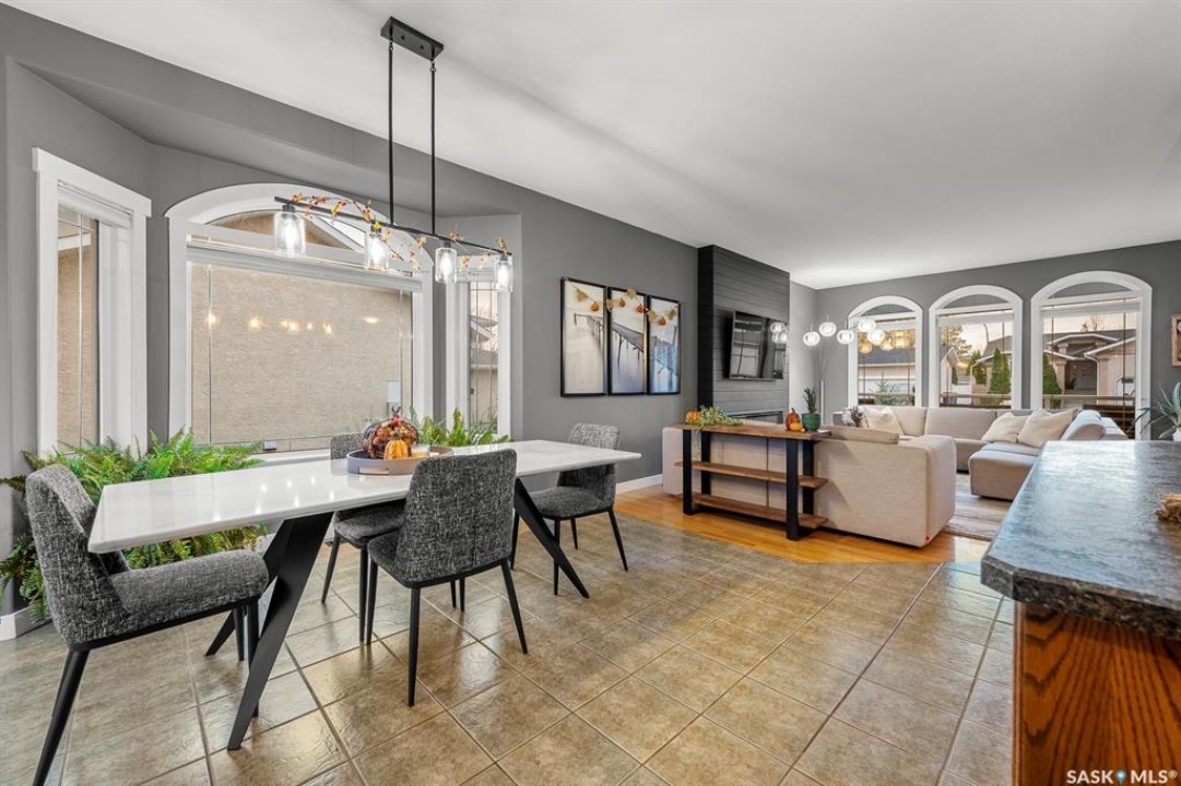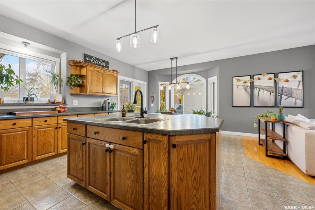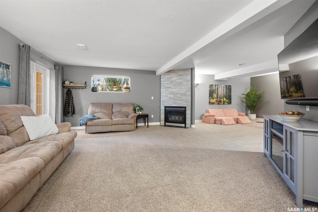 Welcome home to this 1,376 sq ft walkout bungalow in Pilot Butte. This 4-bedroom, 3-bath home offers a balance of comfort, style, and a serene setting. The open-concept main floor is bright and welcoming, featuring a kitchen that flows into the dining and living areas. Step out from the kitchen onto the new deck with a natural gas hookup. The primary bedroom has vaulted ceilings and an ensuite with heated floors and a custom walk-in shower. A second bedroom, full bath, and main floor laundry complete this level. The spacious walkout basement offers large windows, a cozy gas fireplace, and two additional bedrooms with a full bathroom. The covered lower patio overlooks the landscaped backyard, mature trees, and pond with an environmental reserve backdrop. Highlights include a heated double garage, exterior RV parking, a private well, and a covered south-facing front porch. Convenient access to Highways 1 and 46 provides a quick and easy commute to Regina. Recent updates: Garage heater (2015), HRV (2015), Eavestroughs (2015), Central air (2015), Shingles (2017), Kitchen appliances (2020), Water heater (2020), Ensuite (2022), Washer/dryer (2025), Back deck (2025). Located on a quiet street with no thru traffic and within walking distance to Pilot Butte School, this home is move-in ready and waiting to welcome you.