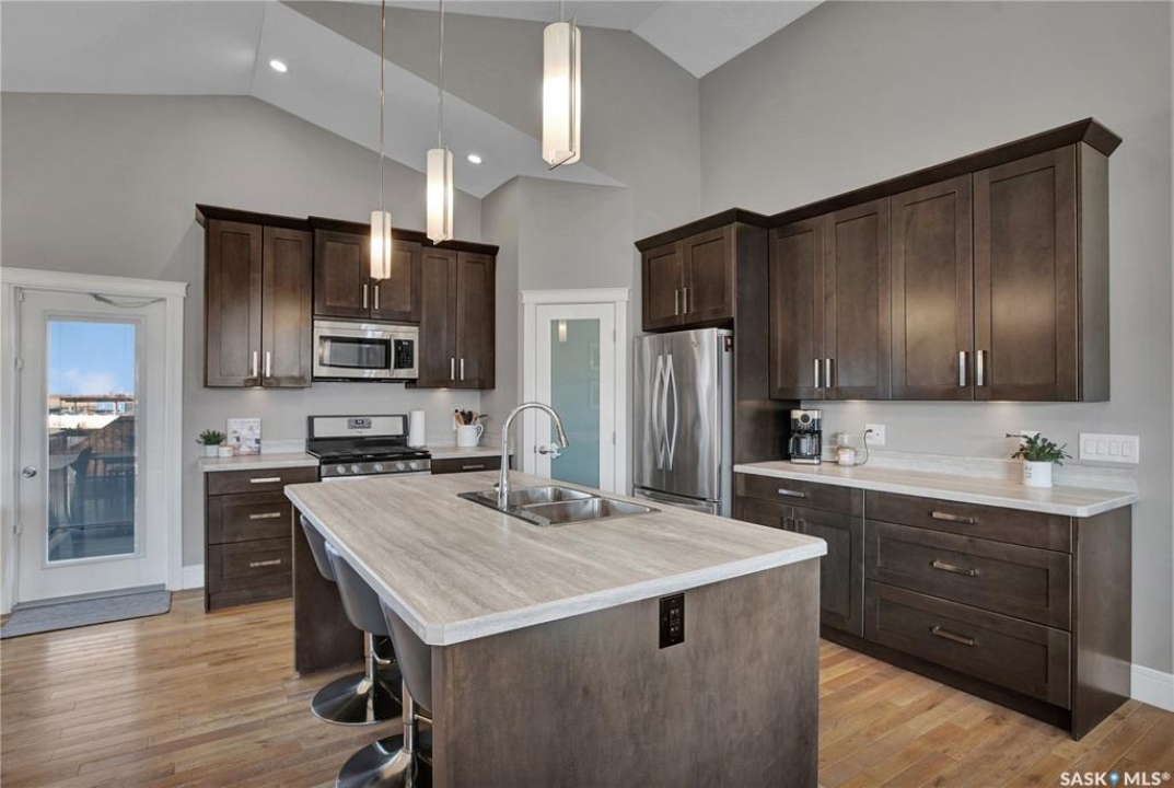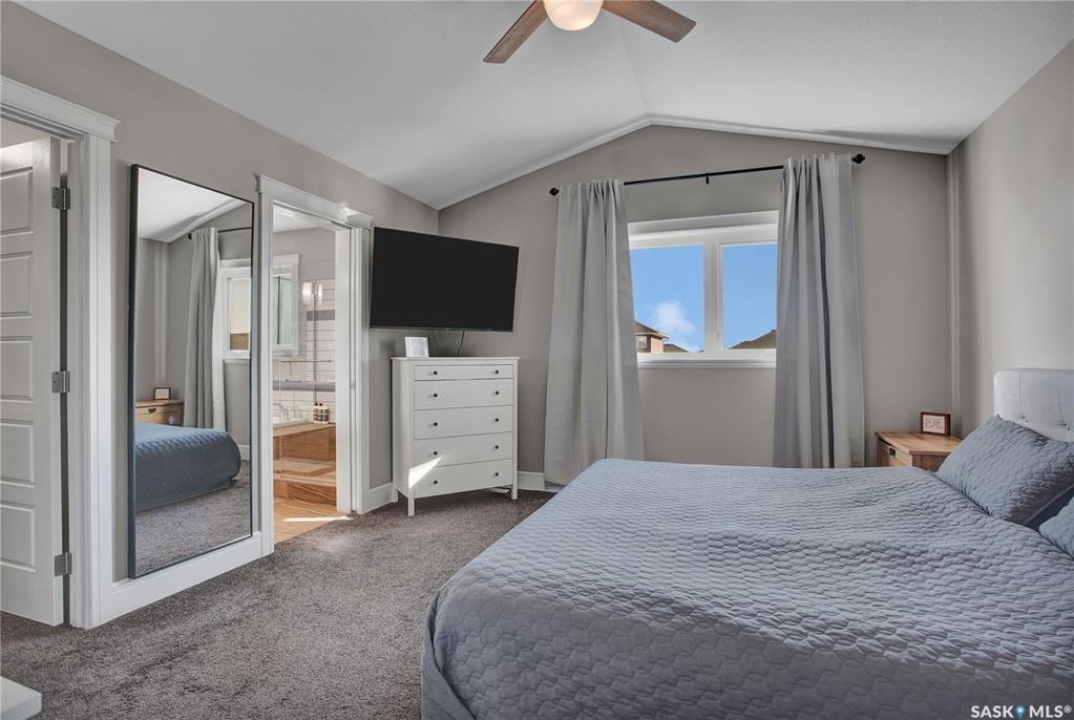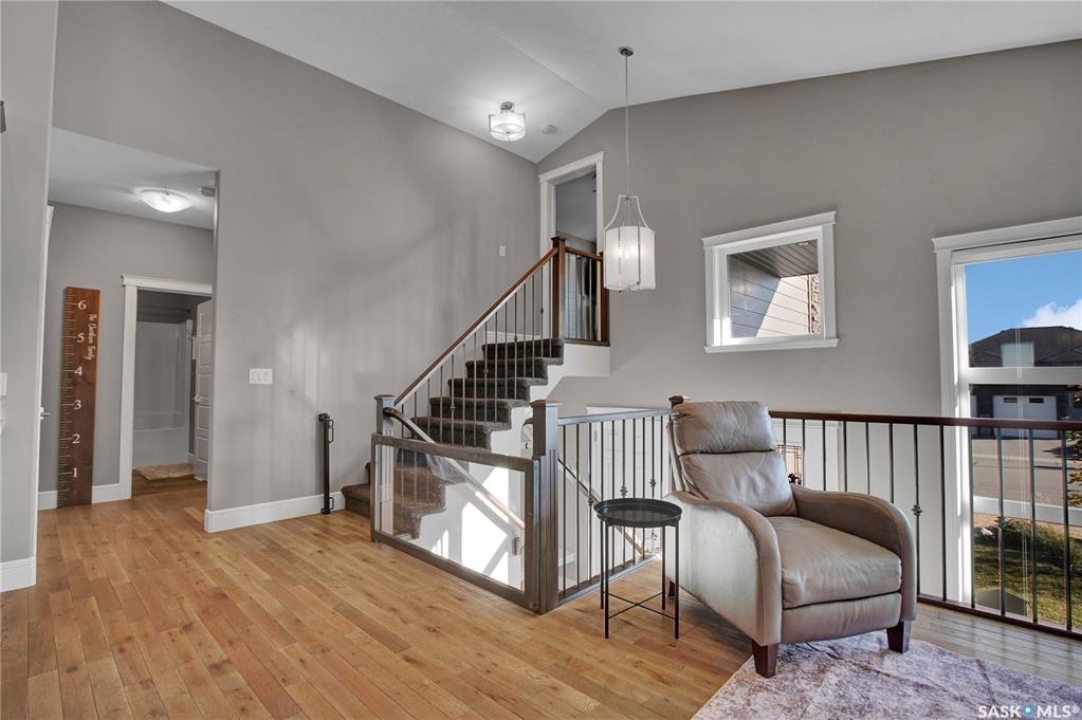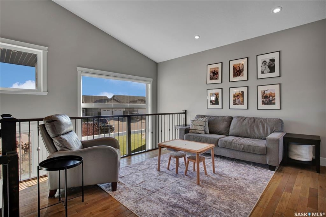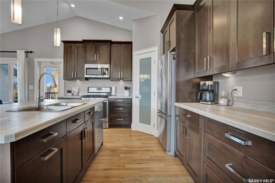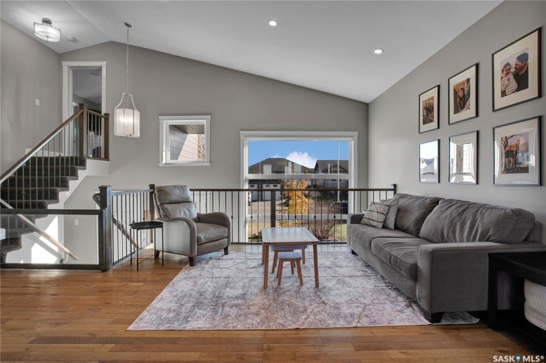 Welcome to this stunning custom-built modified bi-level by the reputable Cherry Creek Homes, perfectly positioned on a massive 52' x 130' lot backing green space and walking paths. With its low-maintenance exterior featuring stone accents and stylish hardy board siding, this home offers timeless curb appeal and lasting quality. Step inside to an open-concept layout highlighted by vaulted ceilings, hardwood flooring, and elegant maple railings. The large windows flood the home with natural light, creating a bright and inviting atmosphere. The spacious kitchen is designed for both function and style, featuring a corner pantry, gas range, and large island—perfect for family gatherings and entertaining. The main floor offers two generous bedrooms, while the private primary suite is tucked away on its own level—a true escape complete with a five-piece ensuite. The basement development is well underway, offering a large family room area, a rough-in for a future bathroom (currently featuring a temporary toilet and sink), an additional bedroom area, and a spacious utility/storage room. Enjoy the outdoors with a beautifully landscaped yard featuring mature trees, underground sprinklers, and a west-facing deck—ideal for relaxing evenings in the sun. There is an exposed aggregate patio and covered storage space under the deck and natural gas BBQ hookup. Simply move in and enjoy—this home combines thoughtful design, quality craftsmanship, and a peaceful location backing green space.