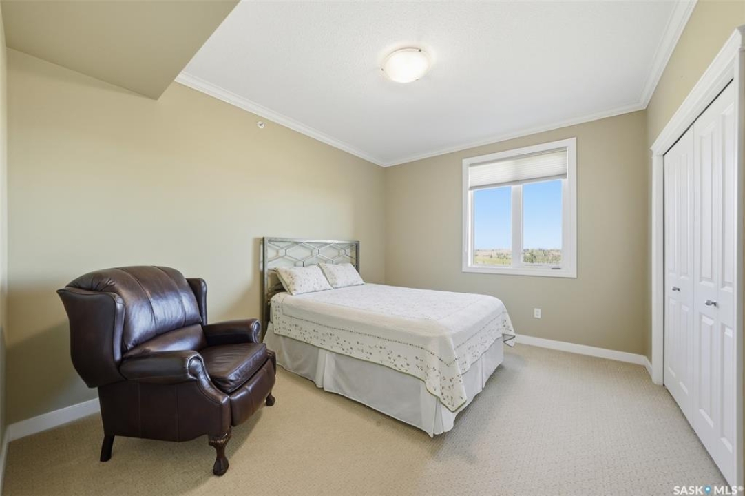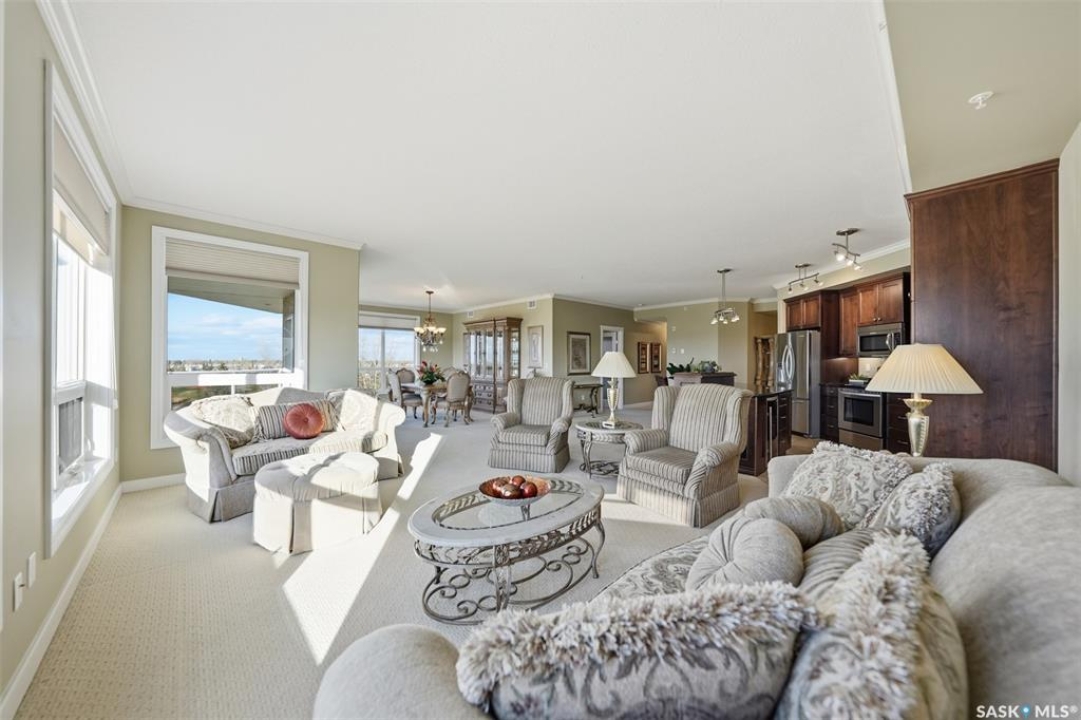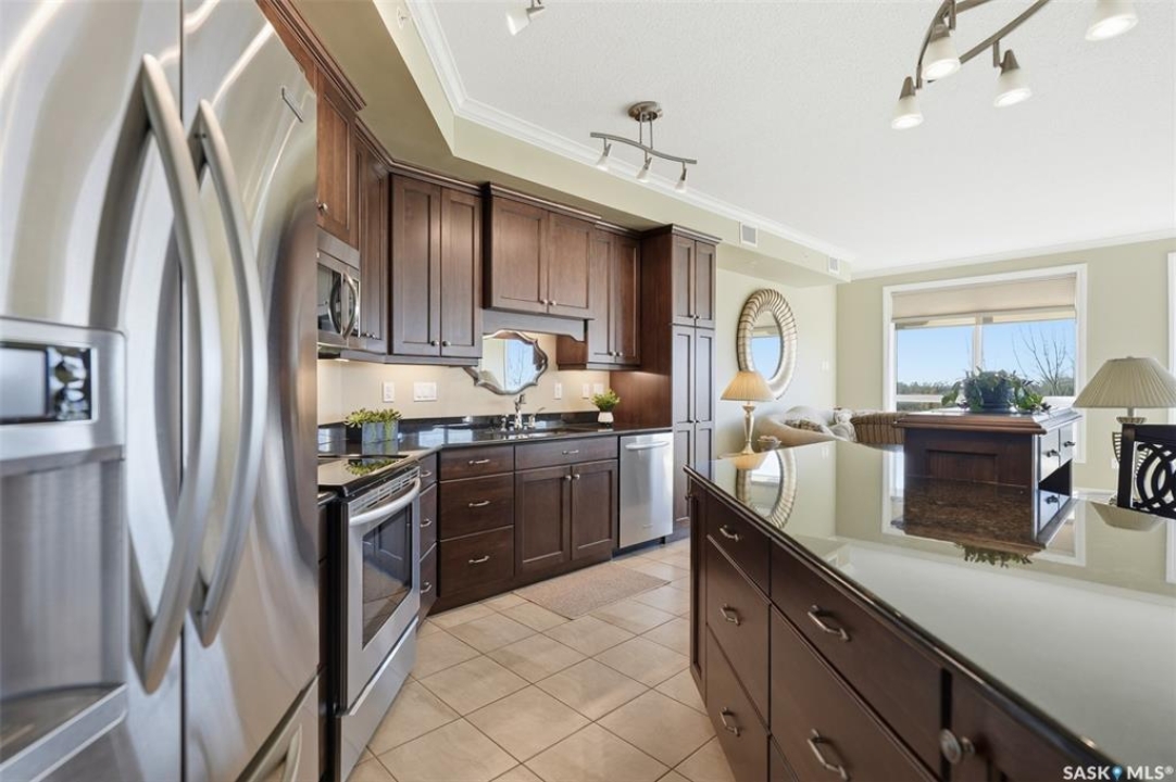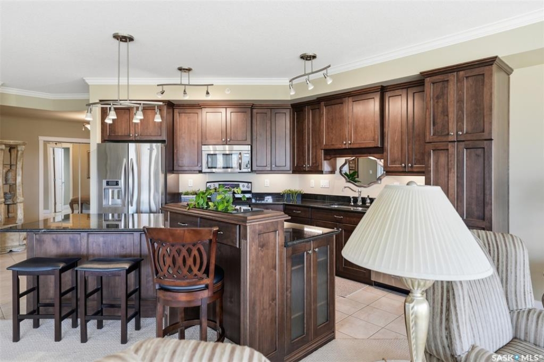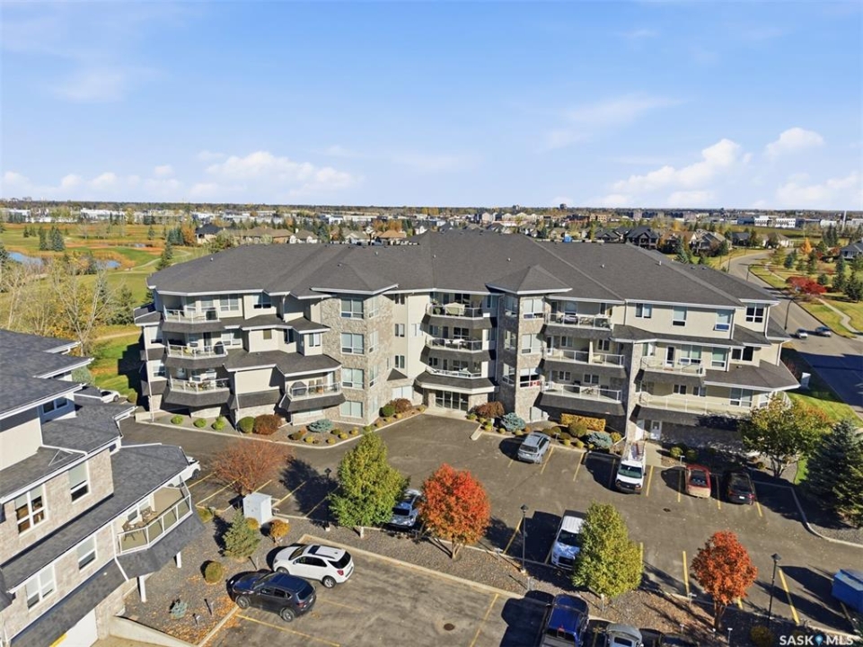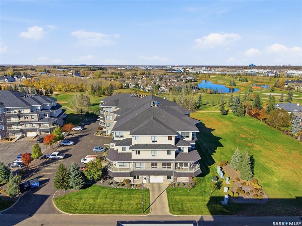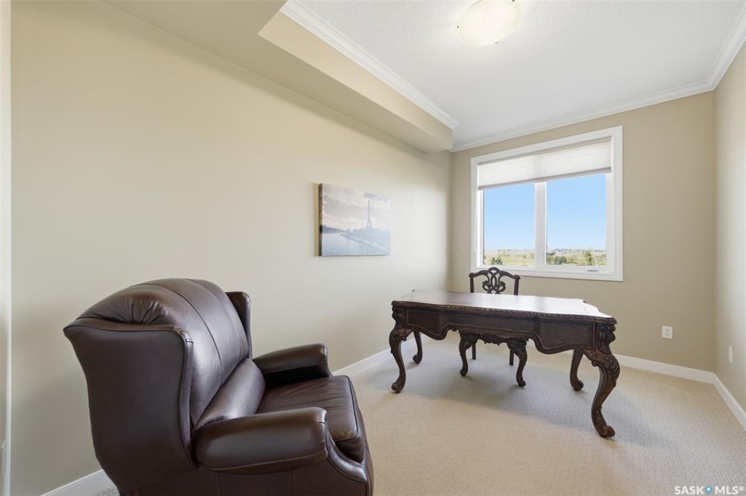 Welcome to luxury living at The Willows - Saskatoon's premier golf course community. This top floor corner unit boasts 1,854 sq.ft. with a spacious open floor plan. Soaring wall to wall windows let in natural light from the north and west sides of the building, and the wrap-around balcony showcasing beautiful views of the golf course and community. Features include custom cabinetry, granite countertops, crown mouldings, and in-floor heat. Three bedrooms (one ideal as an office). The primary bedroom offers a walk-in closet and a large ensuite with double sinks. Convenient in-suite laundry and two underground parking stalls (a rare find). Pets allowed with approval. Original owners. A premium opportunity for upscale condo living in one of Saskatoon's most desirable communities.