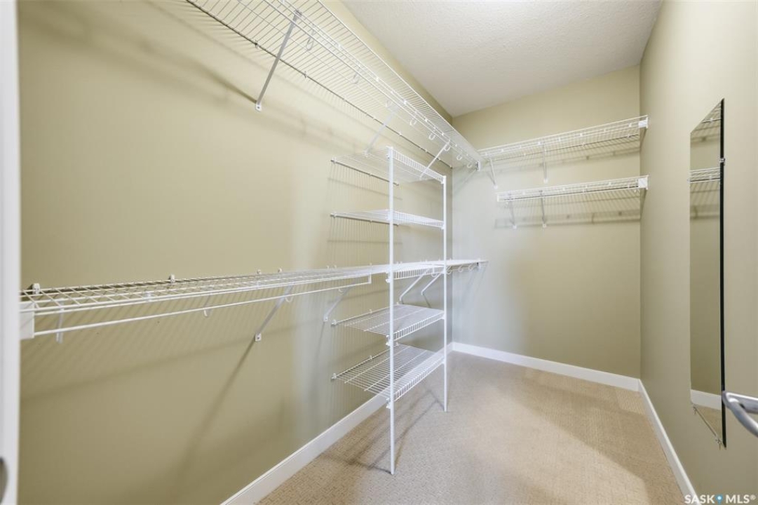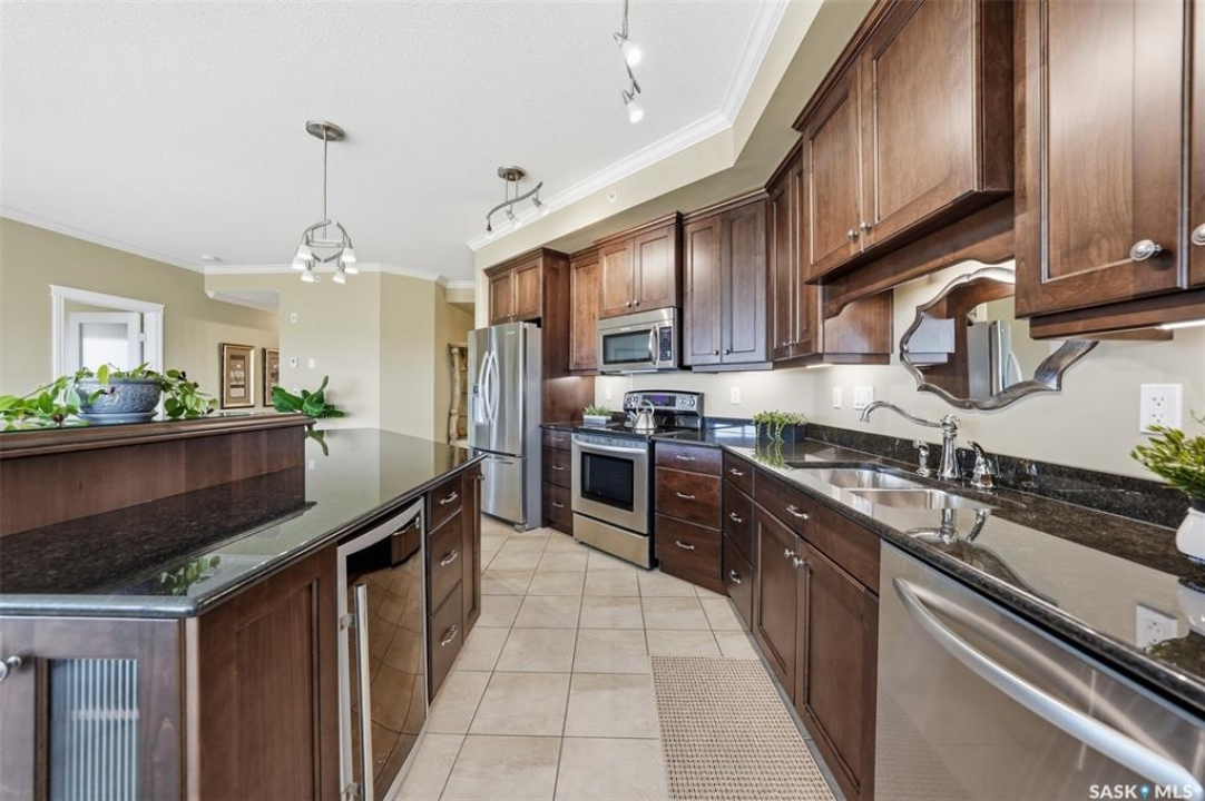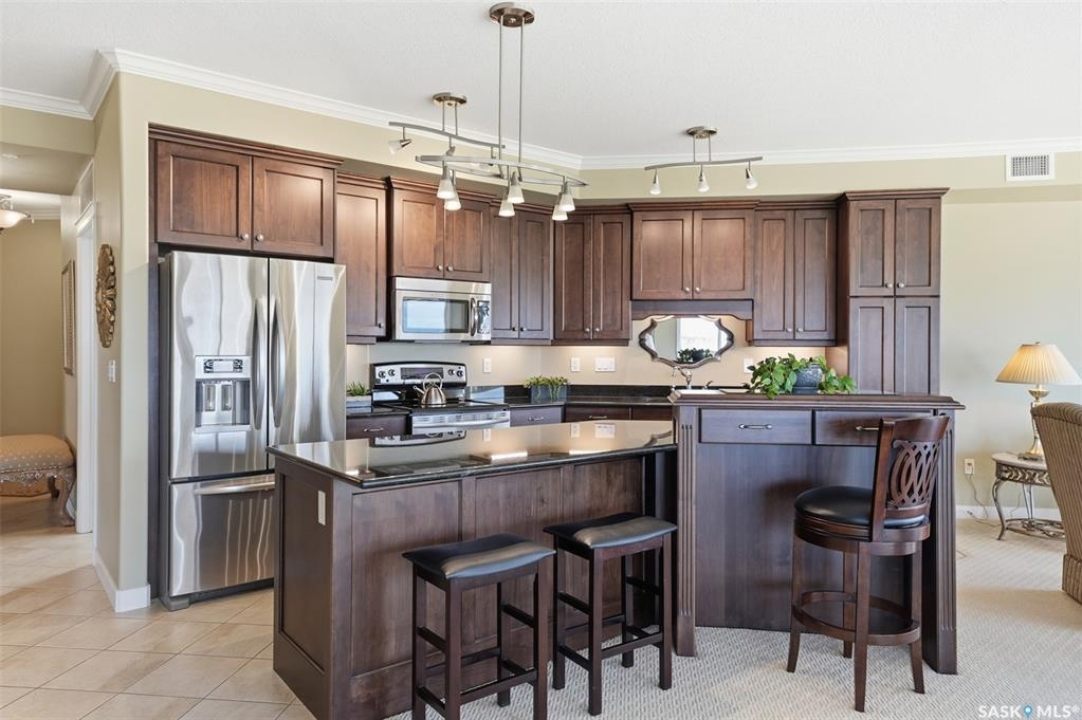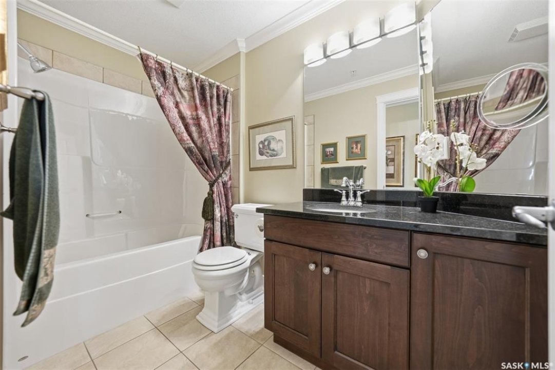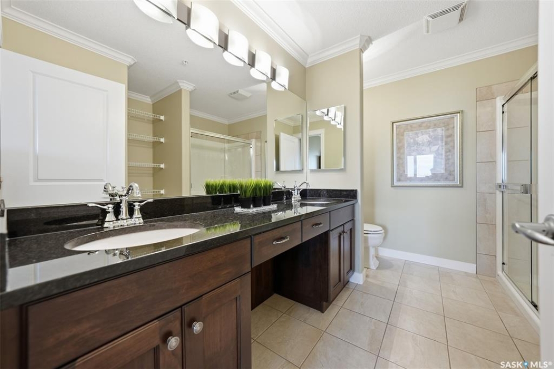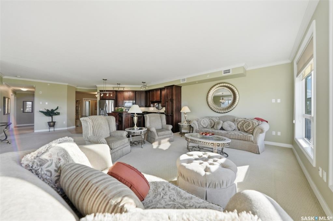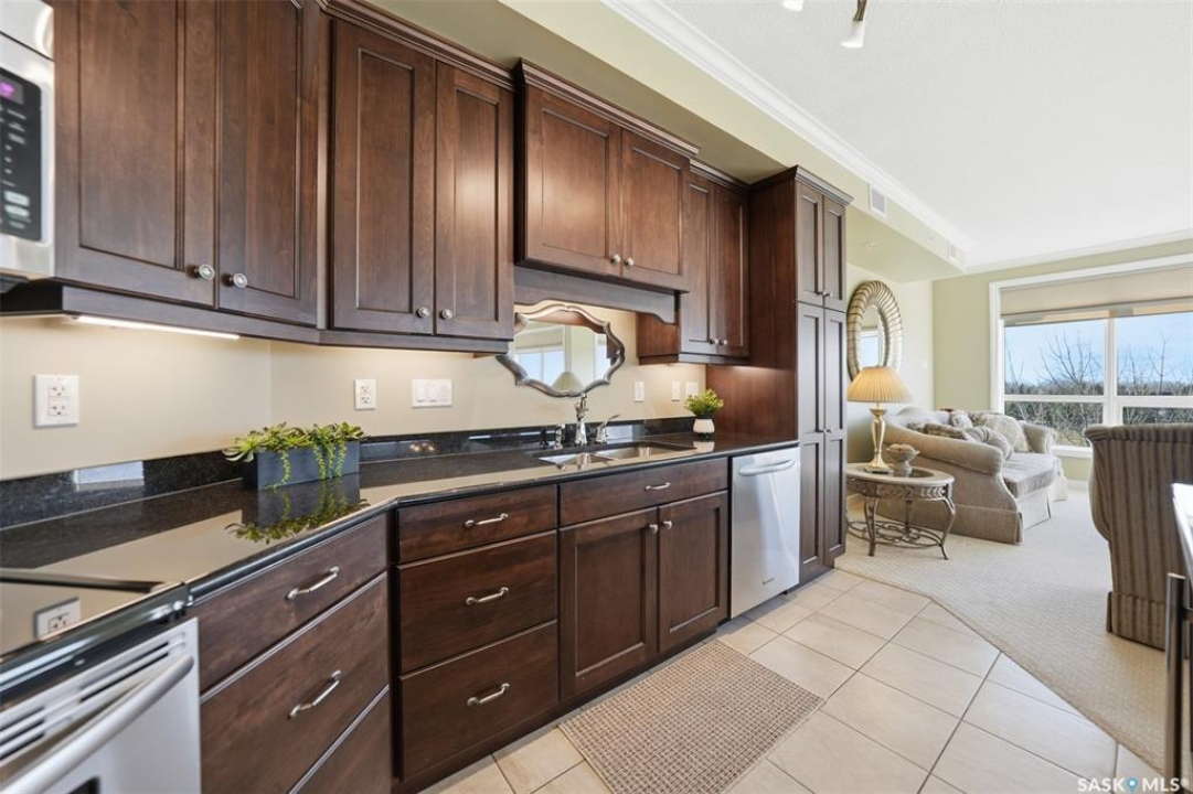 Welcome to luxury living at The Willows - Saskatoon's premier golf course community. This top floor corner unit boasts 1,854 sq.ft. with a spacious open floor plan. Soaring wall to wall windows let in natural light from the north and west sides of the building, and the wrap-around balcony showcasing beautiful views of the golf course and community. Features include custom cabinetry, granite countertops, crown mouldings, and in-floor heat. Three bedrooms (one ideal as an office). The primary bedroom offers a walk-in closet and a large ensuite with double sinks. Convenient in-suite laundry and two underground parking stalls (a rare find). Pets allowed with approval. Original owners. A premium opportunity for upscale condo living in one of Saskatoon's most desirable communities.