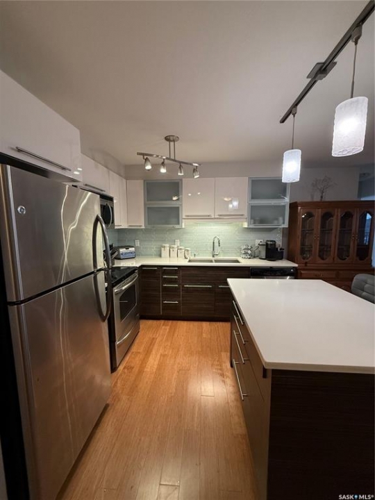 Located in the desirable community of Stonebridge, this lovely two-bedroom, one-bathroom condo offers a modern, comfortable lifestyle on the third floor of a well-maintained building with an elevator. The home features a bright, open-concept design with a covered balcony perfect for relaxing outdoors. The modern kitchen showcases glossy white upper cabinets paired with rich wood-tone lowers, quartz countertops, a glass tile backsplash, and a large island with bar seating—ideal for casual dining or entertaining. Stainless steel appliances include a fridge, stove, dishwasher, and over-the-range microwave, and the suite also comes with in-suite laundry. ( Washer/Dryer not included). Freshly painted in most of the living room and bedrooms �. Both bedrooms enjoy walk in closets. This unit is move-in ready and situated in an area with an excellent walkability score, close to shopping, restaurants, and parks. The pet-friendly building (with board approval) offers fantastic amenities, including an in-door swimming pool, fitness center, and billiards room, social room . The monthly condo fee of $457 includes heat, water, and access to all amenities. Listed at $275,500, this beautiful condo offers exceptional value and convenience in one of Saskatoon's most sought-after neighborhoods.