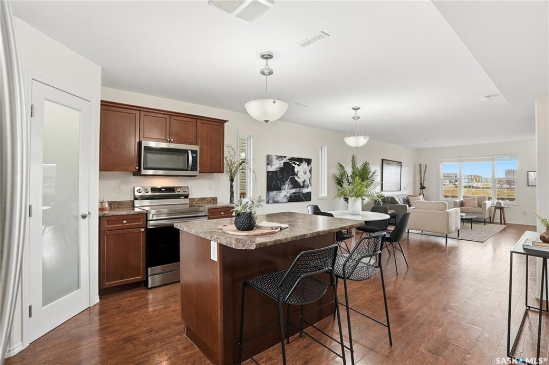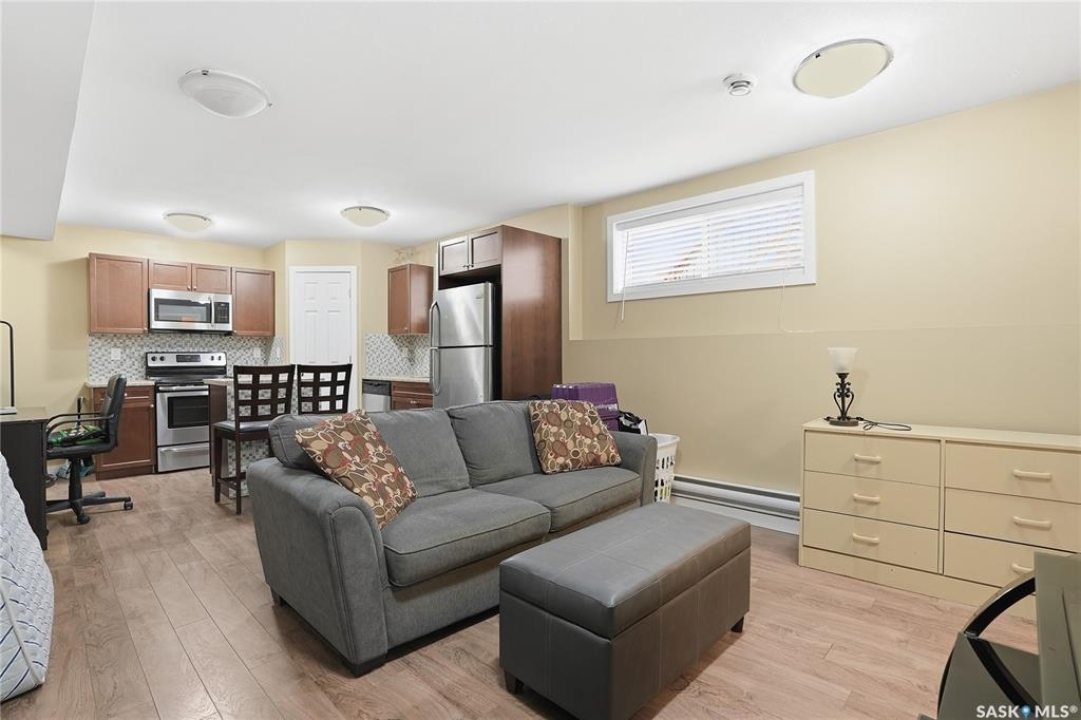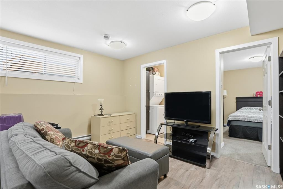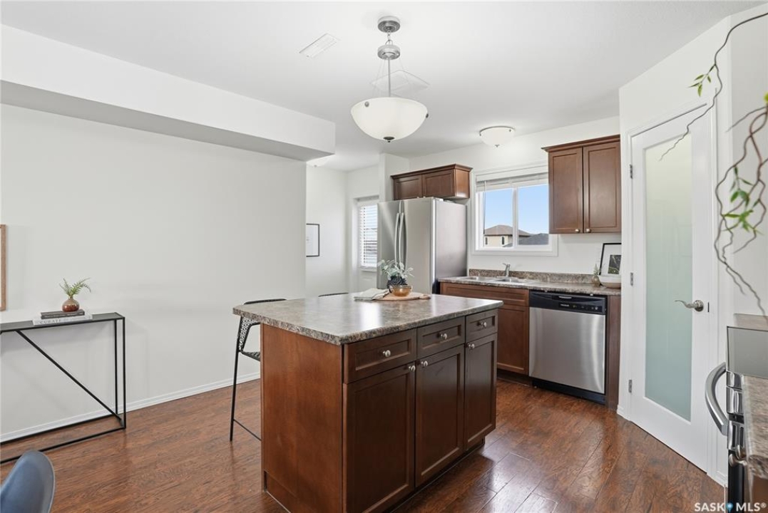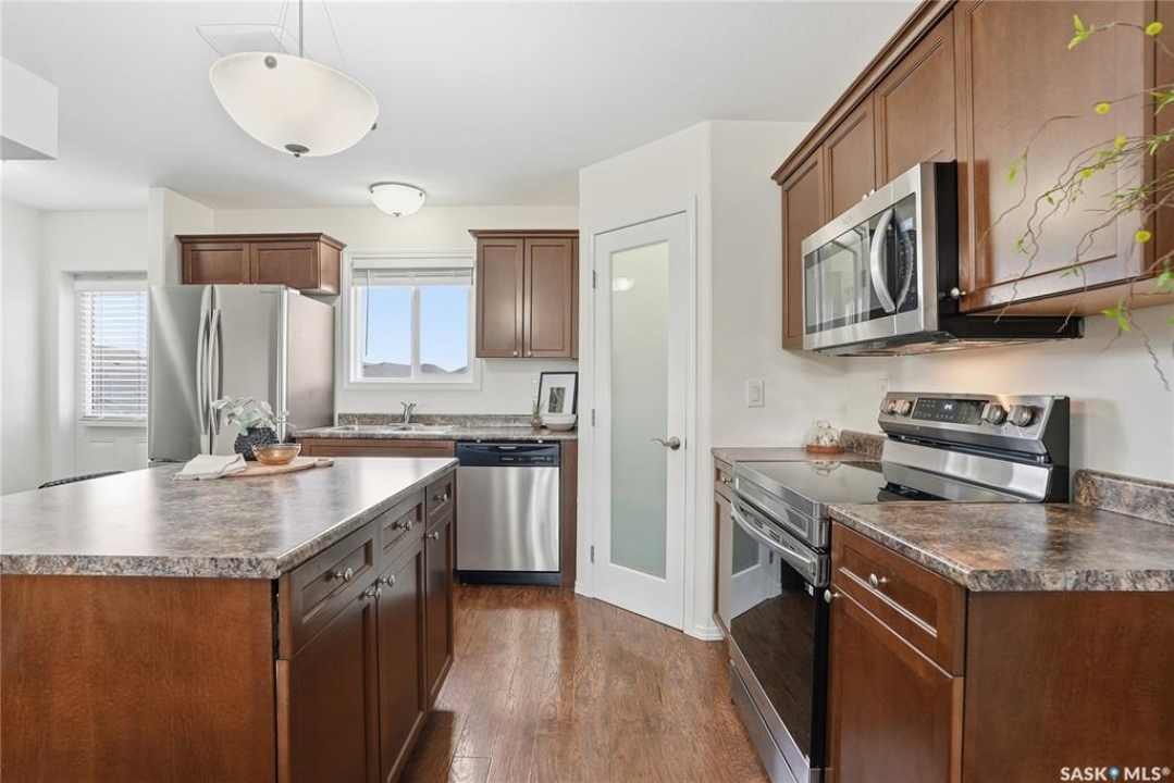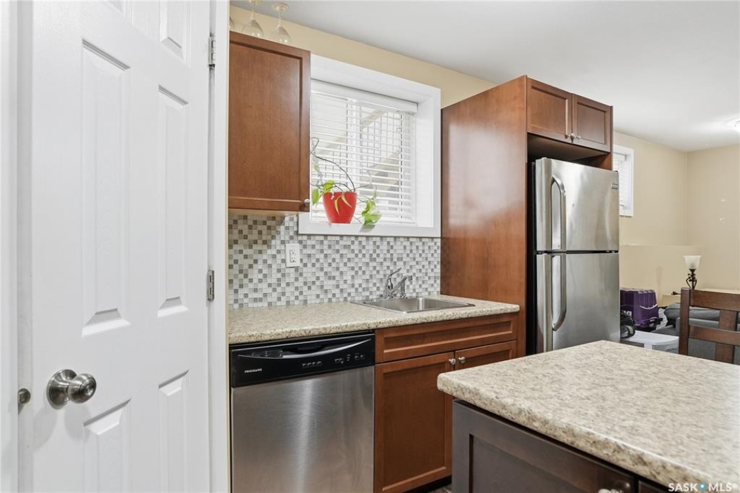 This beautifully maintained two-storey home offers an inviting blend of comfort, functionality, and charm. South-facing, it enjoys an abundance of natural light throughout the day. Ideally situated just one block from two elementary schools, the property features a welcoming front veranda overlooking the school fields—an ideal spot to enjoy your morning coffee while watching your children walk to school. The main floor showcases a bright, open-concept layout where the living room flows seamlessly into the dining area and spacious kitchen. The kitchen offers ample cabinetry, generous counter space, and a large pantry, making it perfect for family living and entertaining. A convenient half bath and utility room complete this level. Upstairs, the primary bedroom includes a four-piece ensuite and a walk-in closet. Two additional bedrooms, a second four-piece bathroom, and a laundry area provide excellent functionality for family needs. The basement features a spacious, legal one-bedroom suite with its own laundry, offering income potential or private accommodation for extended family. A good-sized two-car detached garage adds to the home's practicality. Located close to multiple parks, walking paths, and a variety of amenities, this property combines everyday convenience with a welcoming neighborhood atmosphere. Recent updates include a brand-new stove, microwave hood fan, and dishwasher within the past year, all-new carpeting on the second floor and stairs, and fresh paint throughout the main and upper levels.