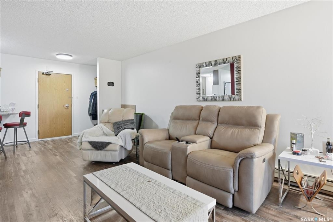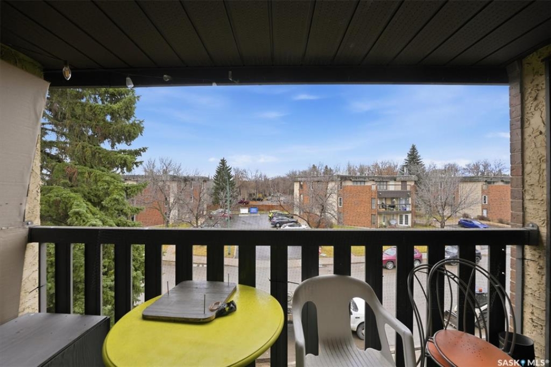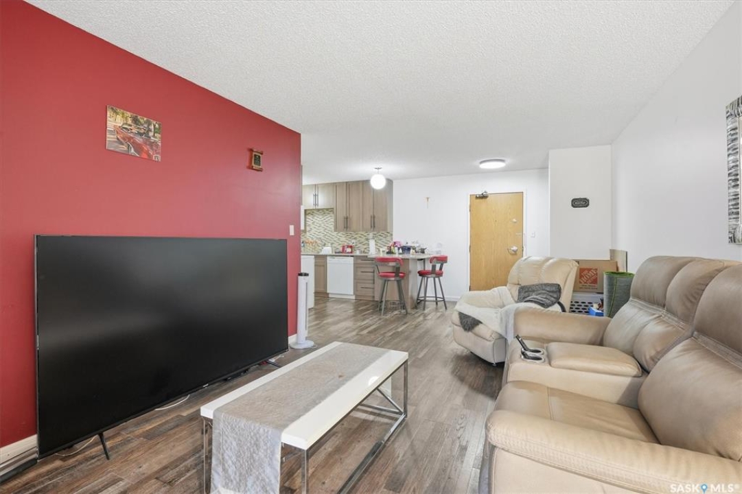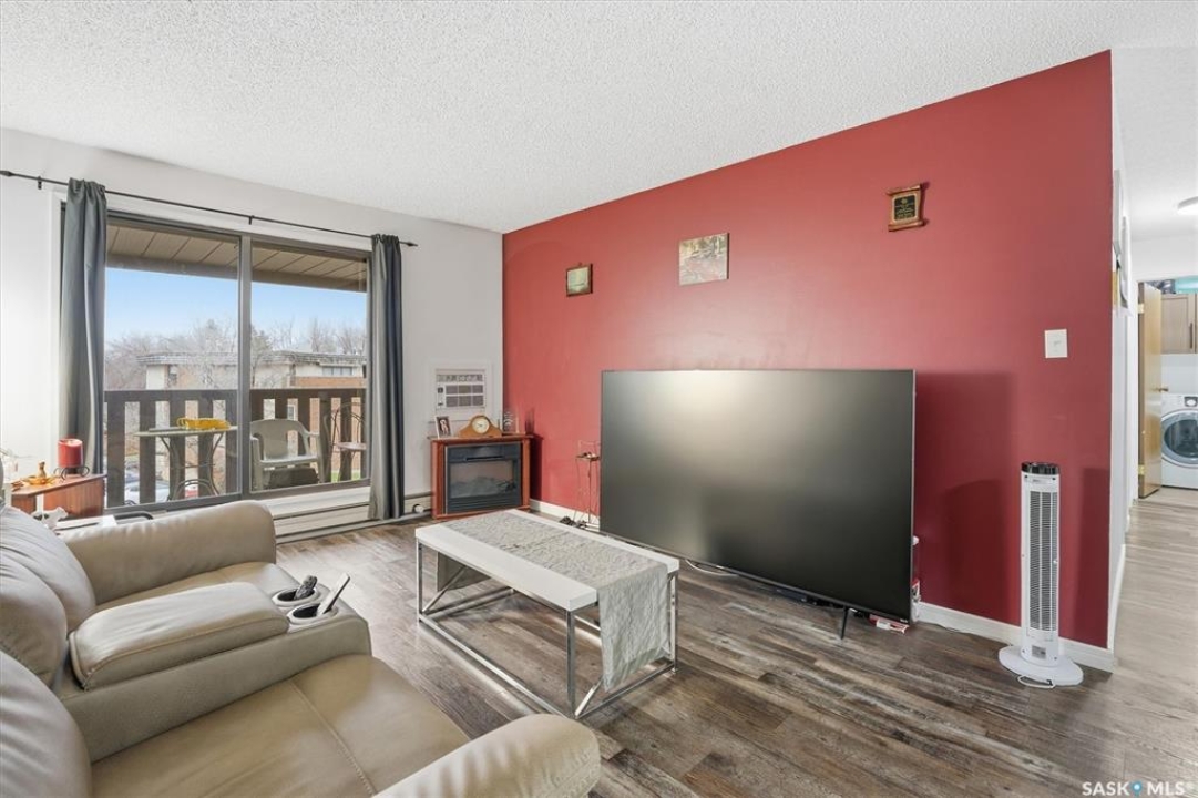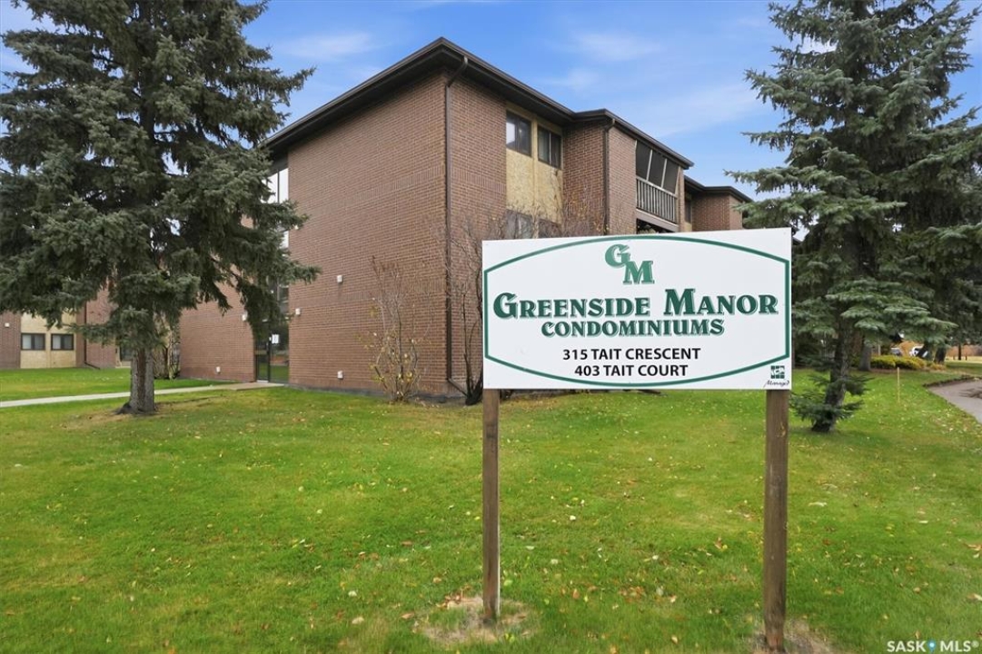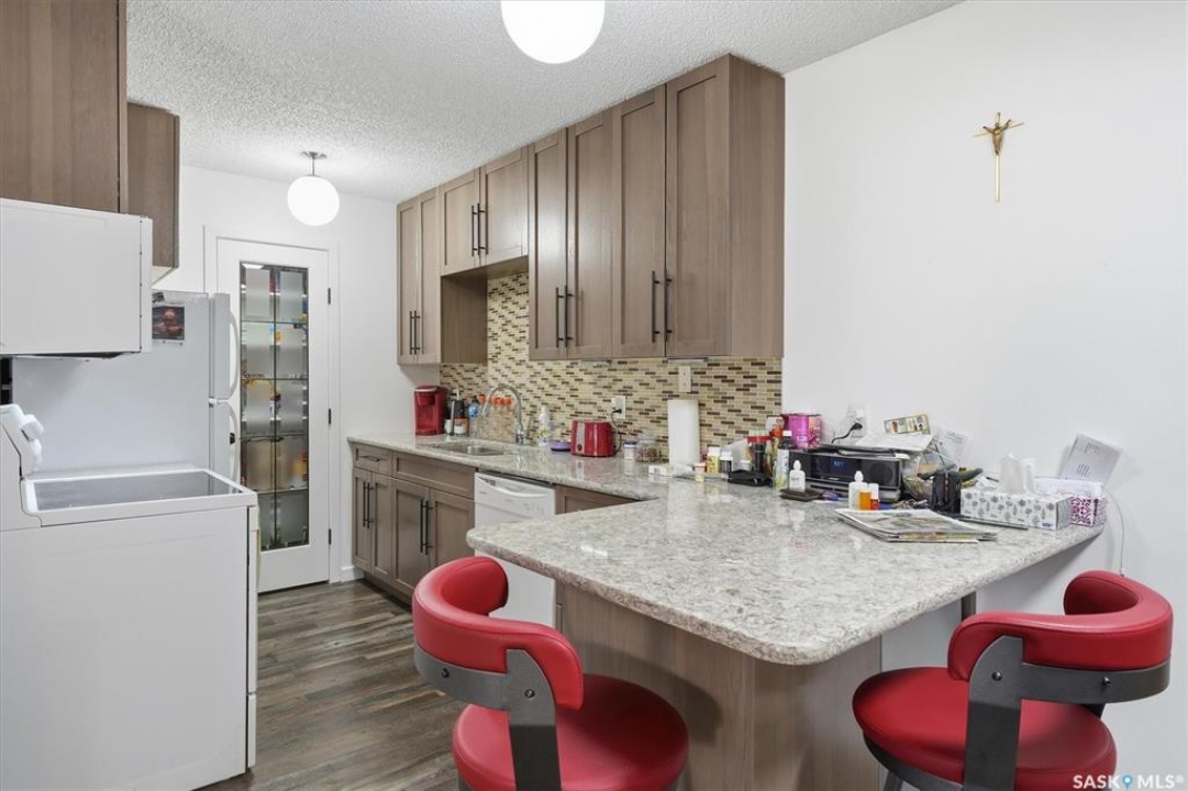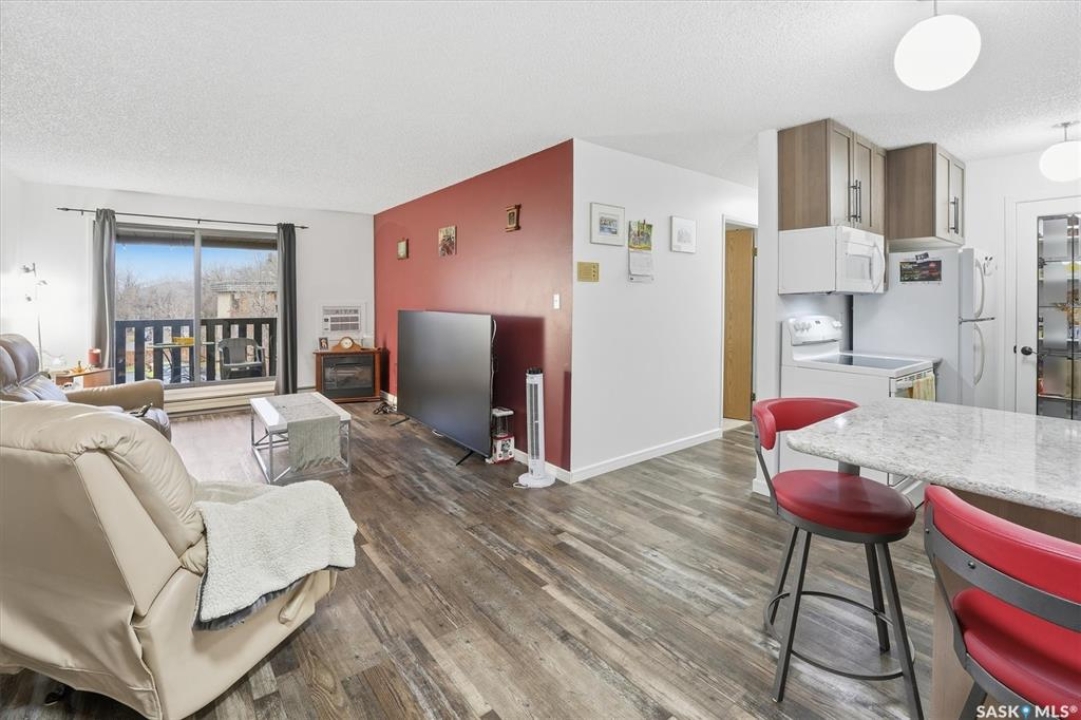 Welcome to #304 – 403 Tait Court, an affordable, renovated, and dog-friendly top-floor condo offering comfort, style, and incredible access to outdoor amenities. This 2-bedroom, 1-bathroom unit has been tastefully updated throughout and is move-in ready. The kitchen features granite countertops, modern cabinetry, a tiled backsplash, a pantry, and a functional eat-up peninsula island that opens to the main living space, making it ideal for everyday living and entertaining. Durable vinyl plank flooring runs throughout the main areas, while the updated bathroom and laundry area — complete with new cabinets and washer/dryer — add extra convenience and value. The spacious top-floor setting offers quiet living and natural light, and the private balcony includes extra storage. This condo is perfectly situated next to a large park offering walking paths, a civic centre, library, tennis courts, golf course, and BMX trails — perfect for those with an active lifestyle or small pet. The building allows one small dog (under 20 lbs) or cat, making it a rare find for pet owners in this price range. You'll also enjoy easy access to transit, as well as the shopping, dining, and services along 8th Street. One surface parking stall is included, and condo fees cover water and heat, keeping your monthly costs low. Whether you're a first-time buyer, downsizer, or student looking for a low-maintenance lifestyle in a fantastic location, this condo checks all the boxes.