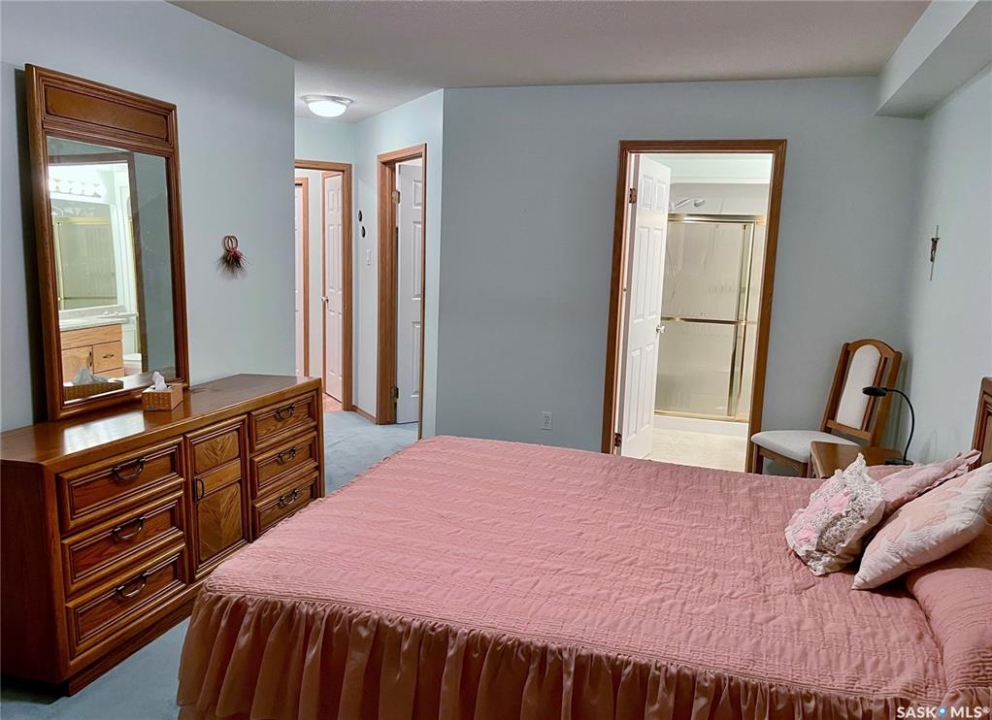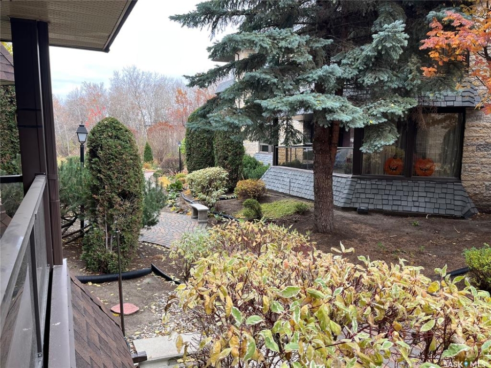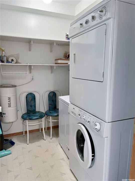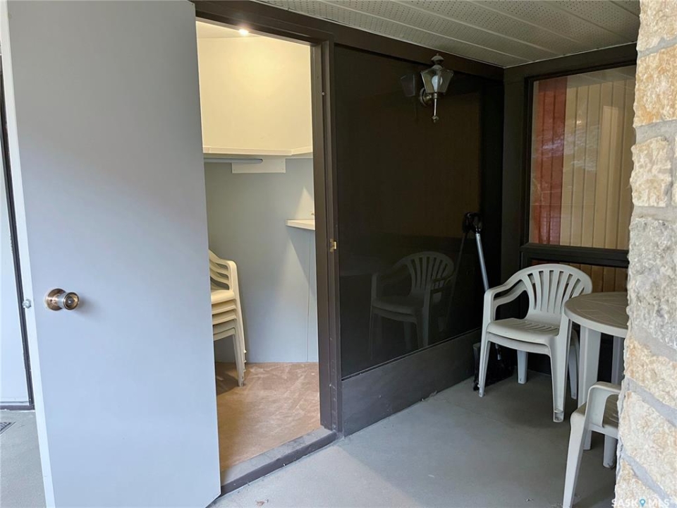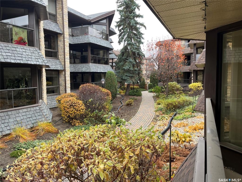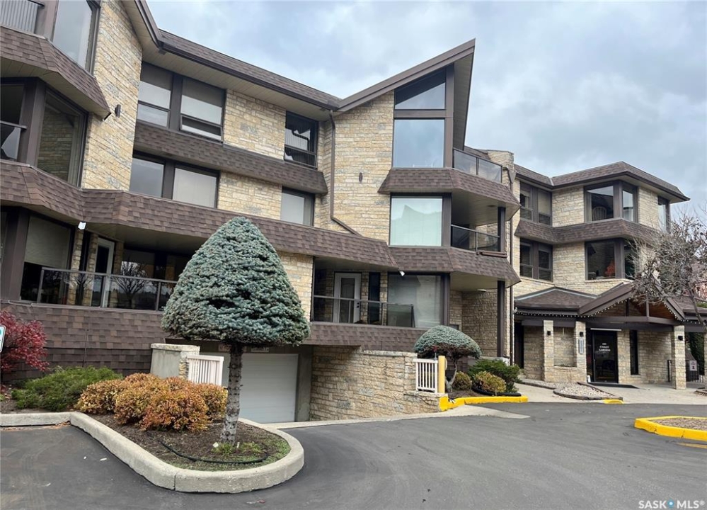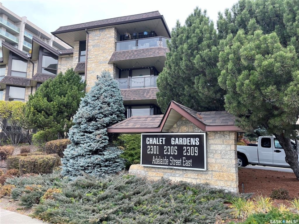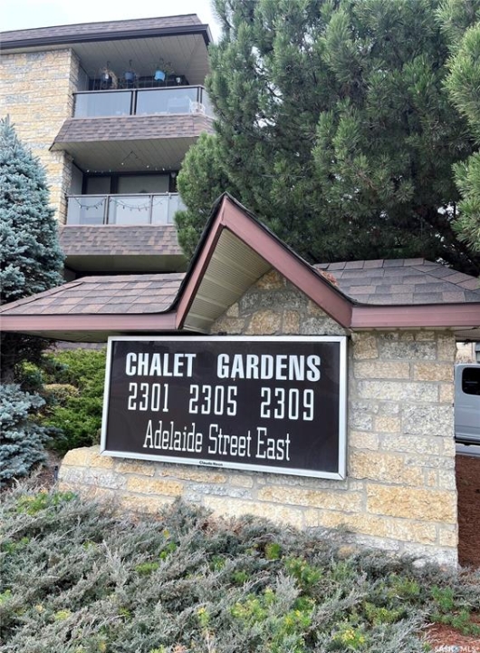 Enjoy the convenient location of Chalet Gardens with Market Mall across the street, and all the amenities if has to offer. This well cared for condo features 1,250 sq ft of living space, two bedrooms, two bathrooms and a large living room/dining room area. The spacious primary bedroom features a large walk-in closet and large shower with seat in tub. The kitchen includes all appliances and has room for table and chairs. Enjoy in-suite laundry, central air conditioning, and new intercom system monitoring front door. The large east facing balcony includes extra storage space with shelving. The building includes underground parking, stall #56, with storage space and a wash bay for your vehicle. Also included is a large amenities room, elevator, woodworking shop and RV parking. The manicured grounds feature an abundance of mature trees and shrubs making this a beautiful place to call home.