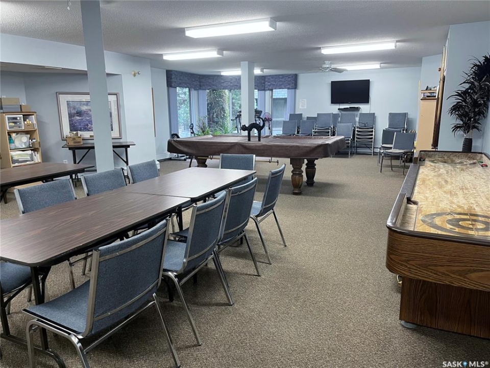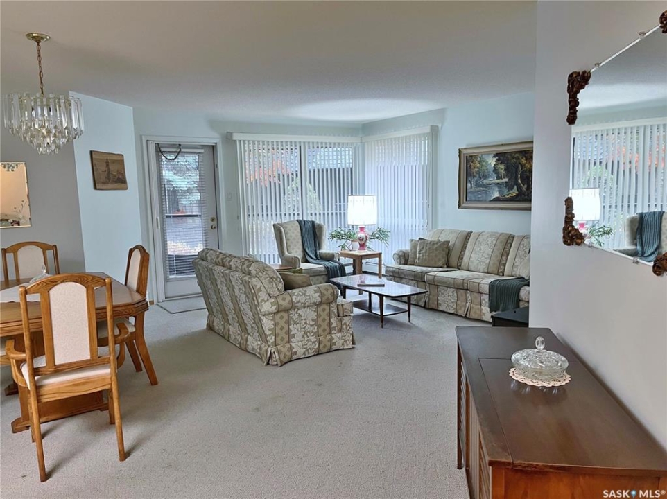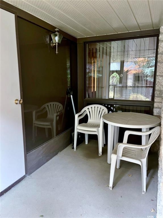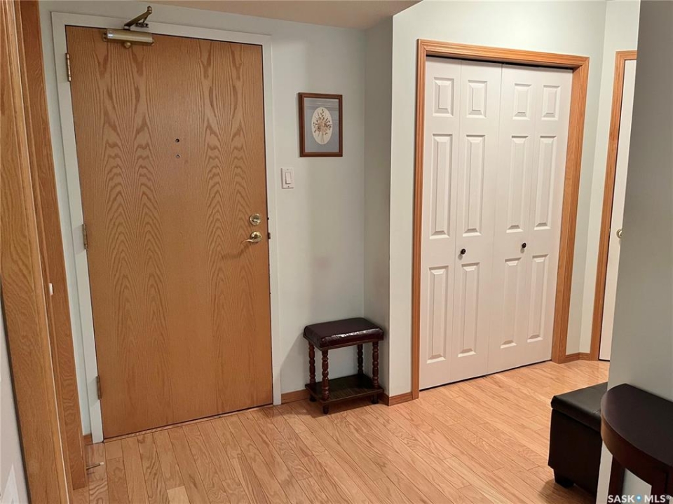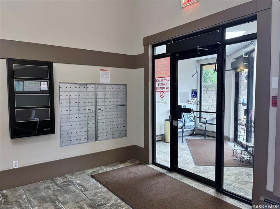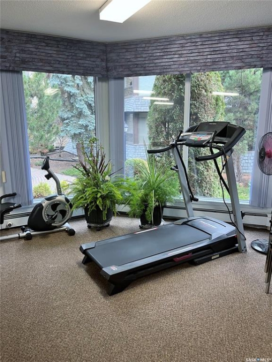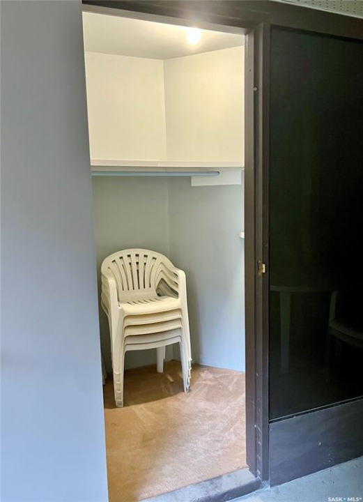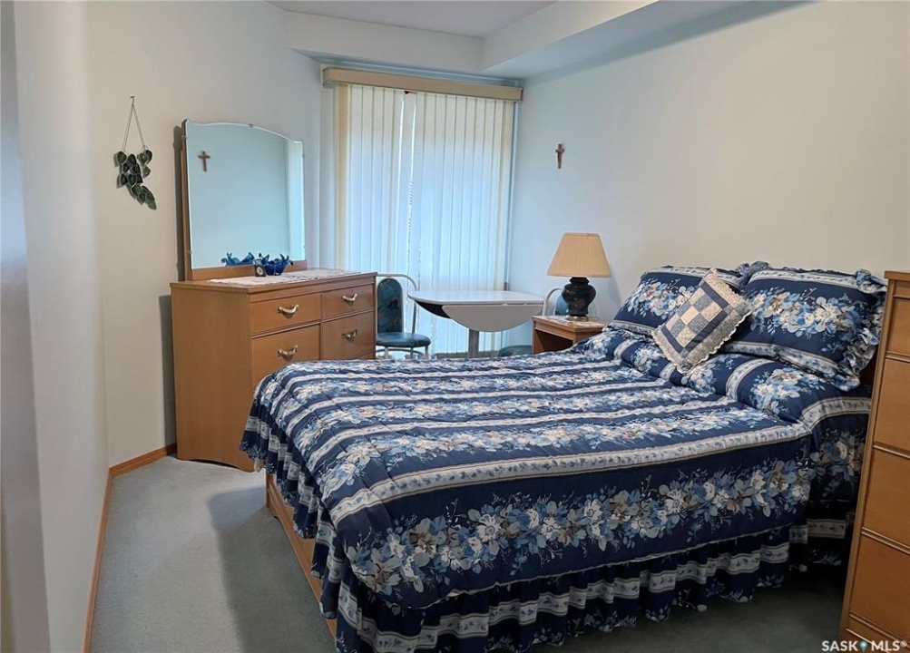 Enjoy the convenient location of Chalet Gardens with Market Mall across the street, and all the amenities if has to offer. This well cared for condo features 1,250 sq ft of living space, two bedrooms, two bathrooms and a large living room/dining room area. The spacious primary bedroom features a large walk-in closet and large shower with seat in tub. The kitchen includes all appliances and has room for table and chairs. Enjoy in-suite laundry, central air conditioning, and new intercom system monitoring front door. The large east facing balcony includes extra storage space with shelving. The building includes underground parking, stall #56, with storage space and a wash bay for your vehicle. Also included is a large amenities room, elevator, woodworking shop and RV parking. The manicured grounds feature an abundance of mature trees and shrubs making this a beautiful place to call home.