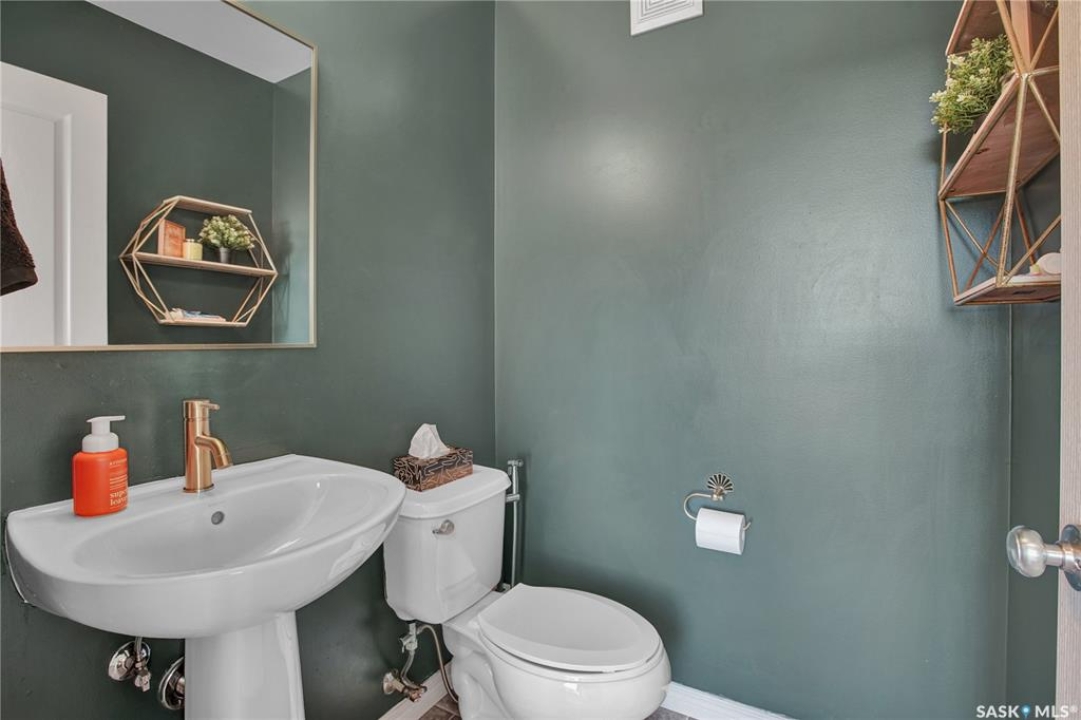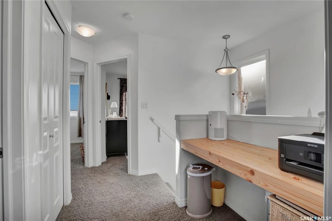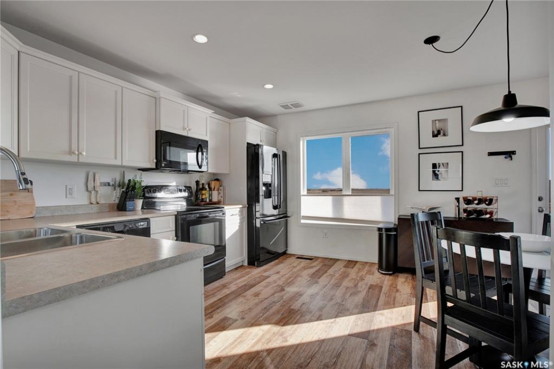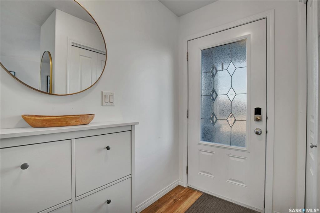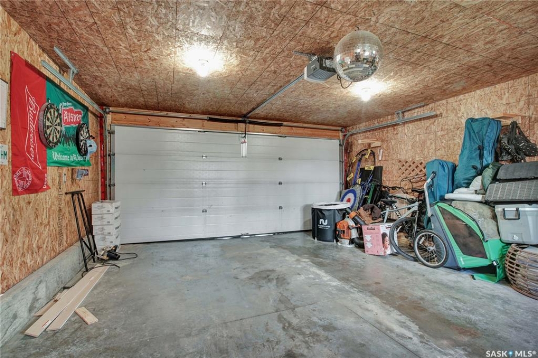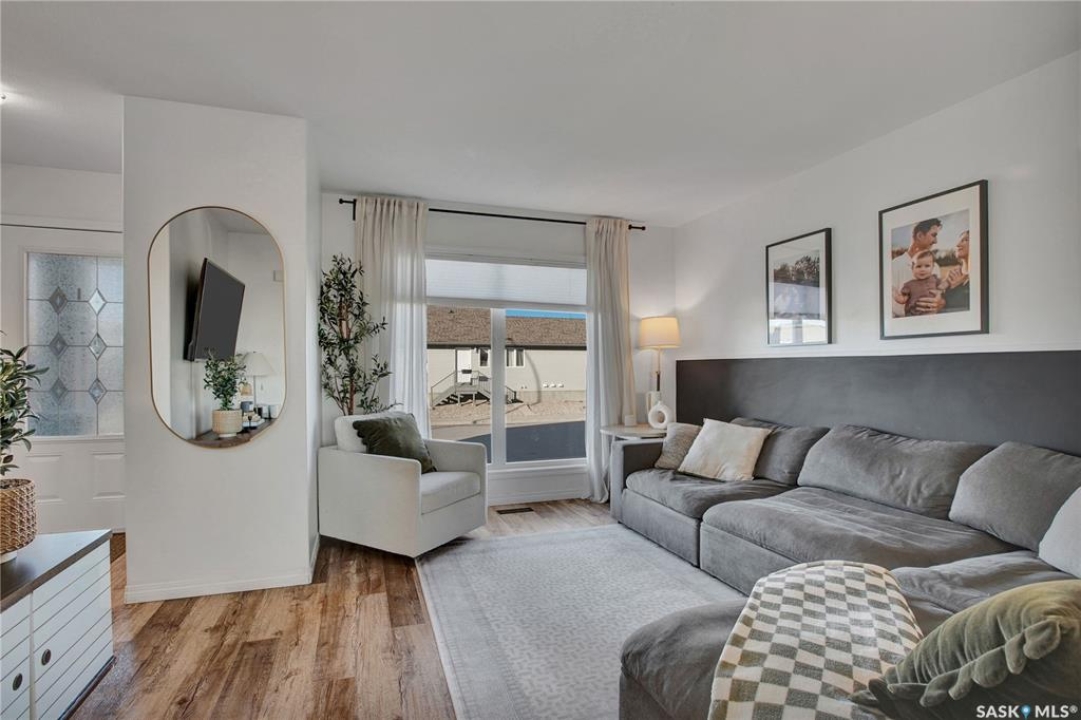 Nestled at the end of a quiet crescent with no neighbours behind, this charming two-storey home is filled with pride of ownership and natural light from every angle. Step inside to a bright, inviting main floor featuring a comfortable living room, a convenient two-piece powder room, and an open kitchen and dining area. There is new flooring and moderns finishes including updated light fixtures and tasteful feature walls. The back of home leads you to the back deck and patio—perfect for relaxing mornings or evening BBQs. Upstairs, you'll find three bedrooms, a full four-piece bath, and the primary bedroom has double closets for extra space and organization. The finished basement adds even more versatility, offering an open living area ideal for a family room, play space, or home gym. It's also plumbed for a future third bathroom and includes laundry and extra storage under the stairs. Outside, enjoy a fully fenced backyard with a deck, patio, and walkway, plus underground sprinklers in the front yard to keep things low-maintenance. The double detached garage is insulated and boarded, equipped with shelving, a workbench, and comfortably fits both a truck and SUV. A rear alley gate provides additional parking or space for your boat, trailer, or RV. Whether you're a first-time buyer, a young couple, or a growing family, this home checks all the boxes for comfortable, practical, and affordable living in Martensville