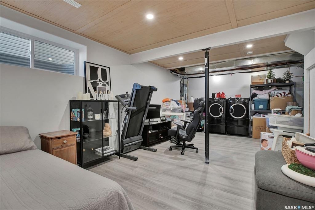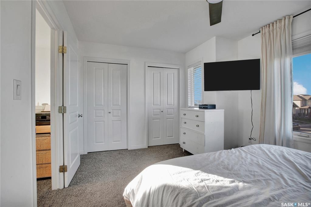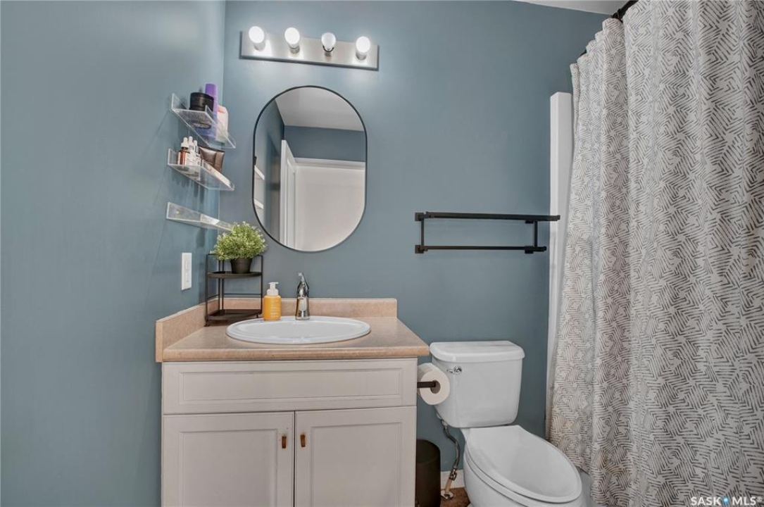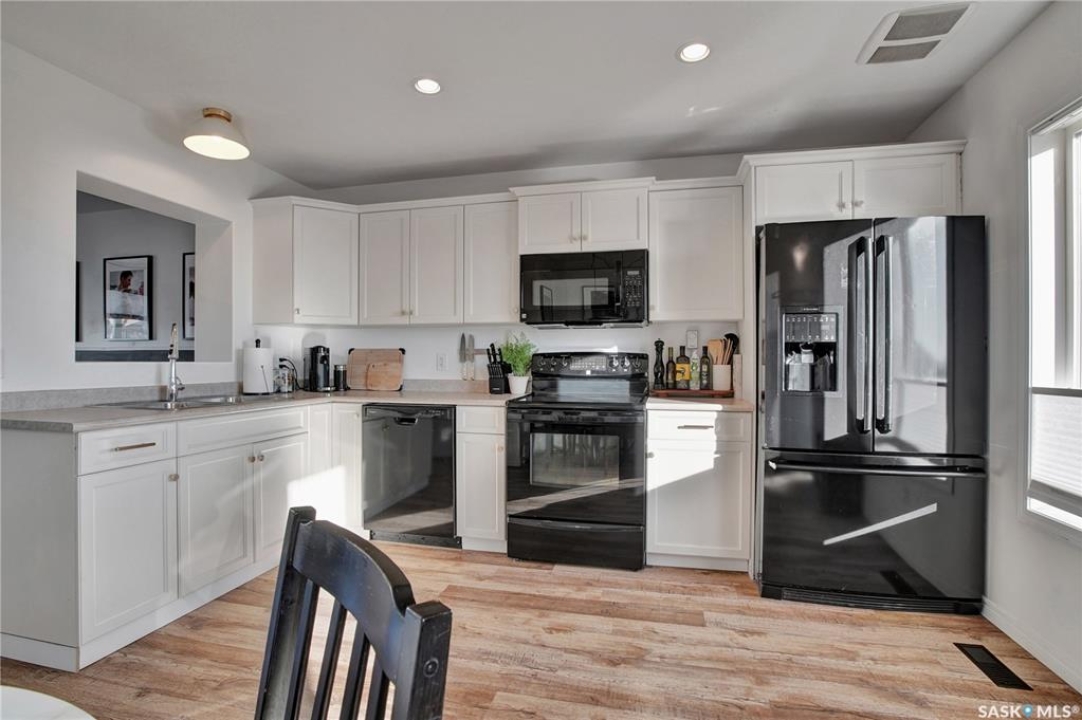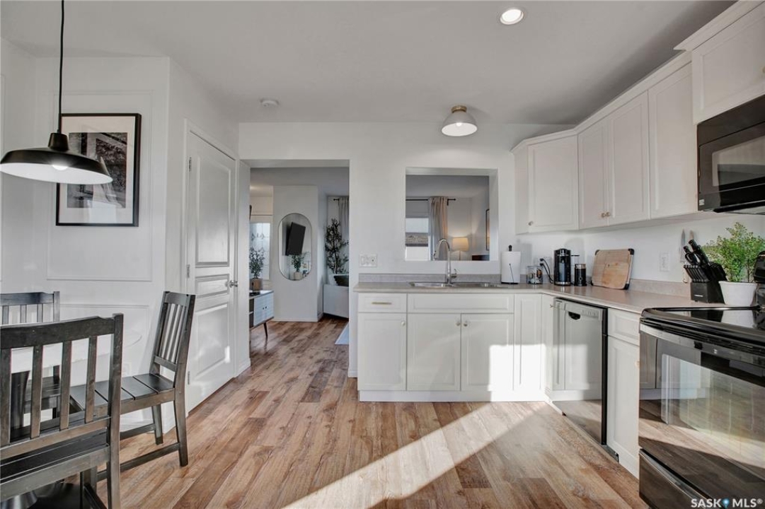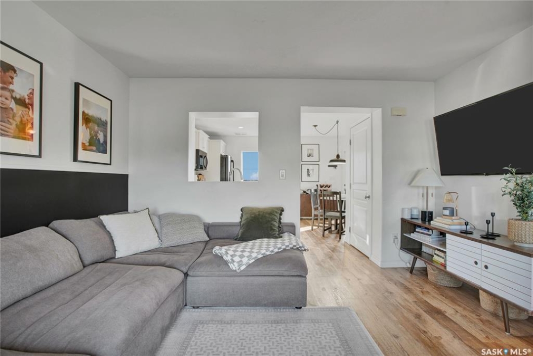 Nestled at the end of a quiet crescent with no neighbours behind, this charming two-storey home is filled with pride of ownership and natural light from every angle. Step inside to a bright, inviting main floor featuring a comfortable living room, a convenient two-piece powder room, and an open kitchen and dining area. There is new flooring and moderns finishes including updated light fixtures and tasteful feature walls. The back of home leads you to the back deck and patio—perfect for relaxing mornings or evening BBQs. Upstairs, you'll find three bedrooms, a full four-piece bath, and the primary bedroom has double closets for extra space and organization. The finished basement adds even more versatility, offering an open living area ideal for a family room, play space, or home gym. It's also plumbed for a future third bathroom and includes laundry and extra storage under the stairs. Outside, enjoy a fully fenced backyard with a deck, patio, and walkway, plus underground sprinklers in the front yard to keep things low-maintenance. The double detached garage is insulated and boarded, equipped with shelving, a workbench, and comfortably fits both a truck and SUV. A rear alley gate provides additional parking or space for your boat, trailer, or RV. Whether you're a first-time buyer, a young couple, or a growing family, this home checks all the boxes for comfortable, practical, and affordable living in Martensville