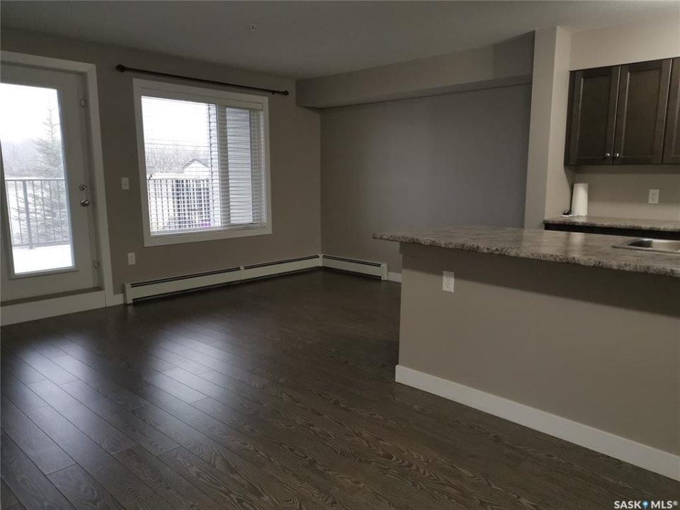 Main Floor North East facing 907 sq.ft. condo!! This unit features 2 bedroom and 2 bathroom. A walk in closet and full bathroom are located in the master bedroom. Entering the condo you're greeted with an open concept layout Kitchen, Dining room and living room with Laminate flooring. Kitchen with large island with seating for 3, plenty of cupboards, appliance package. This unit also has ensuite laundry. One added bonus with this unit is the added space on the balcony. One underground parking stall is included. Call to view!!